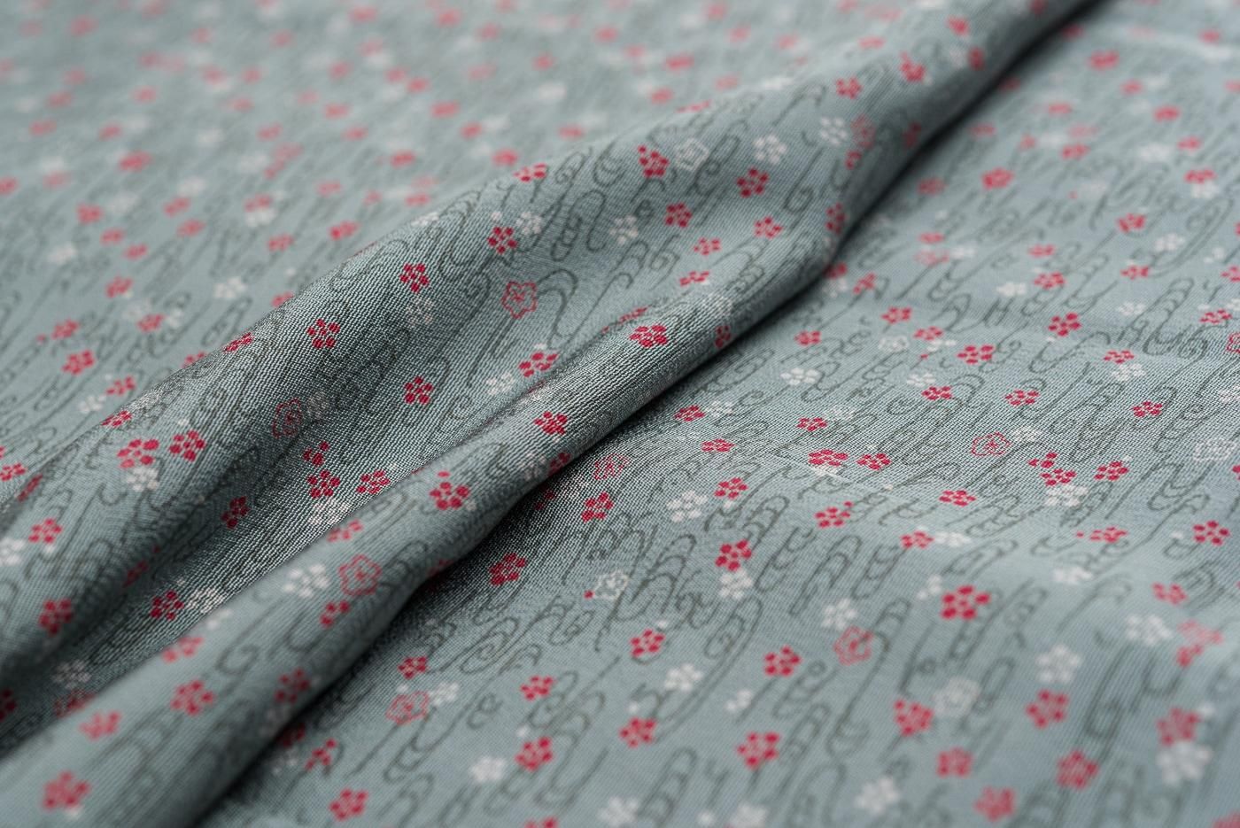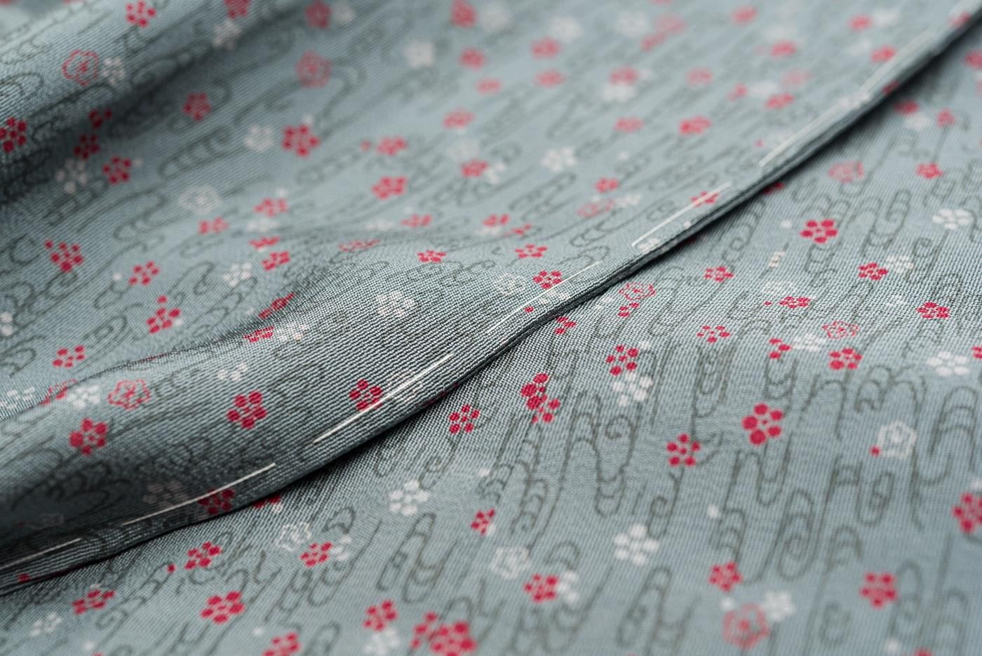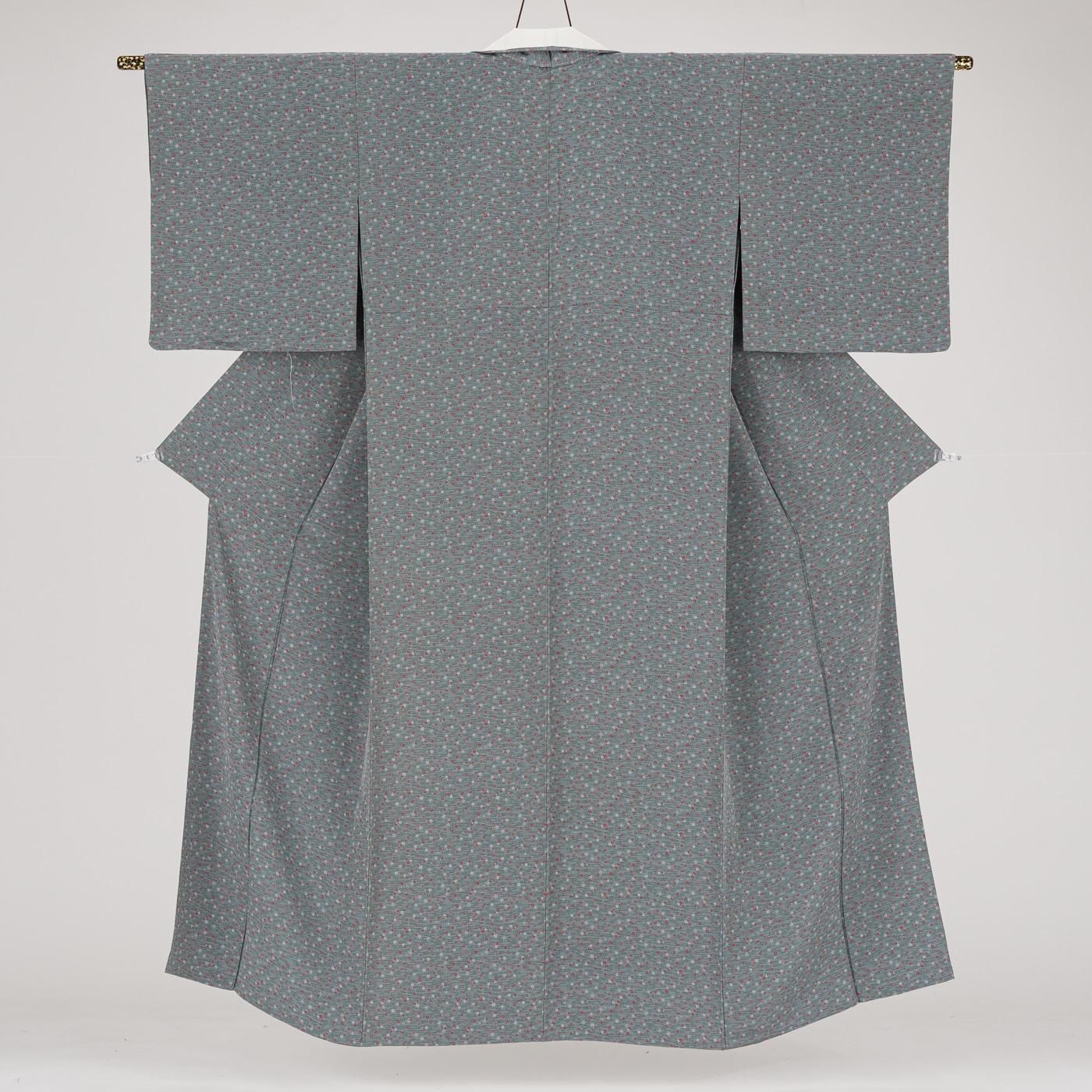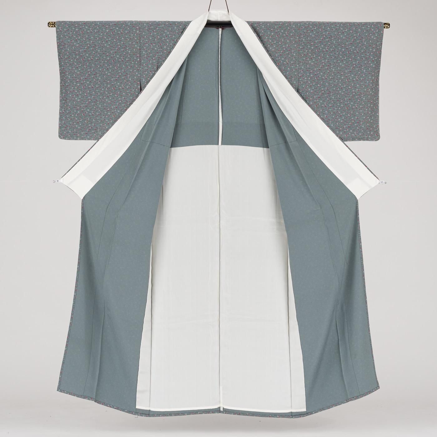 落ち着いたグレーの地に流水と紅白の小花を染めた単衣の小紋です。