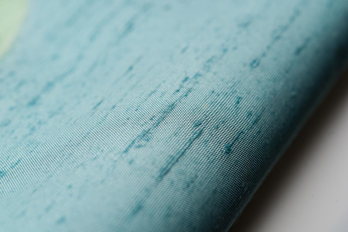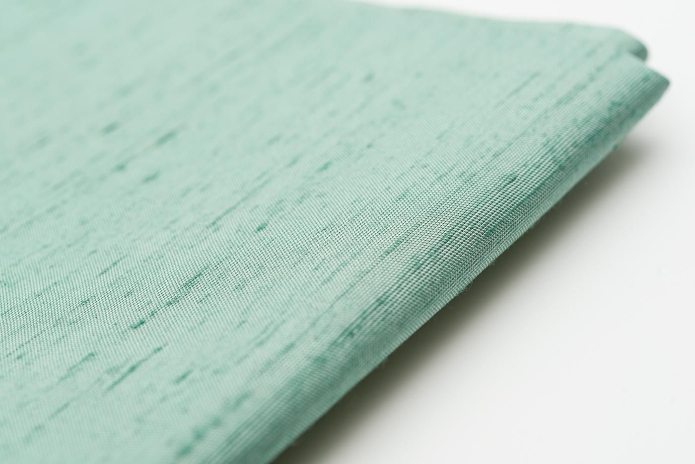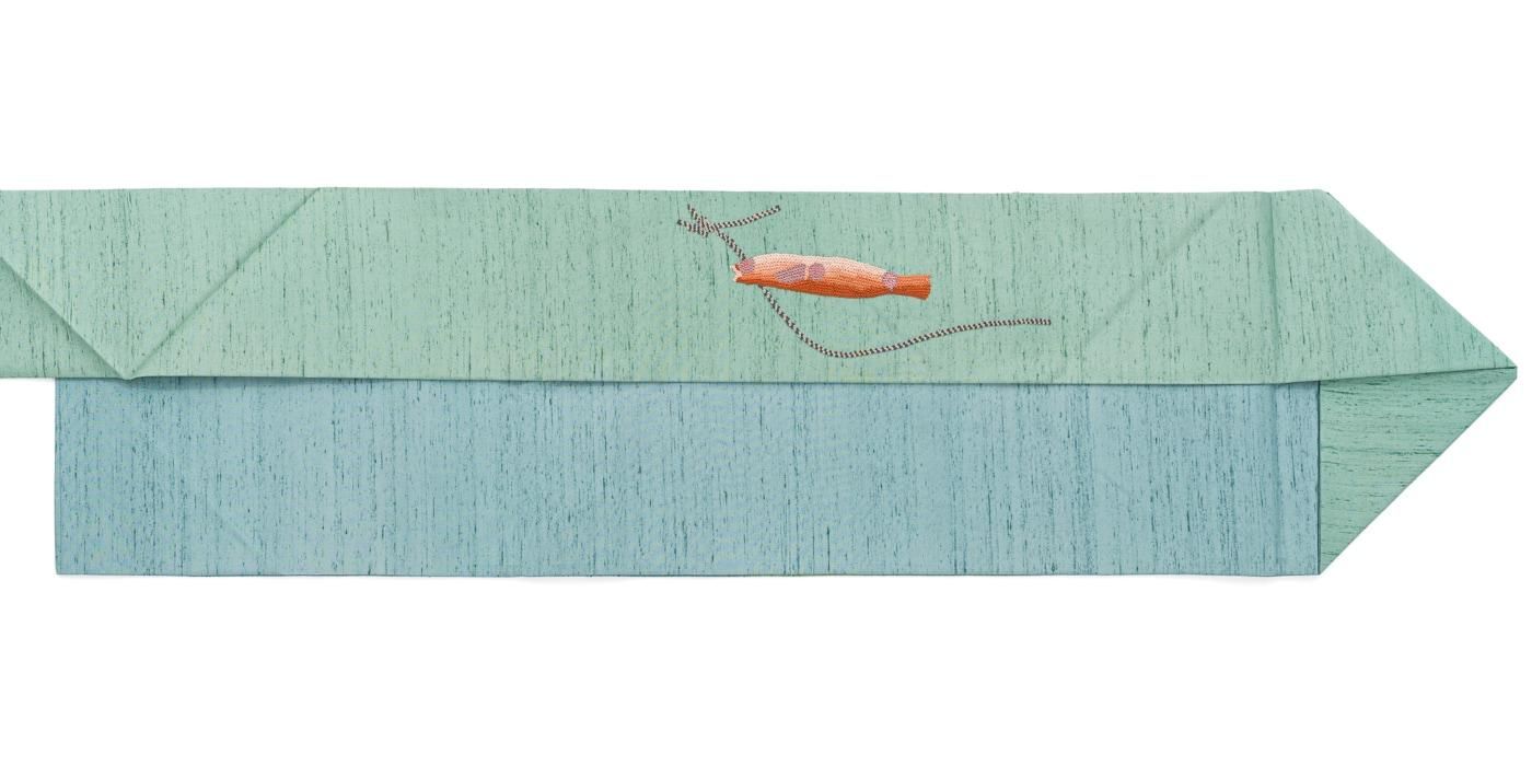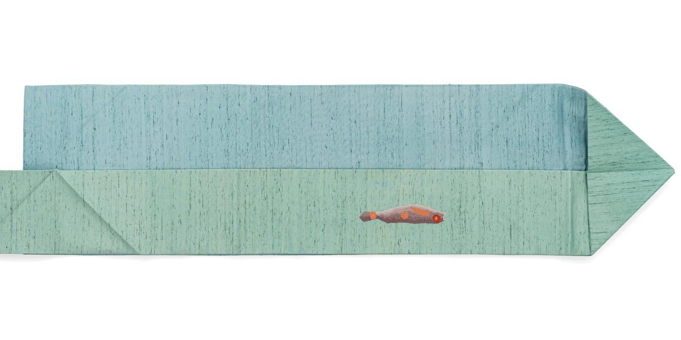青緑のグラデーションがさわやかな紬地に三匹の魚を刺繍した九寸名古屋帯です。