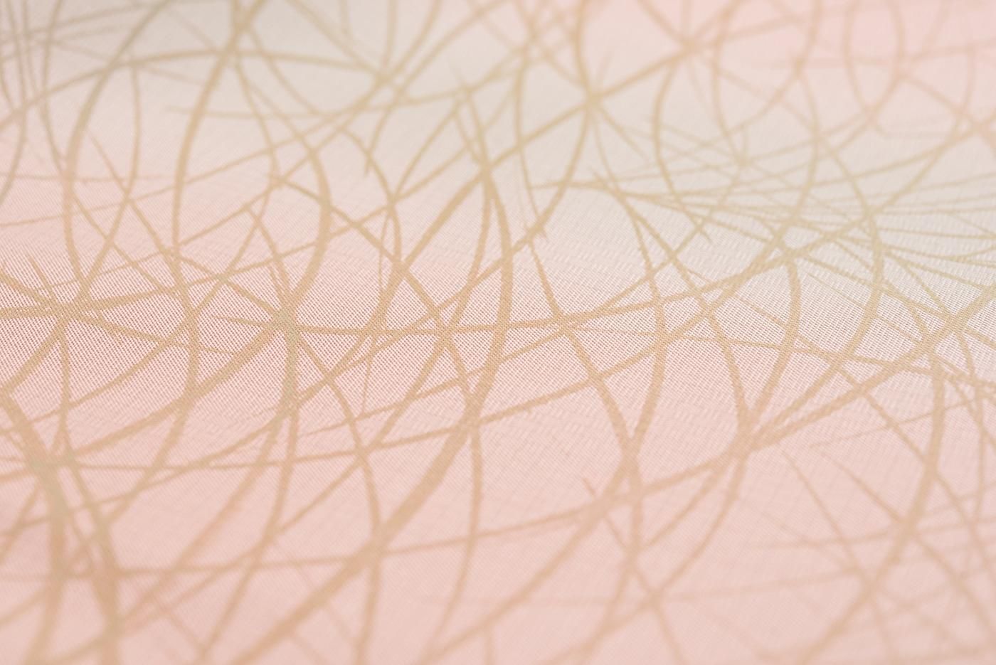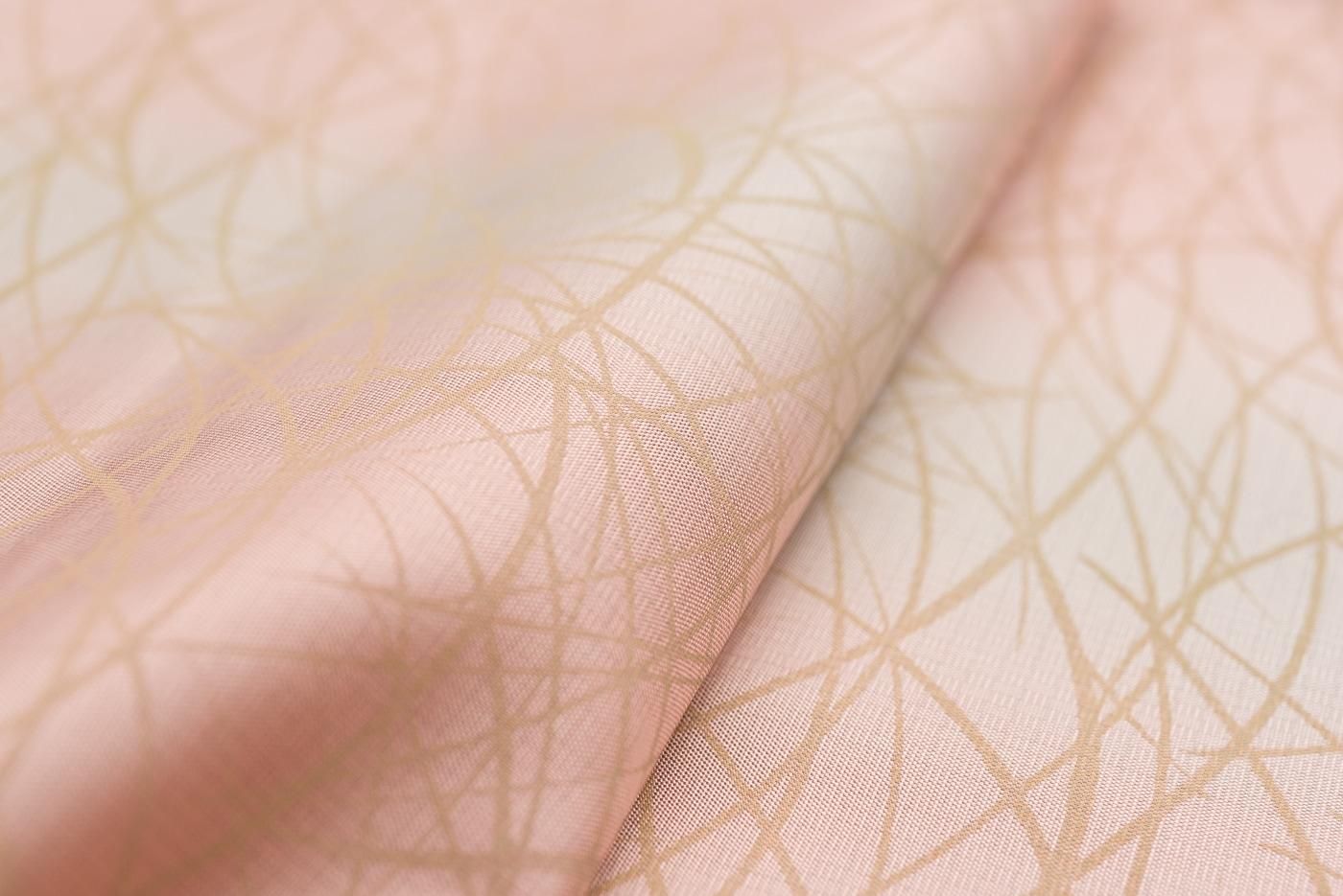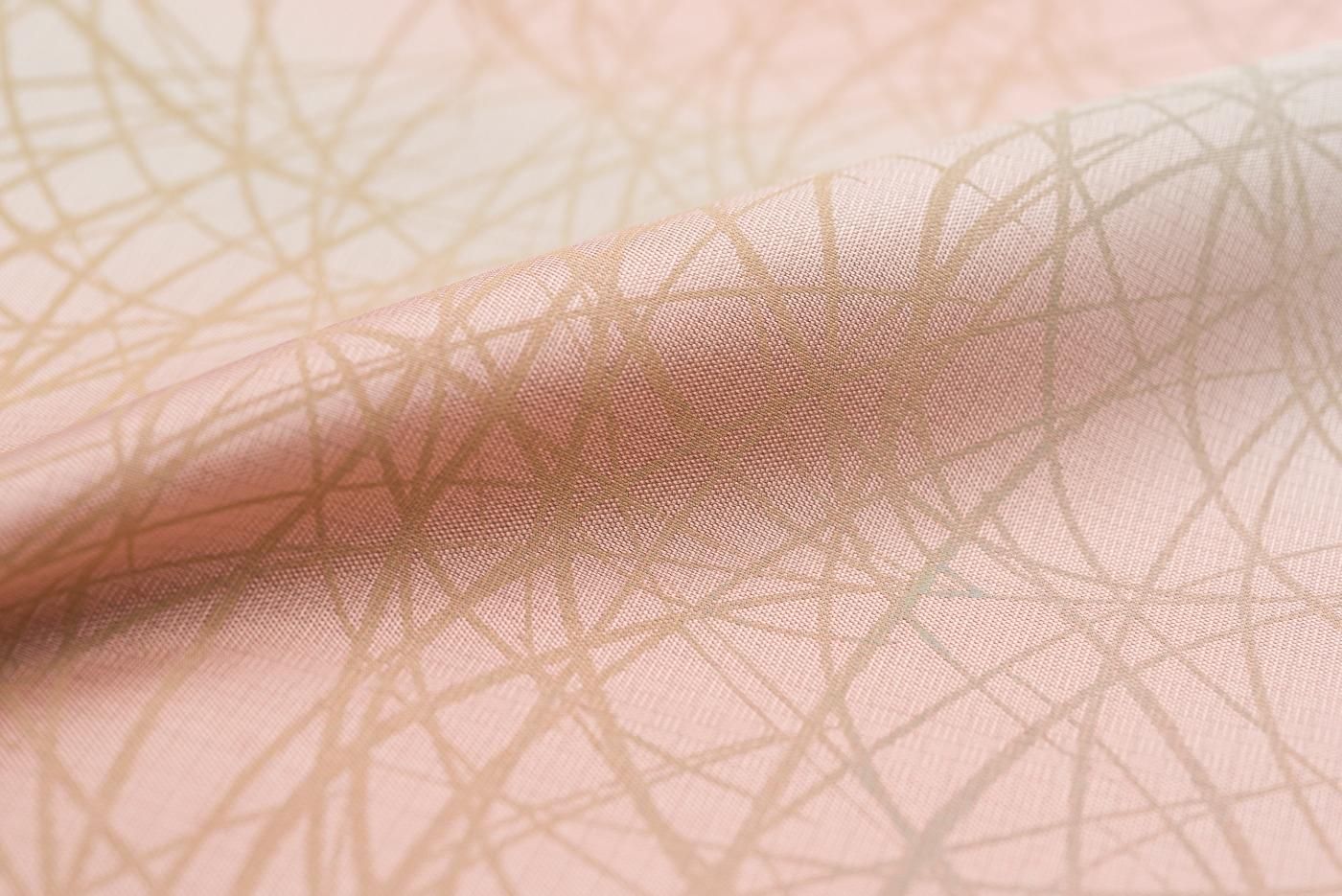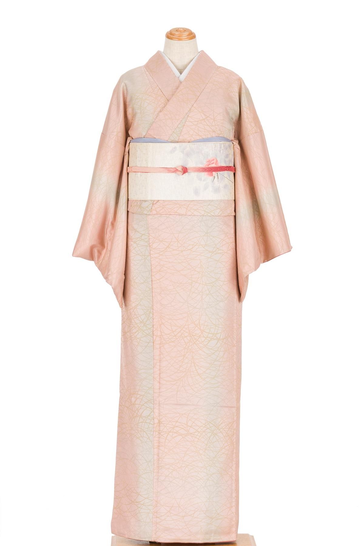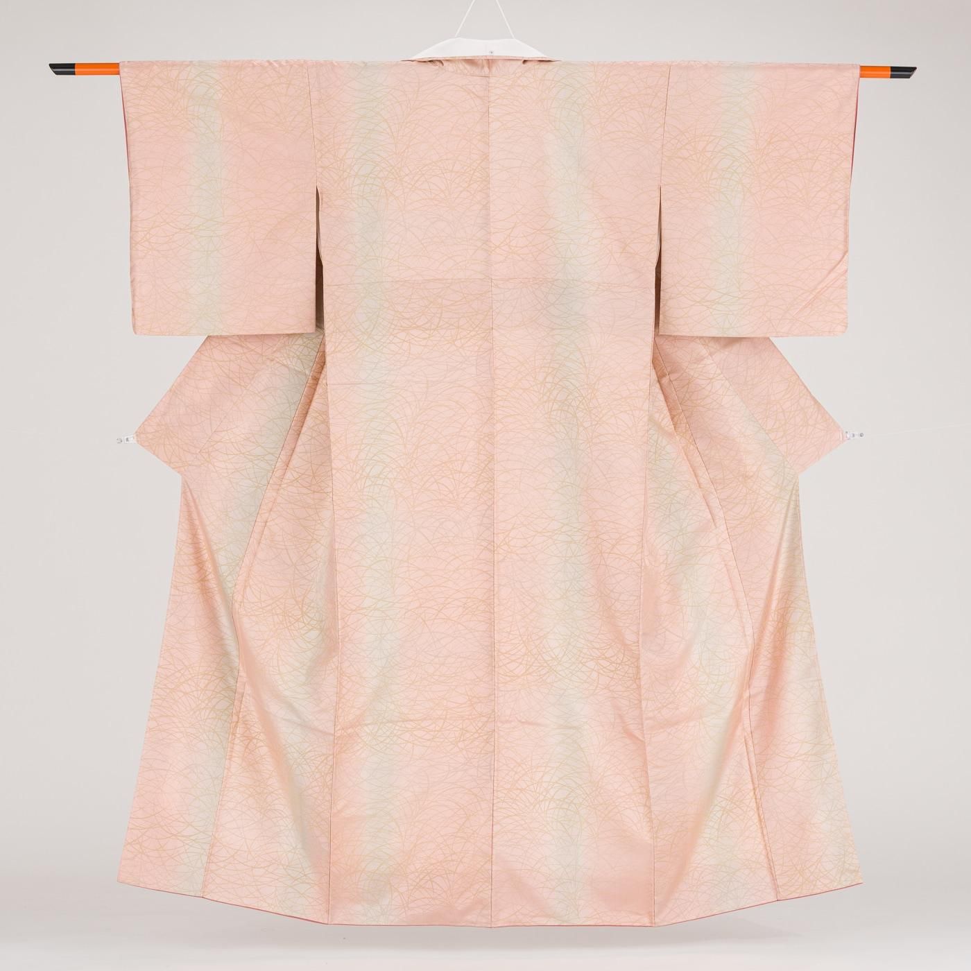 薄ピンクとグレーの縦暈しに重なる草葉を染めた大島紬の着物です。