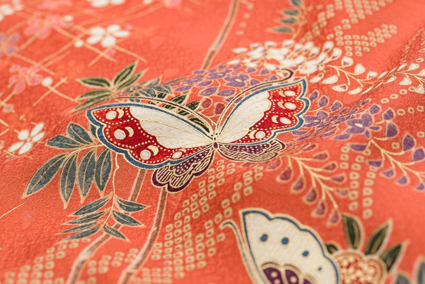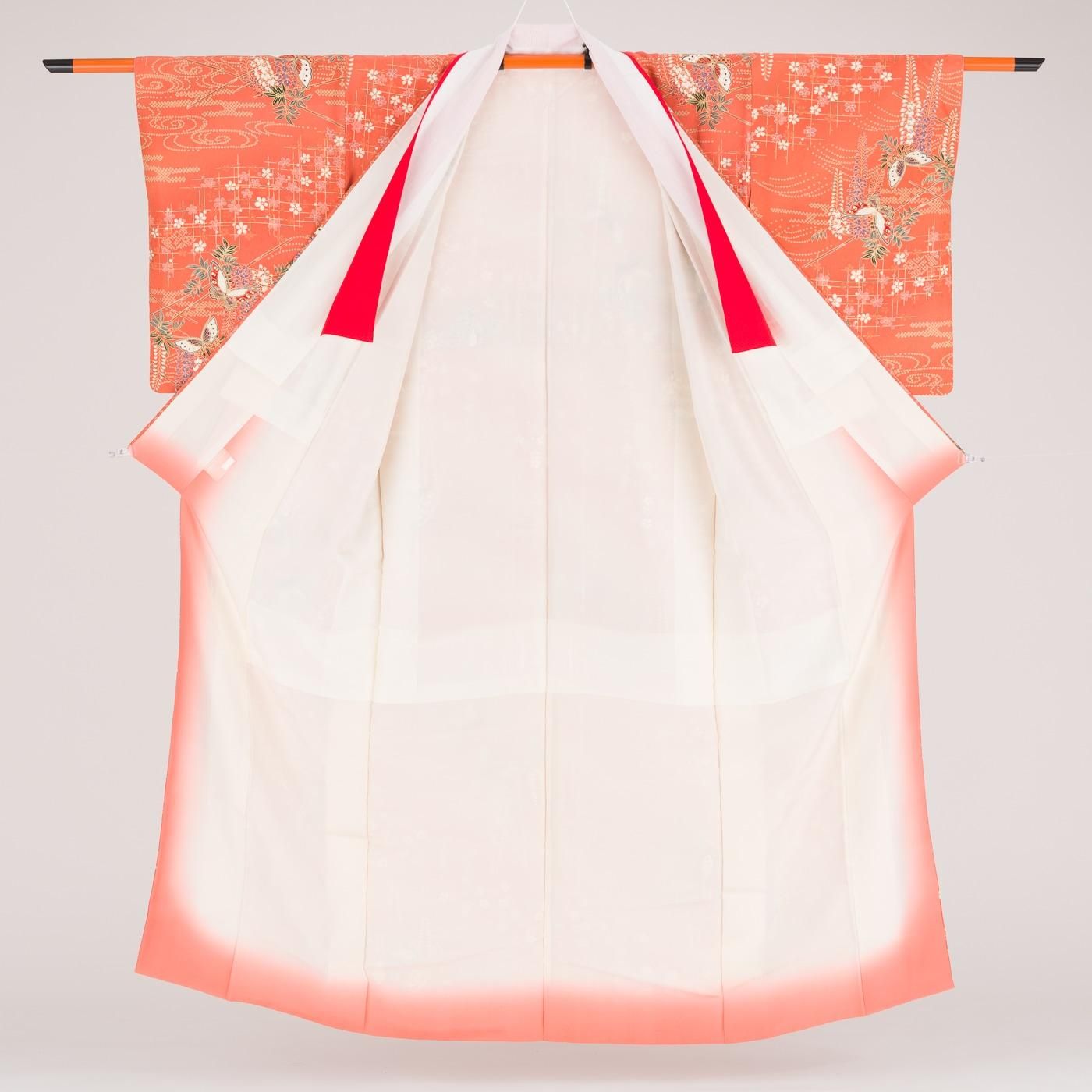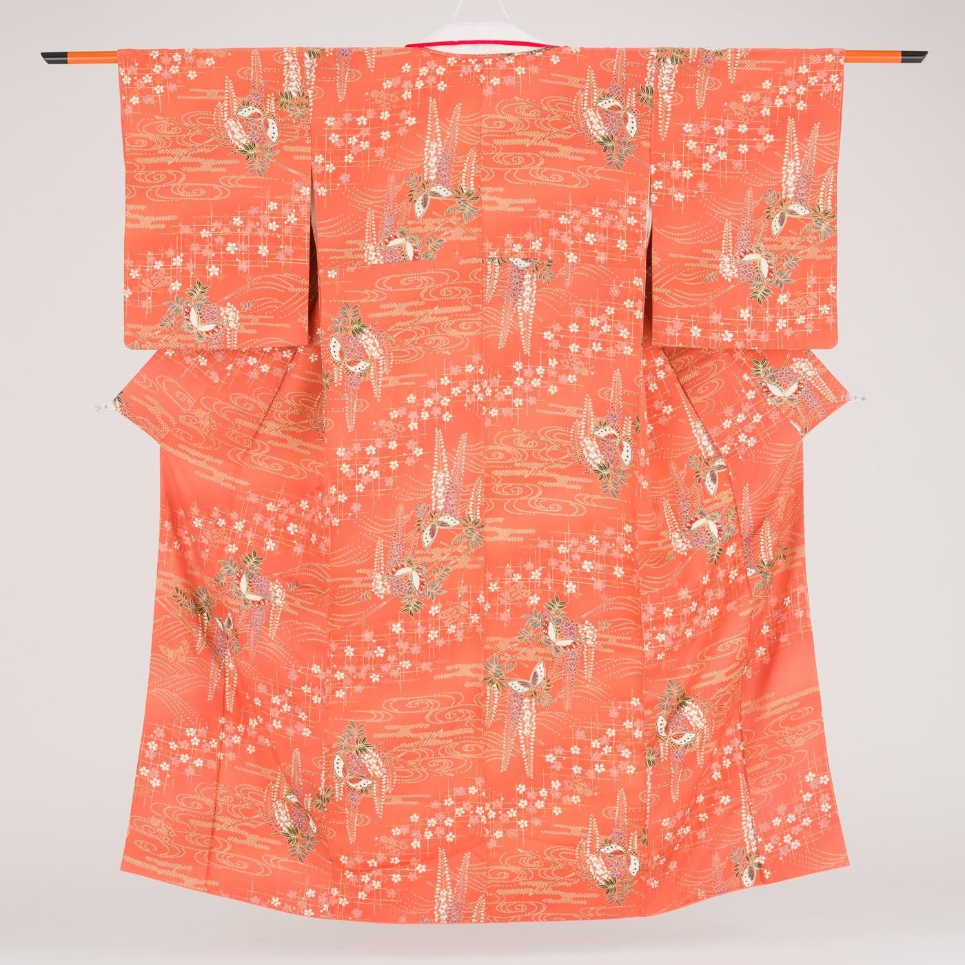 鮭色の地に藤と蝶々を染めた小紋の着物です。