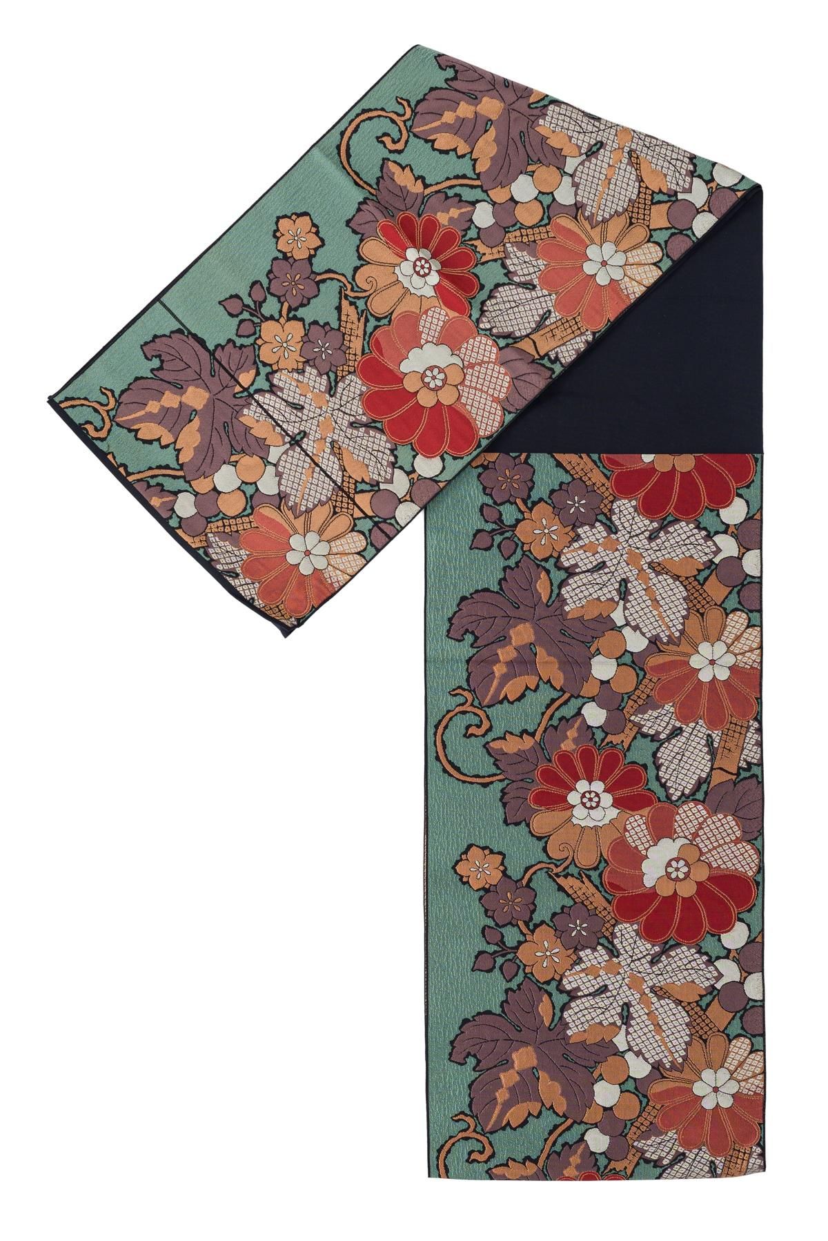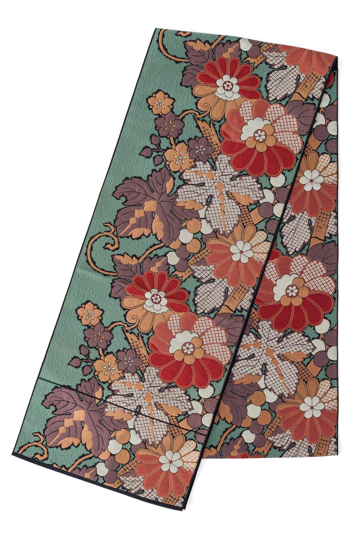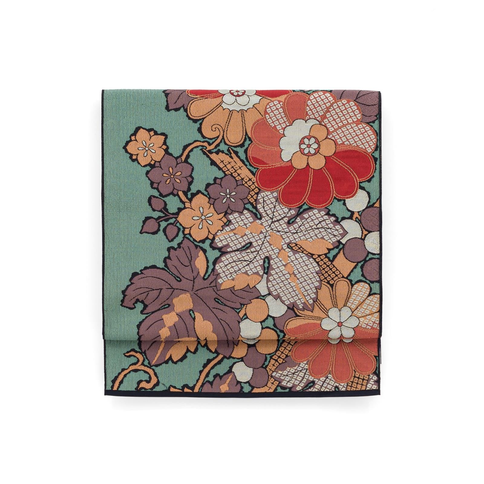 菊や桜などの花と葡萄の実を織り出した八寸名古屋帯です。