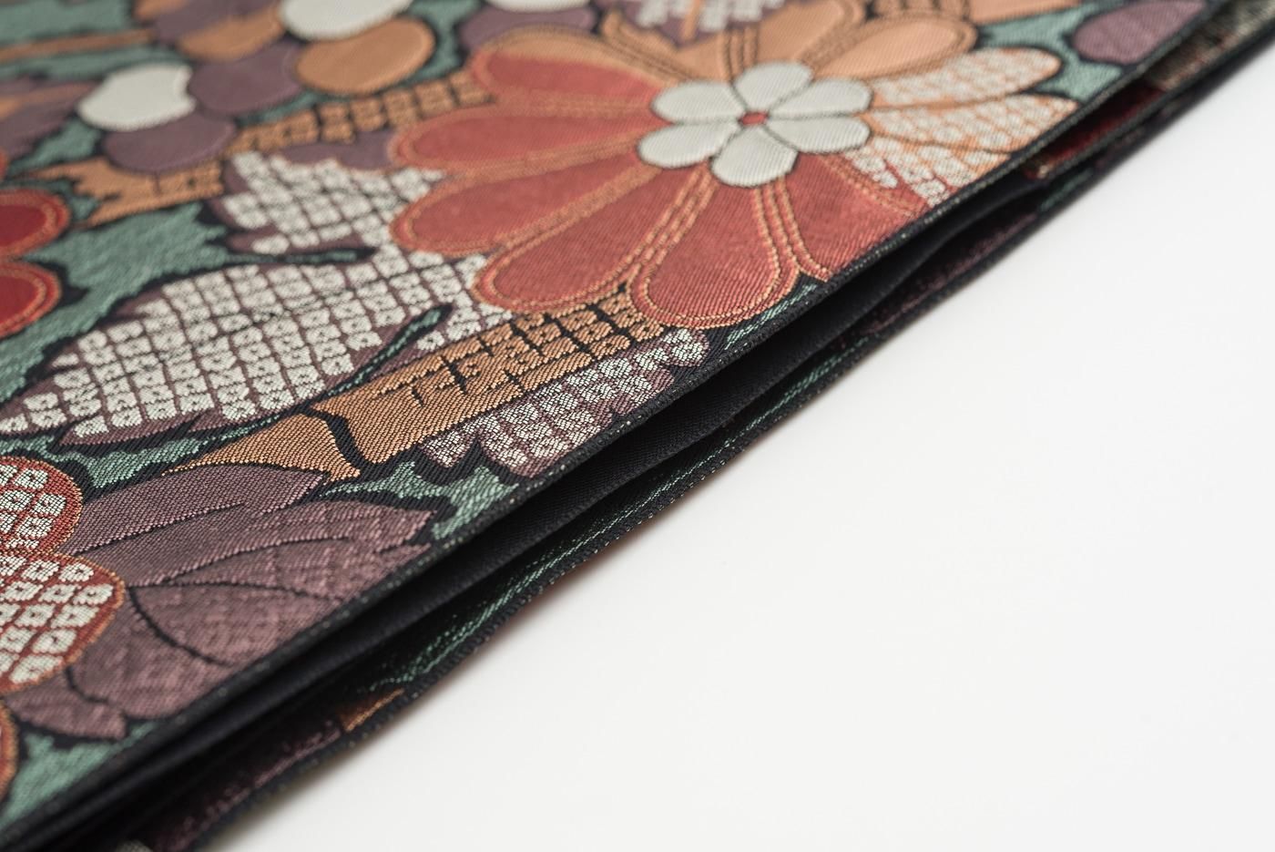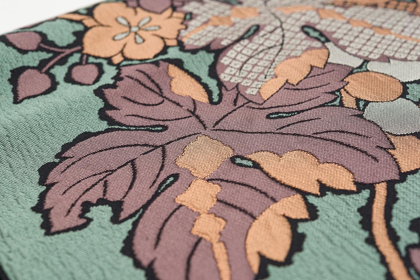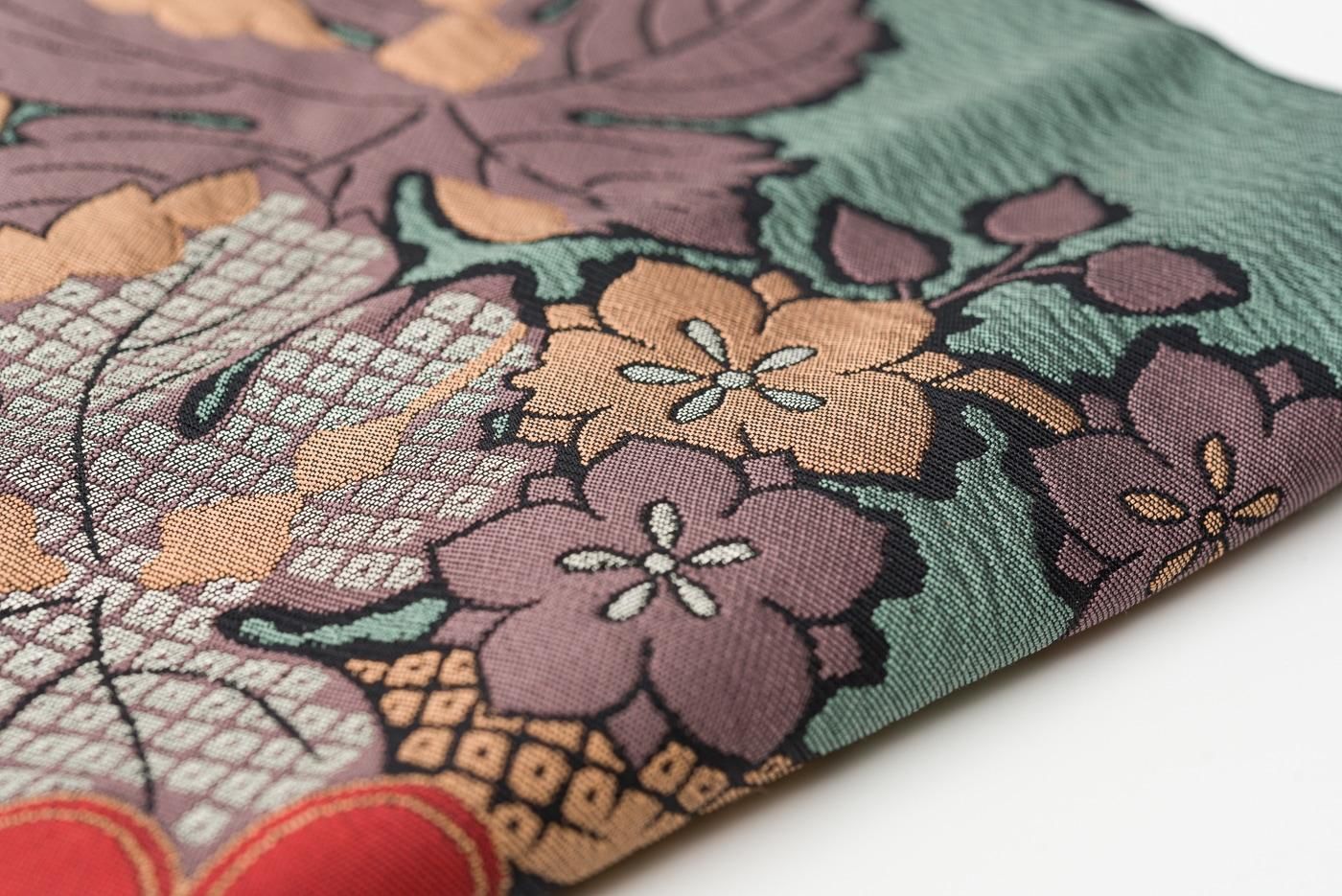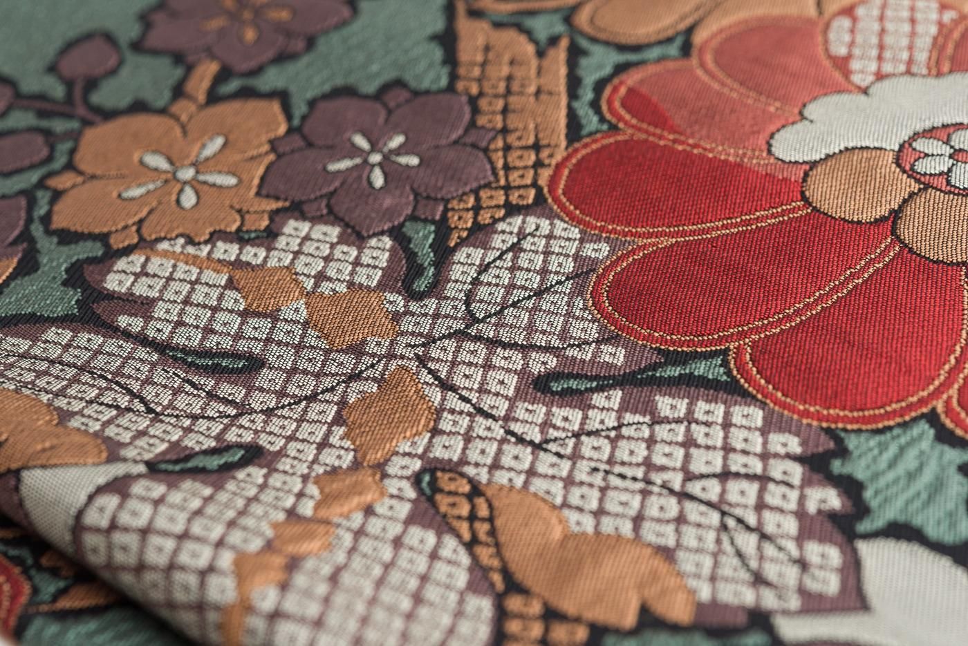 菊や桜などの花と葡萄の実を織り出した八寸名古屋帯です。