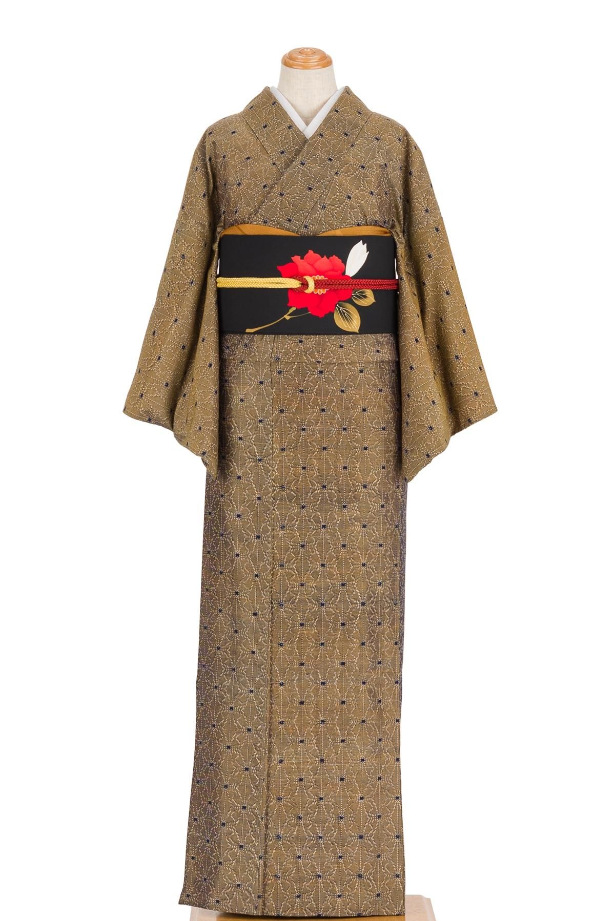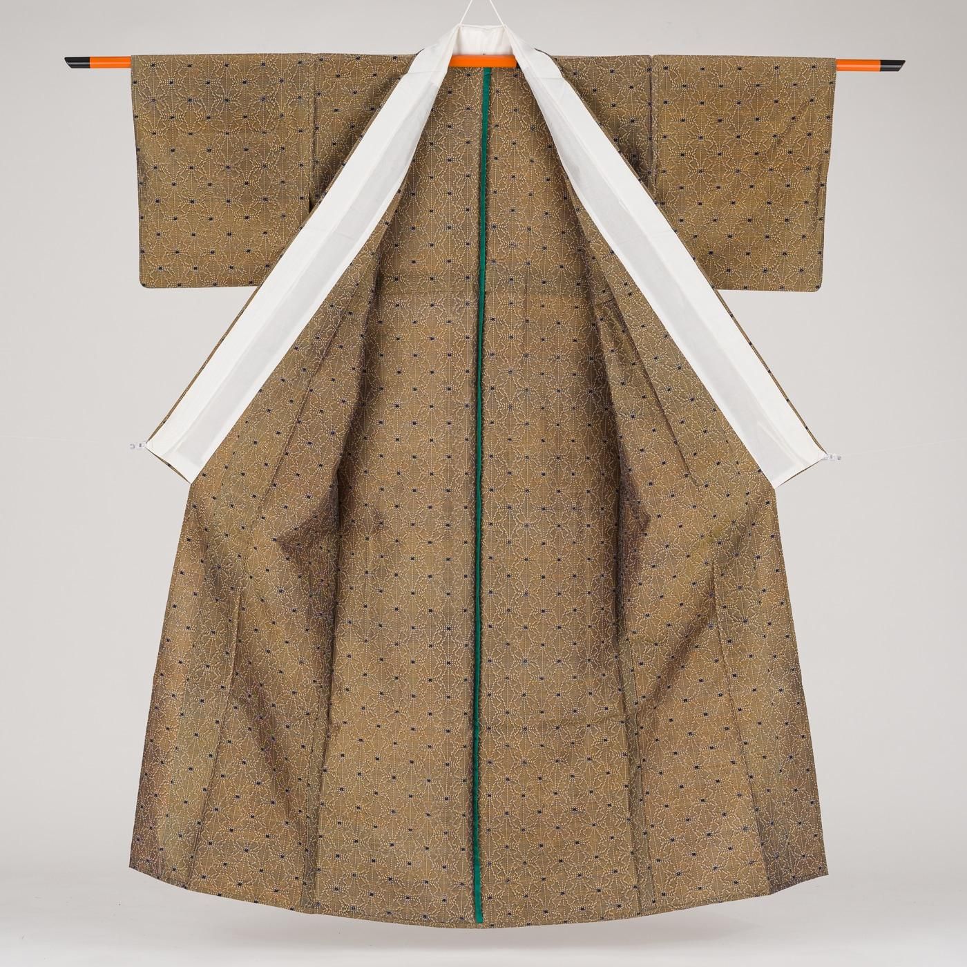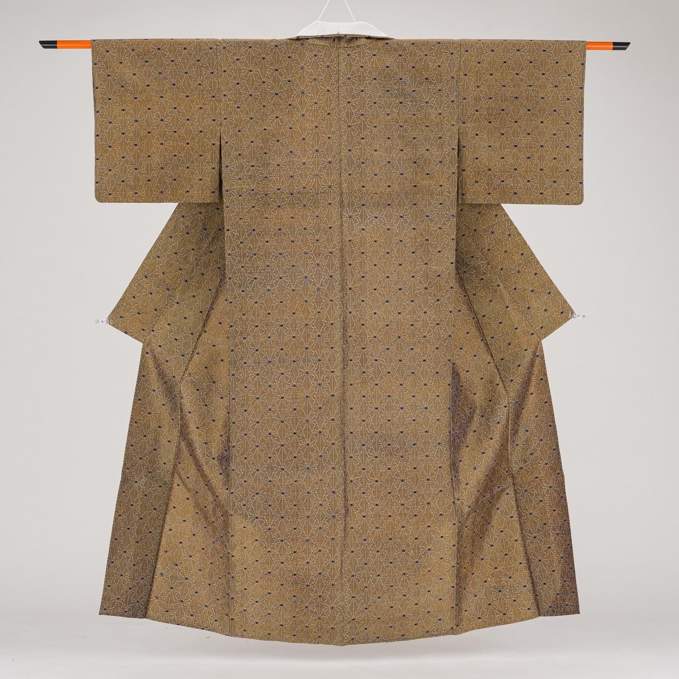 枯葉色の地に麻の葉模様を織り出した単衣の紬です。