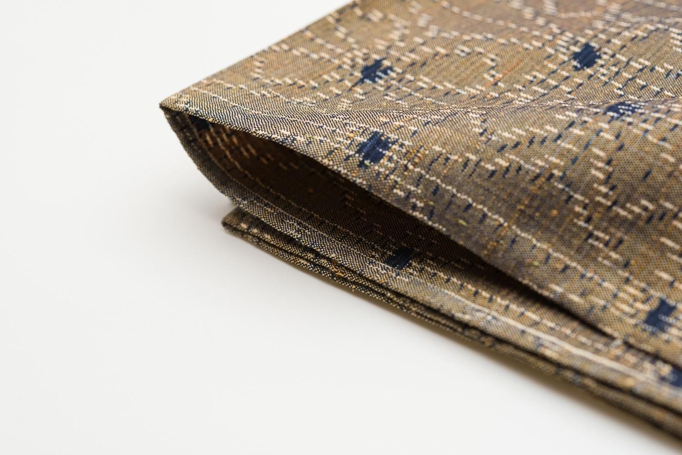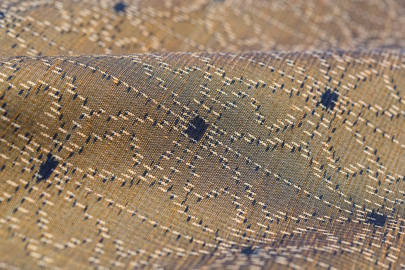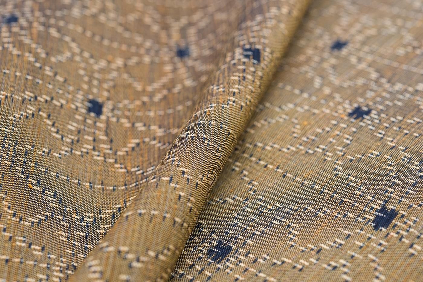 枯葉色の地に麻の葉模様を織り出した単衣の紬です。