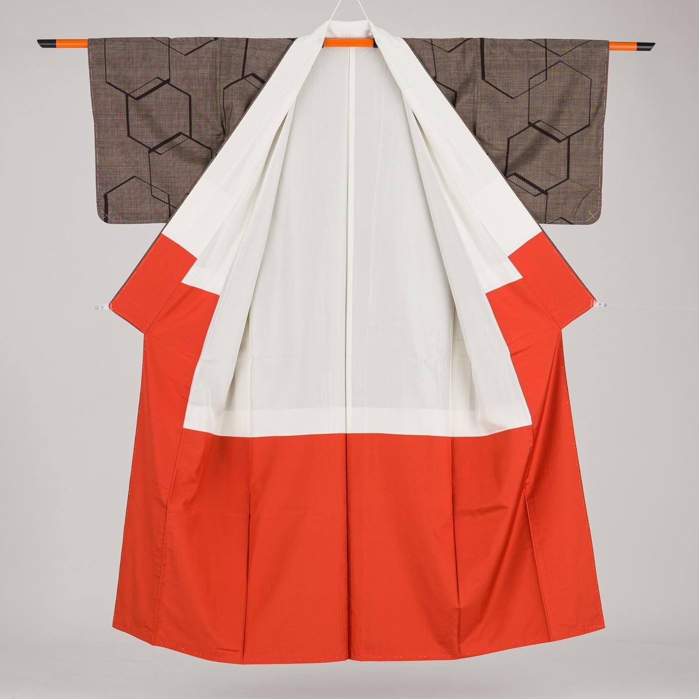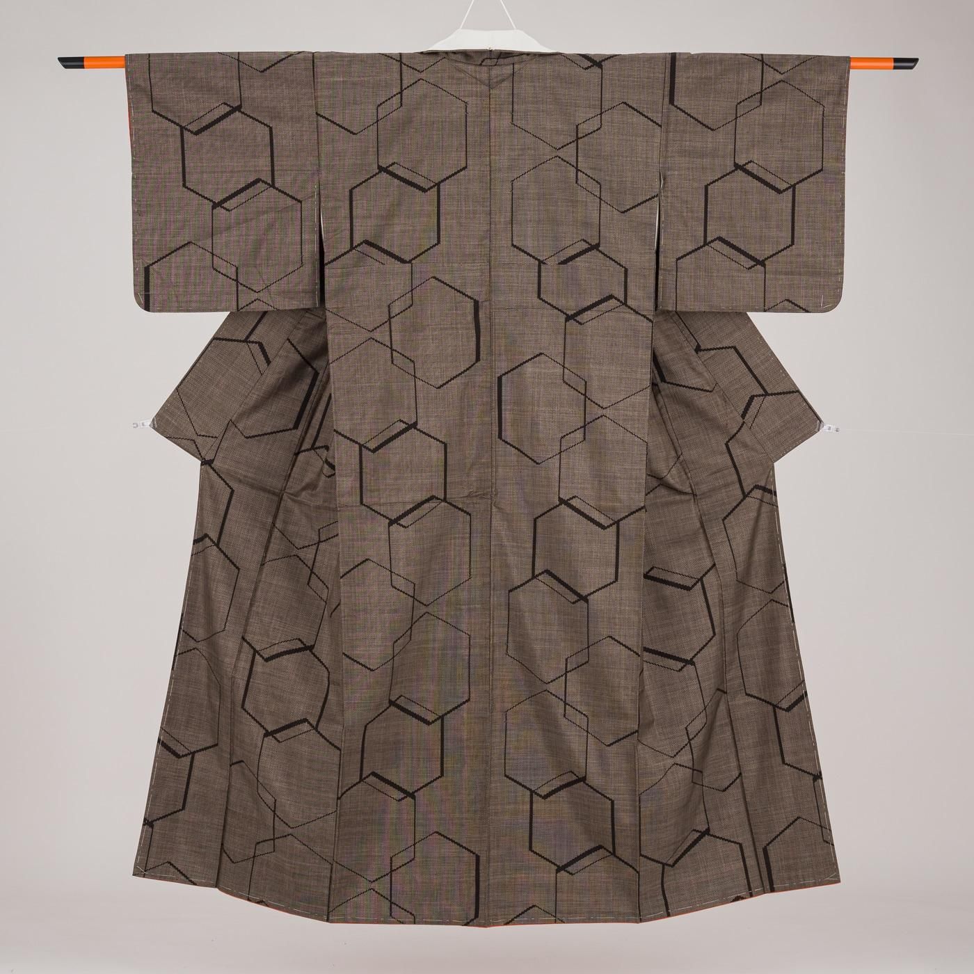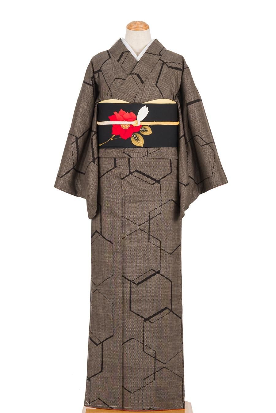 細いラインの亀甲模様を織り出した大島紬の着物です。