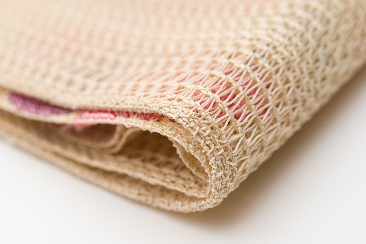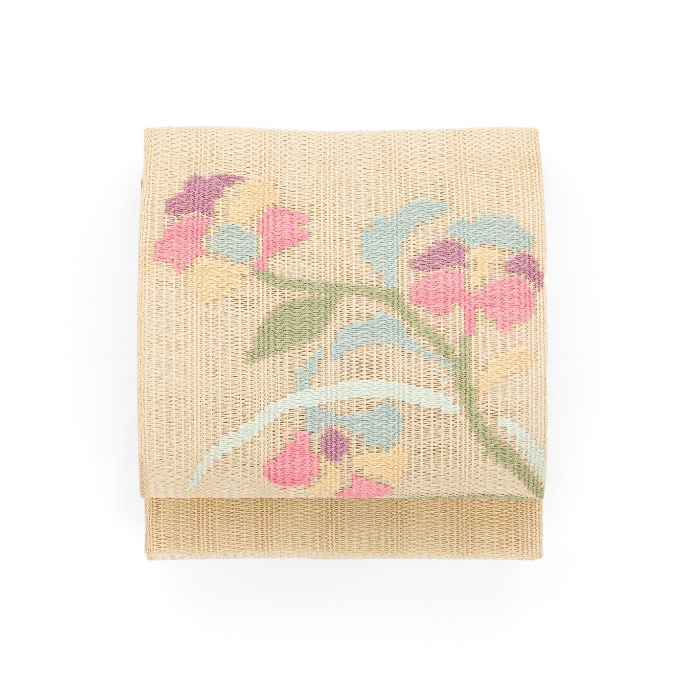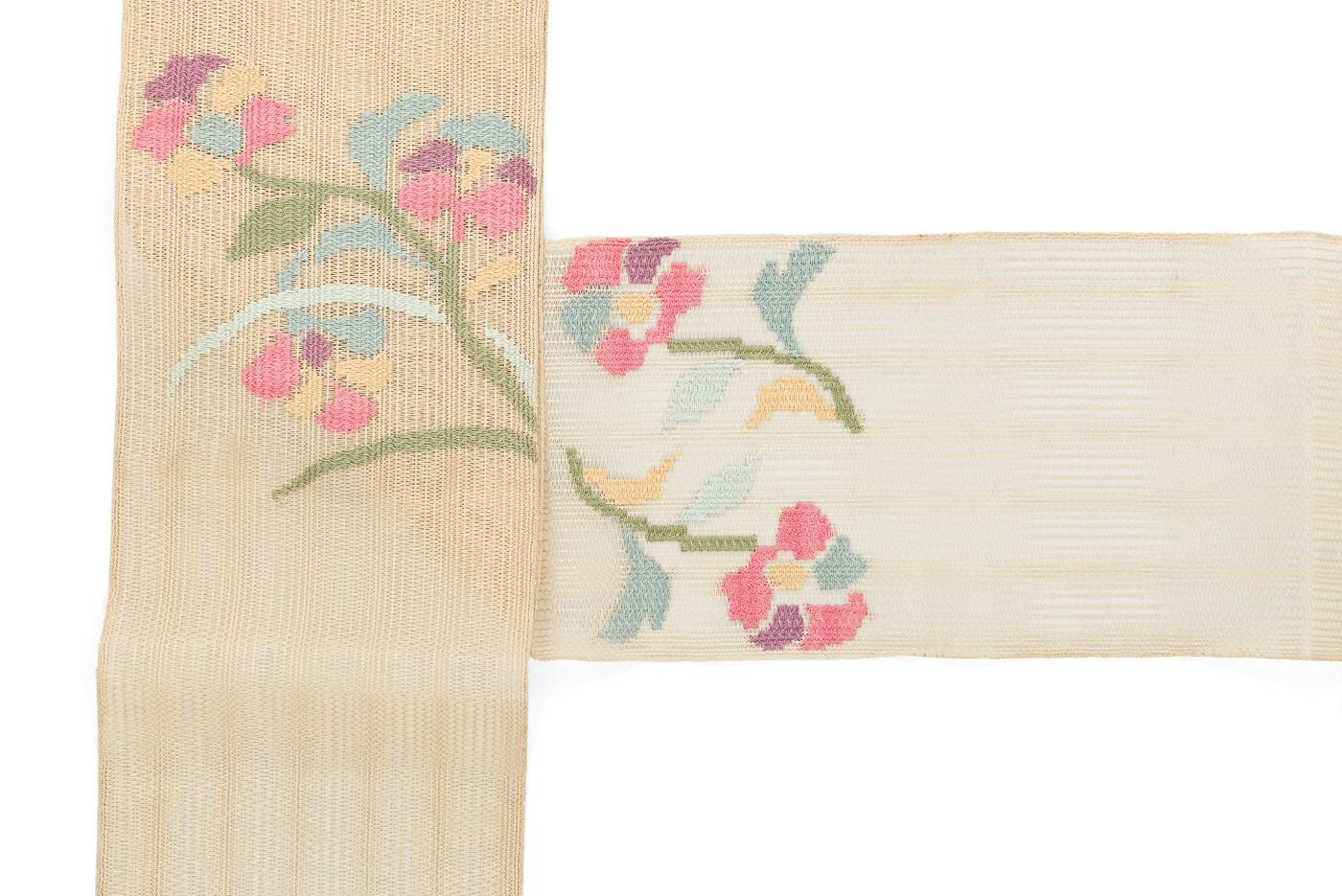 ピンクや水色を基調にした草花柄が愛らしい羅の名古屋帯です。