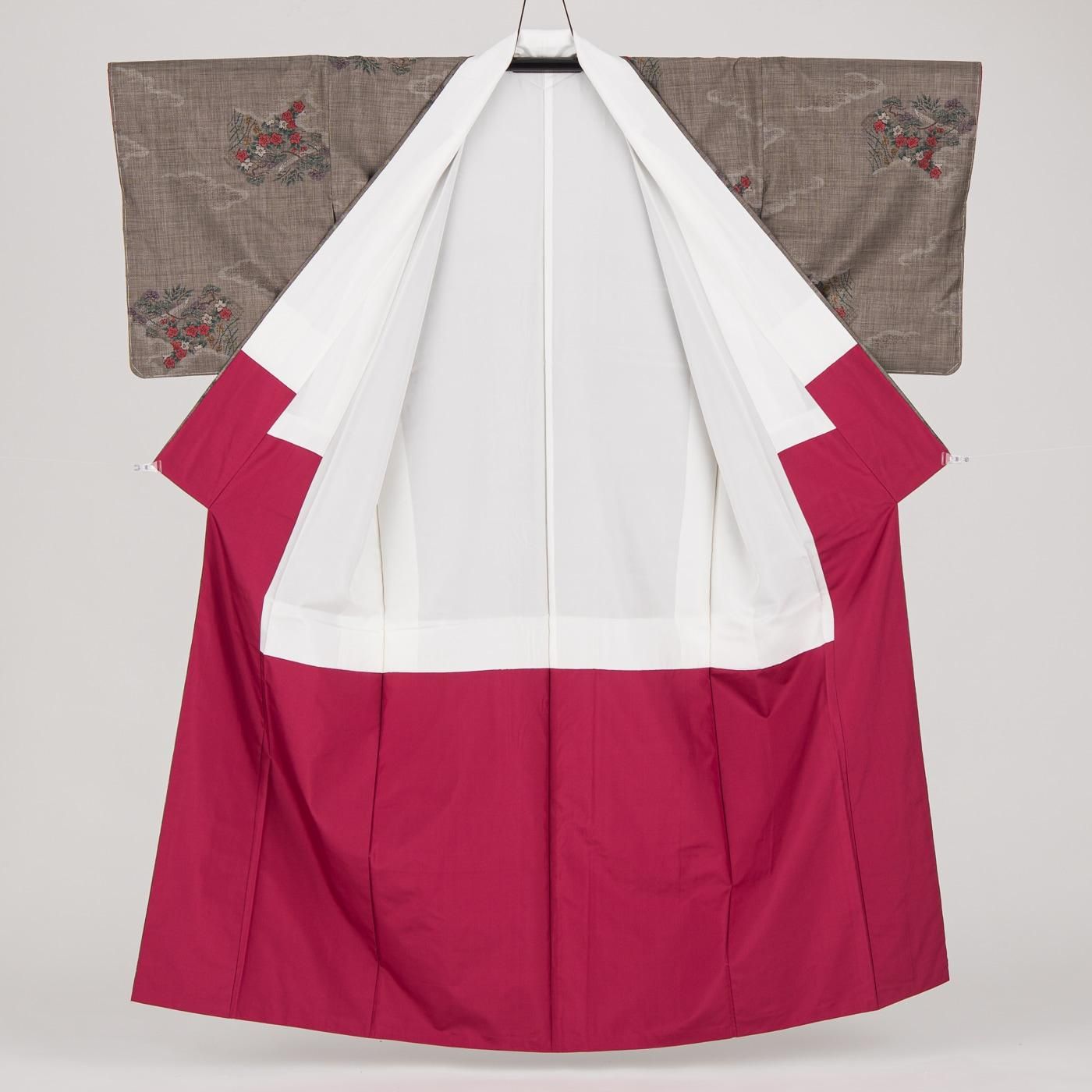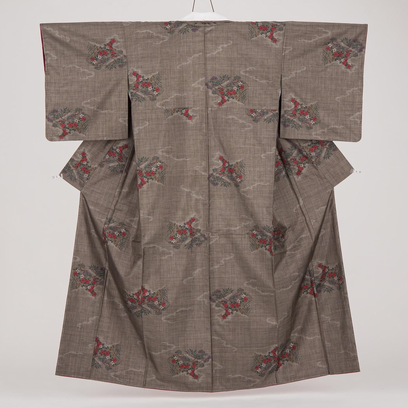 雲取りに赤と白の花を織り出した大島紬の着物です。