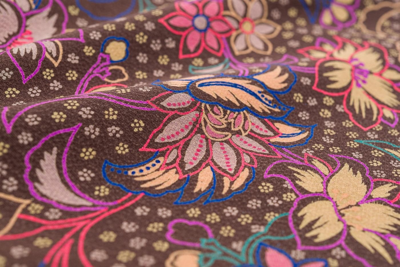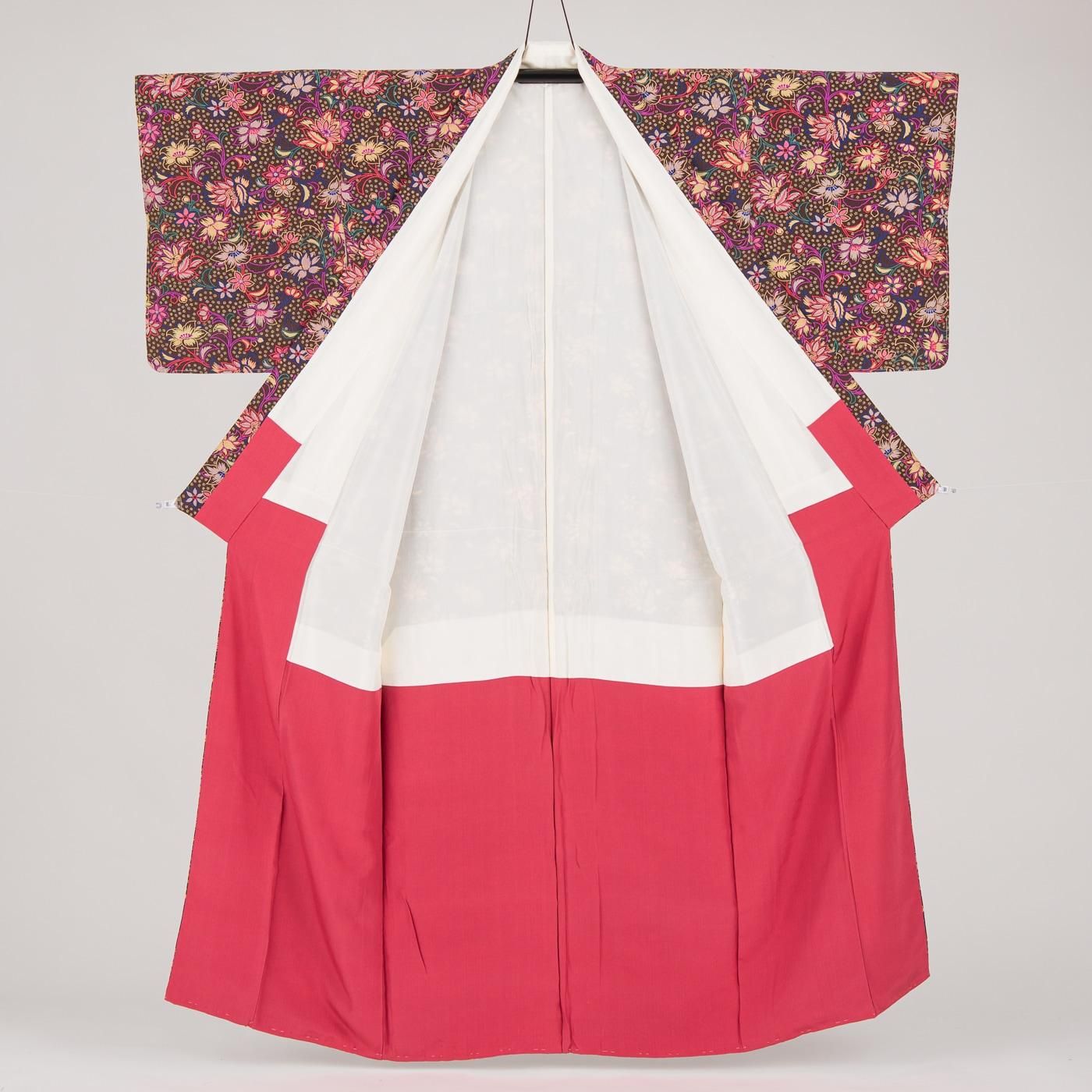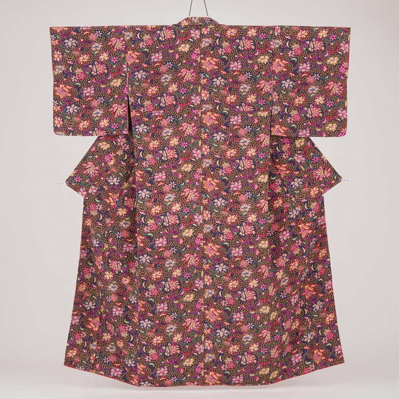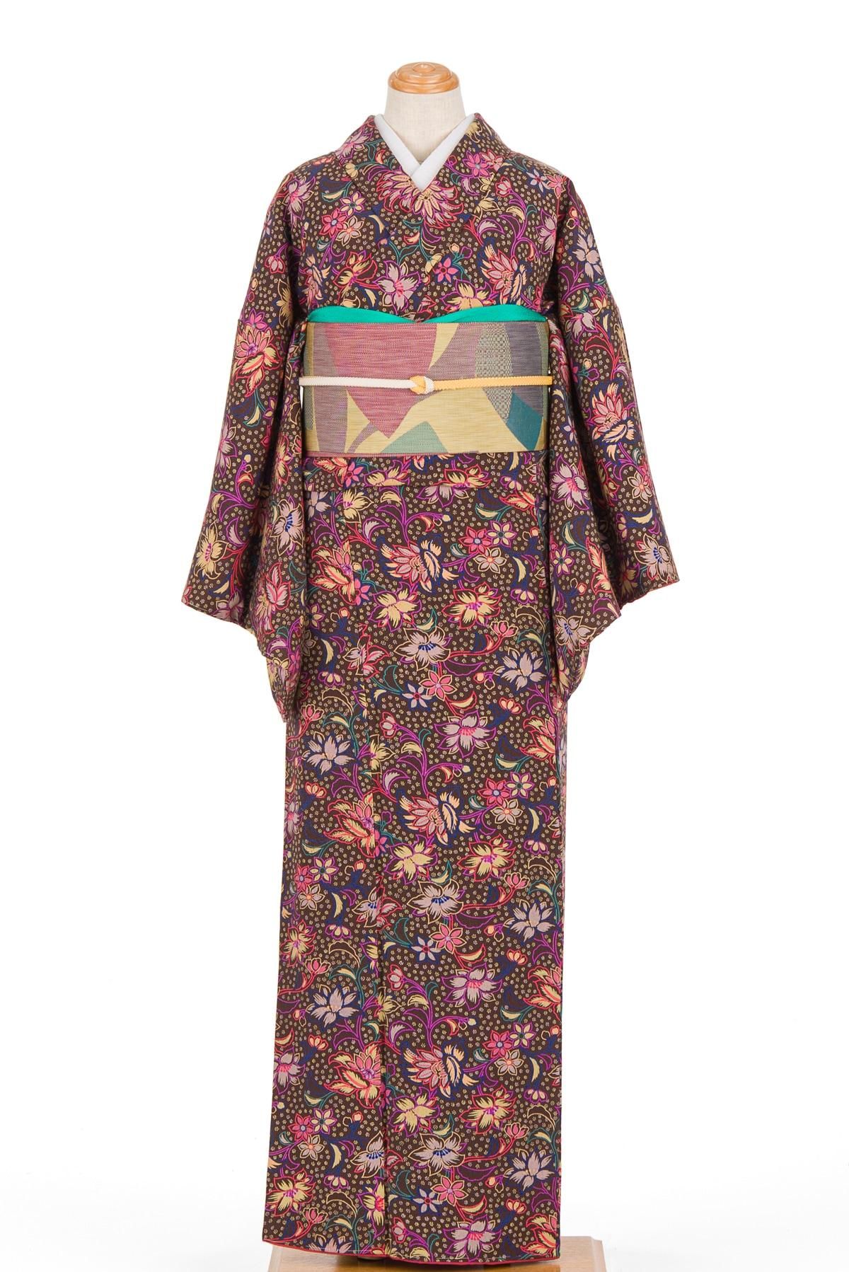 焦げ茶色の地にネオンカラーの花を染めた小紋の着物です。