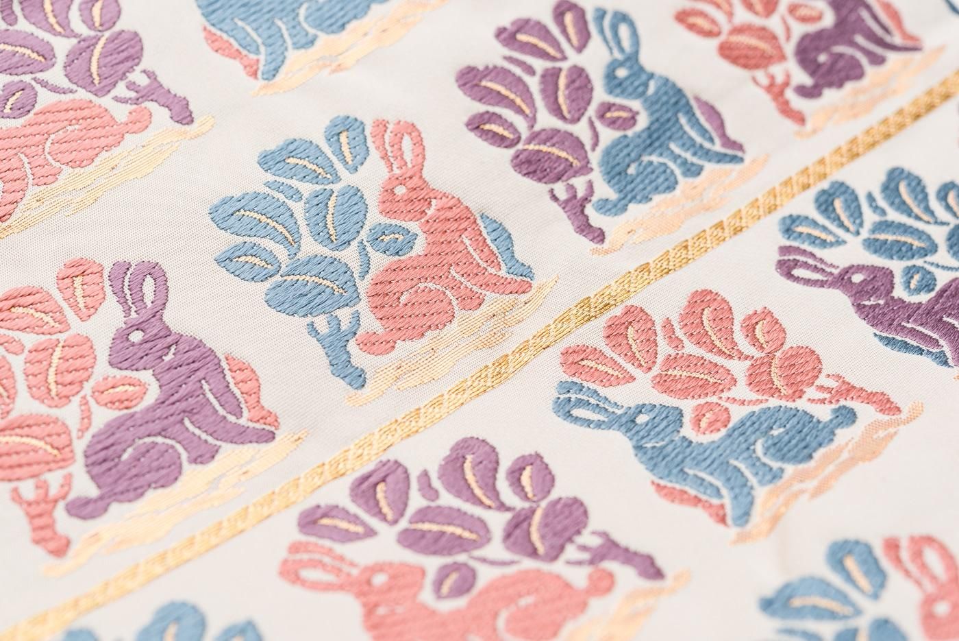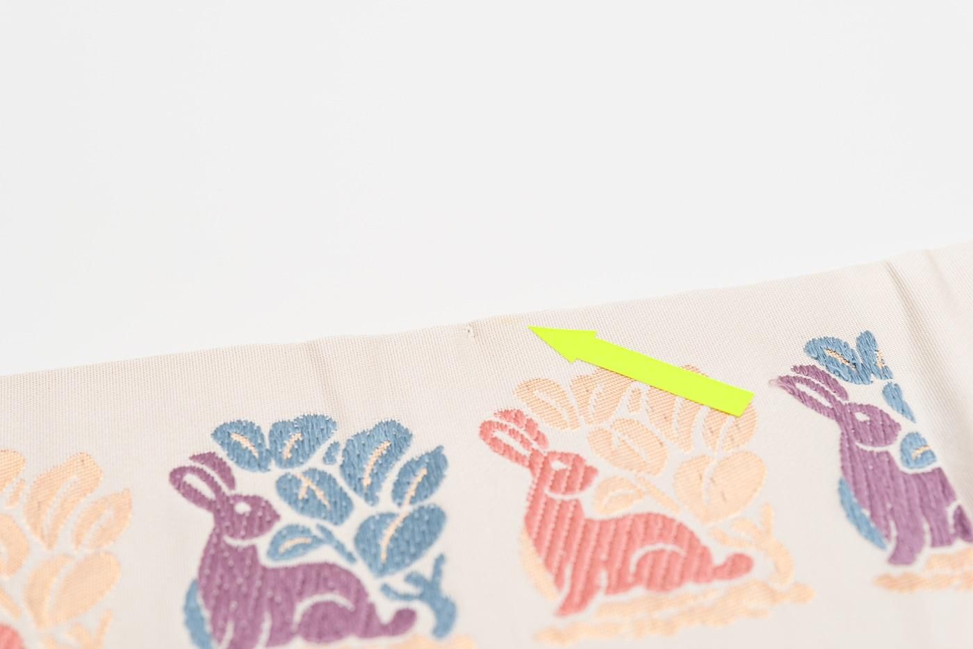 パステルカラーの花兎模様が愛らしい九寸名古屋帯です。