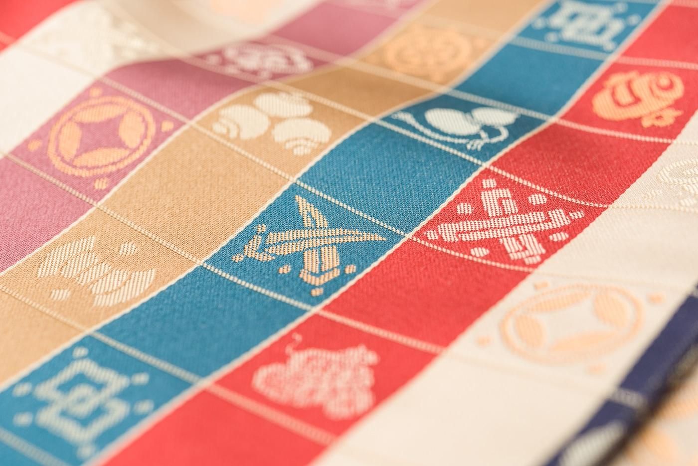 カラフルな縞の中に宝尽くし模様を織り出した九寸名古屋帯です。