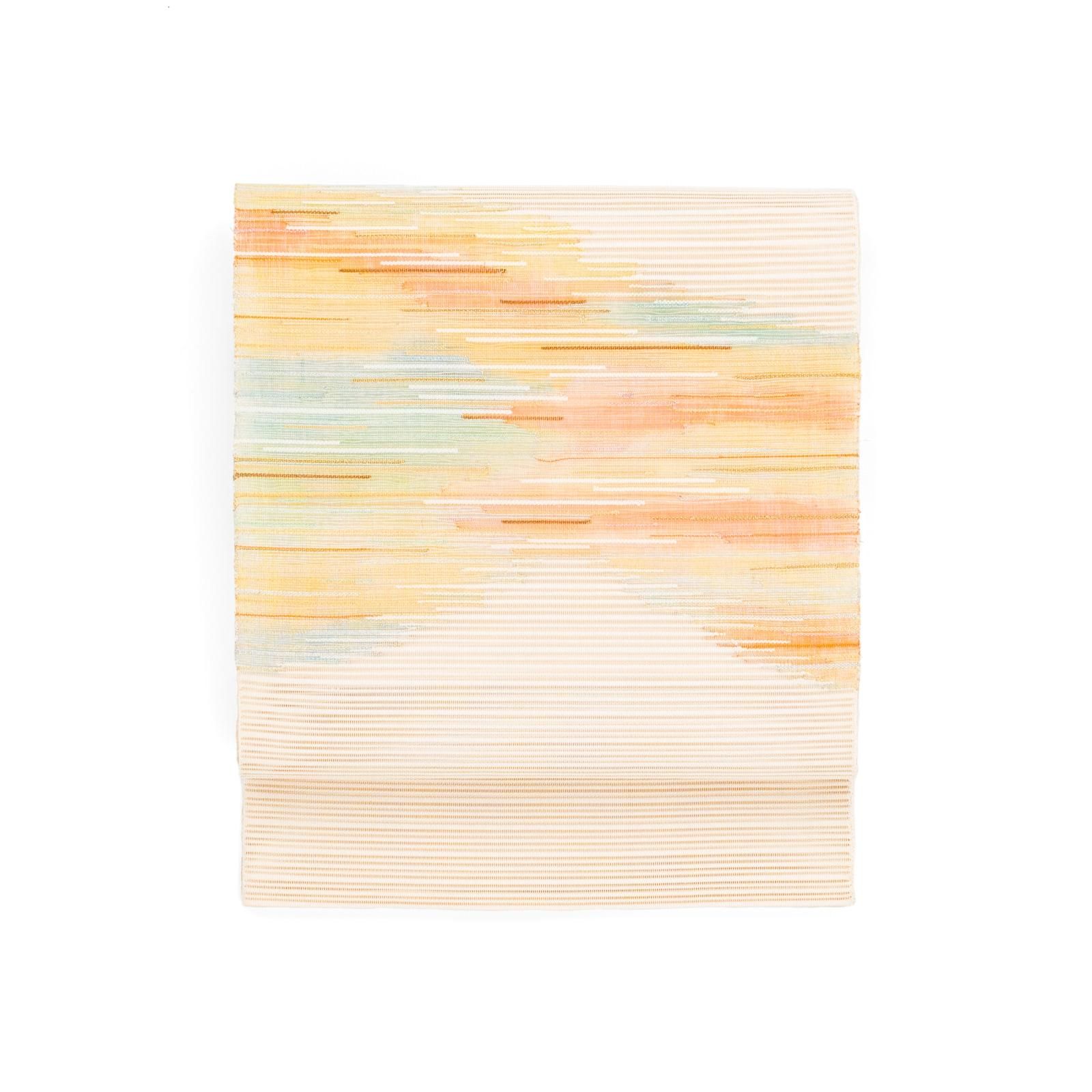 夕焼けのような色彩のグラデーションが美しい絽綴れの八寸名古屋帯です。