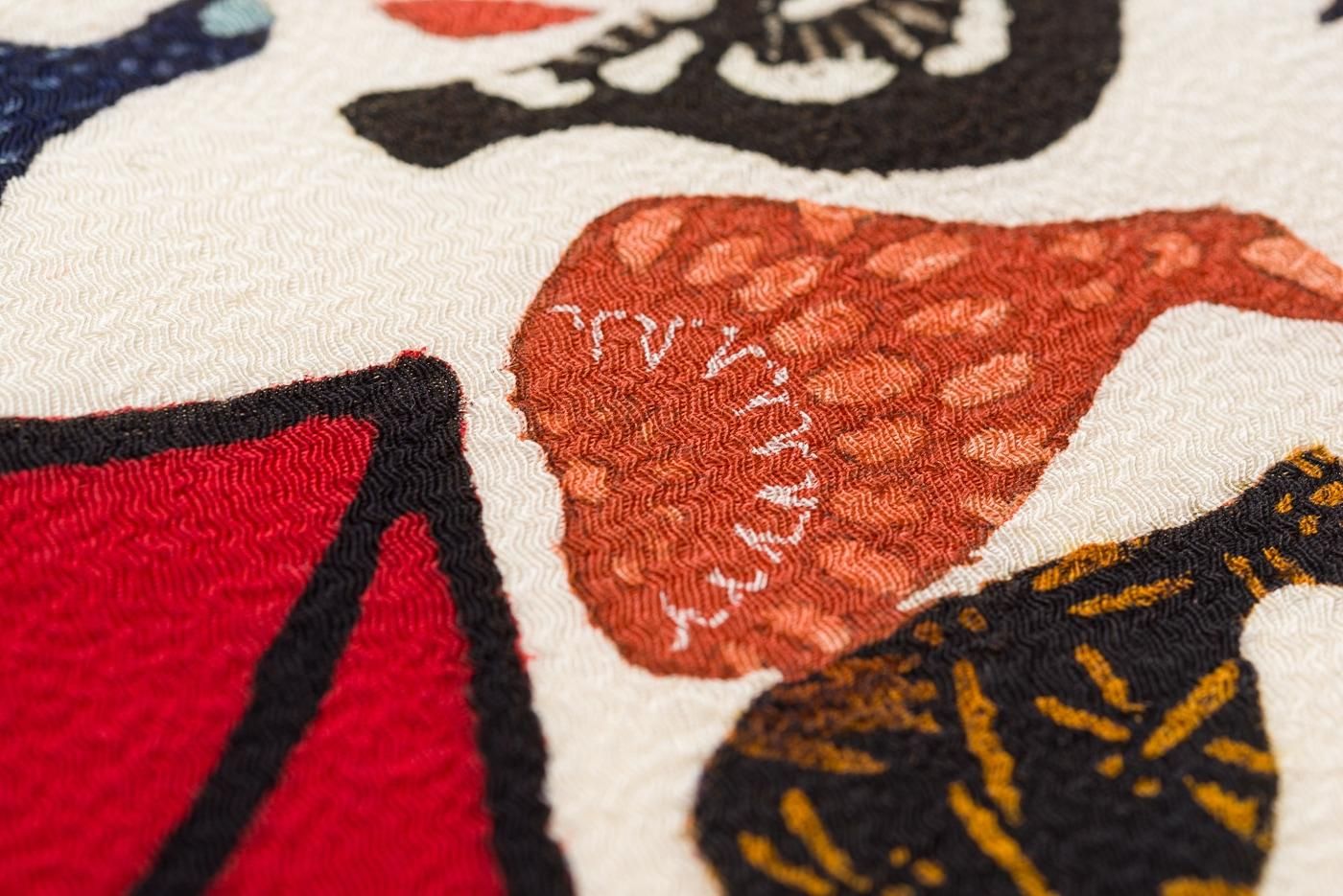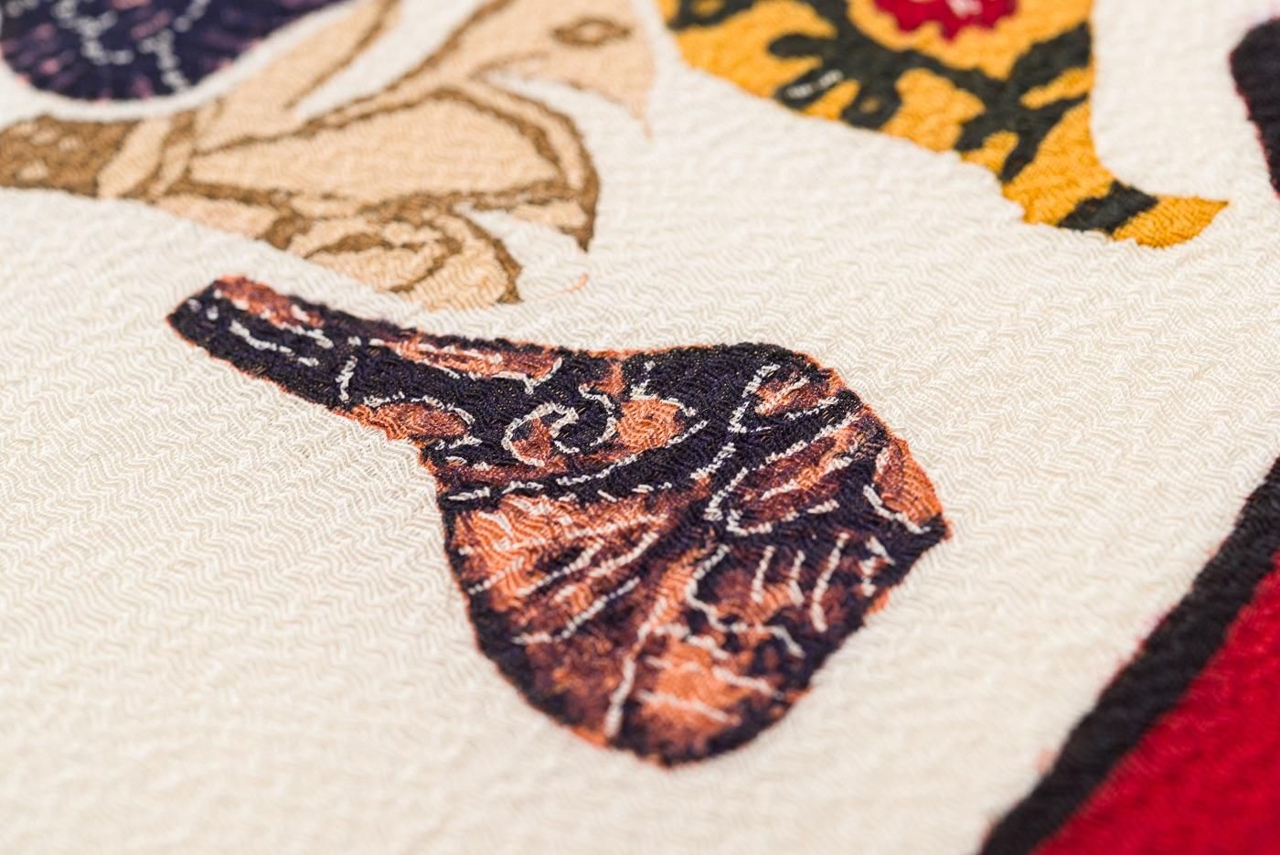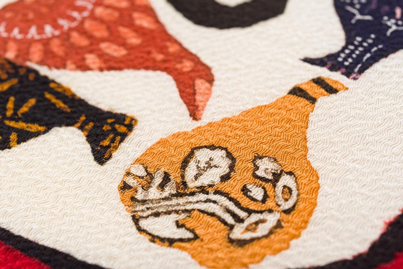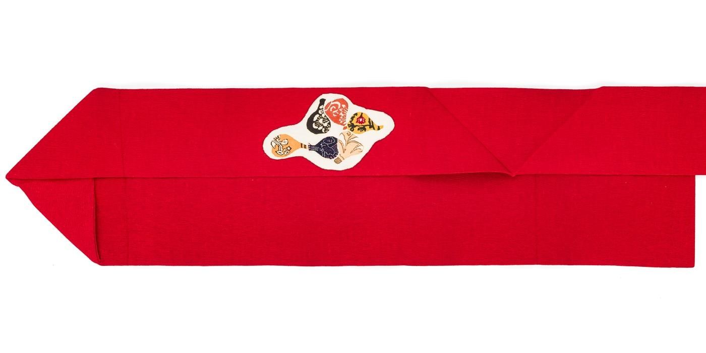 こっくりとした赤い縮緬地に無花果を染めた九寸名古屋帯です。