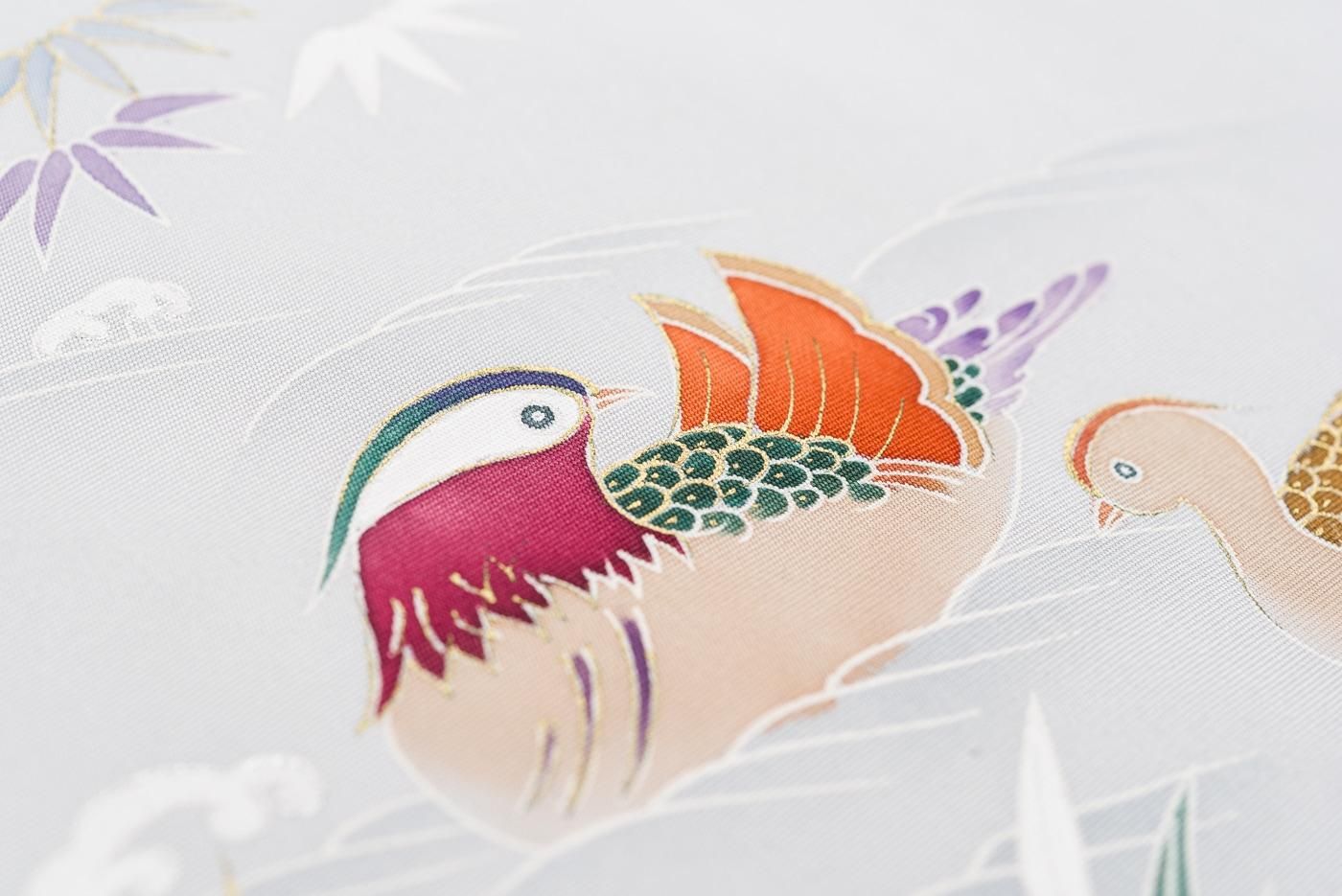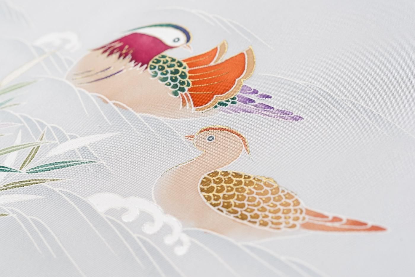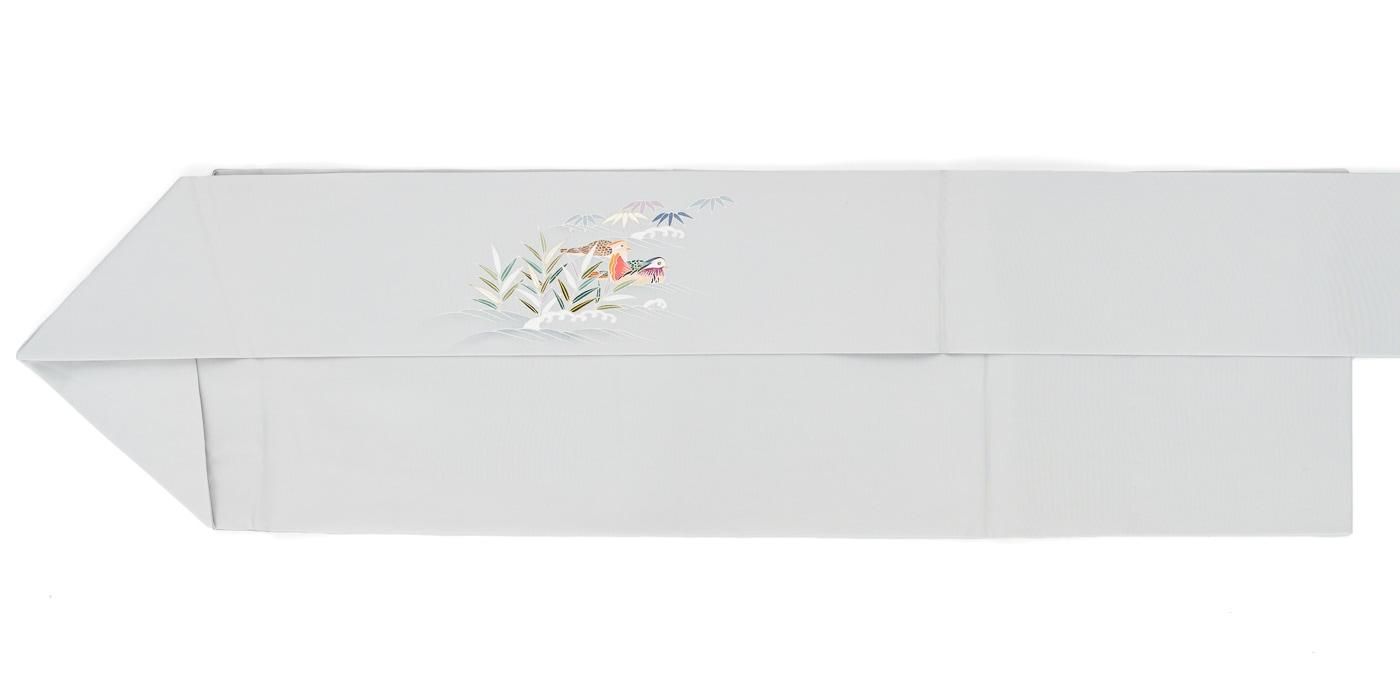 ブルーグレーの地に仲睦まじい鴛鴦のつがいを描いた九寸名古屋帯です。