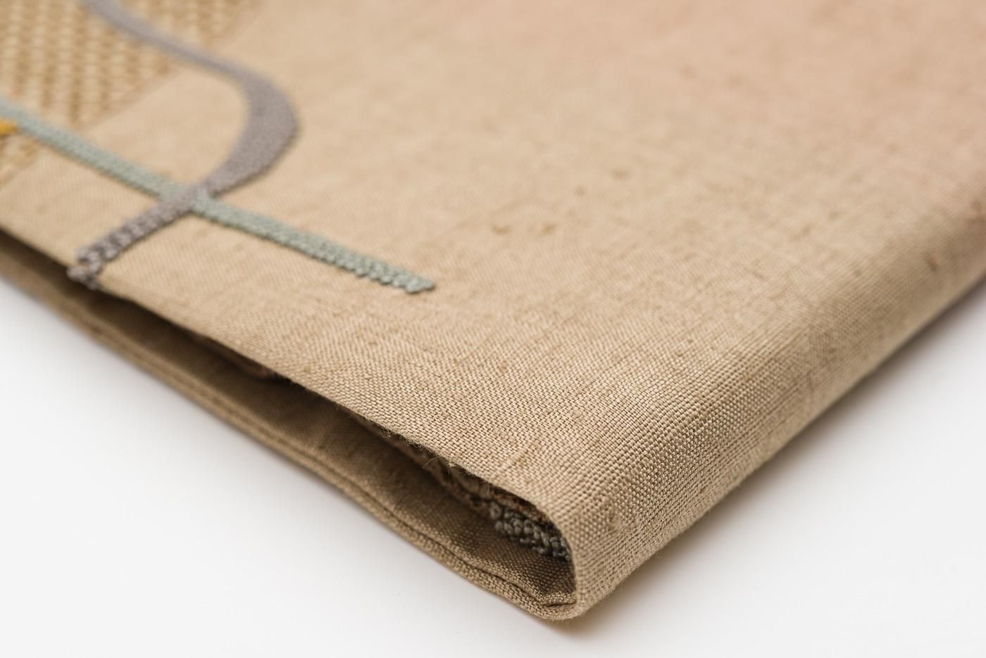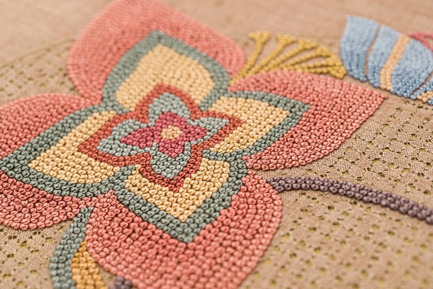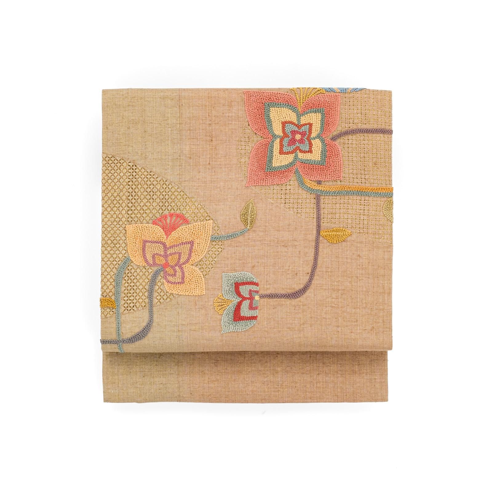 茶ベージュの紬地に花の相良刺繍を施した九寸名古屋帯です。