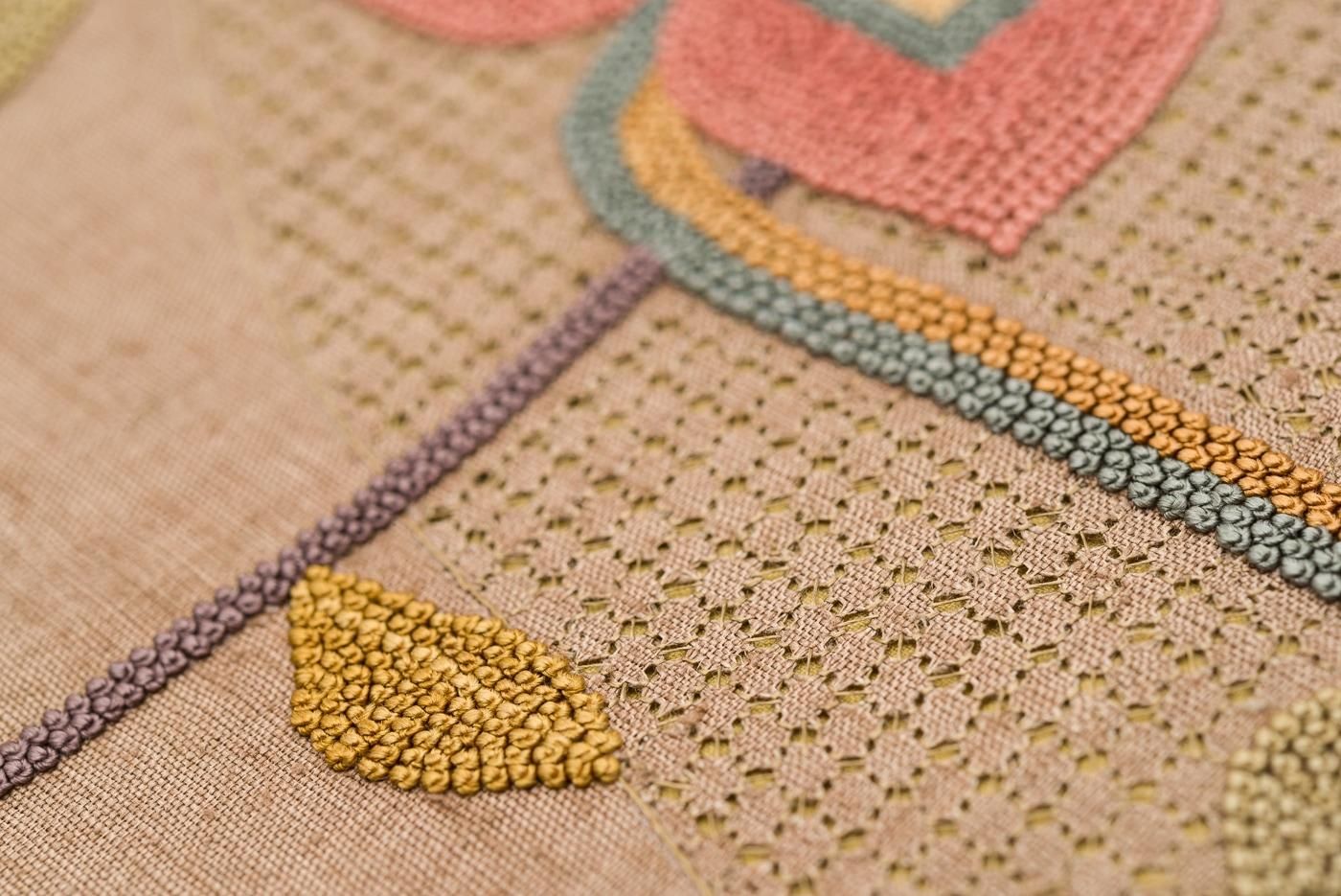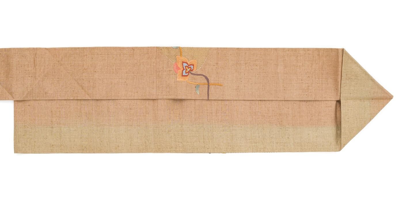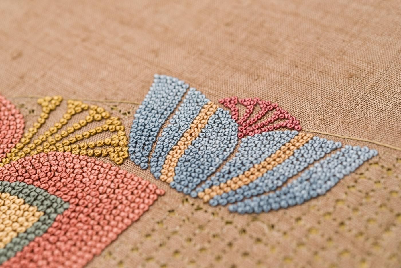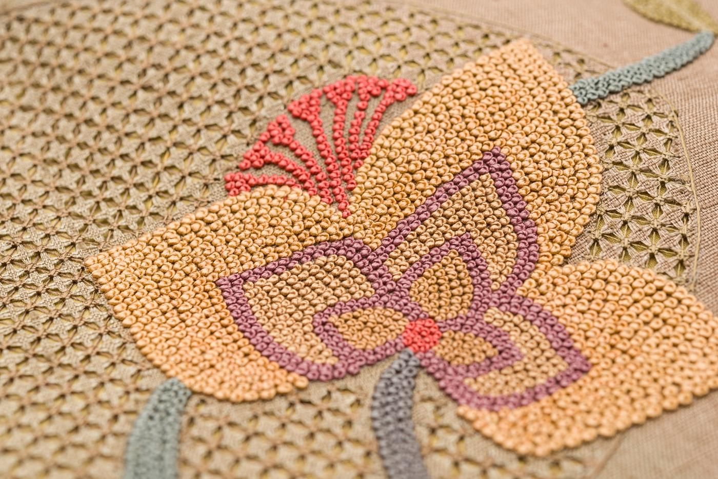 茶ベージュの紬地に花の相良刺繍を施した九寸名古屋帯です。