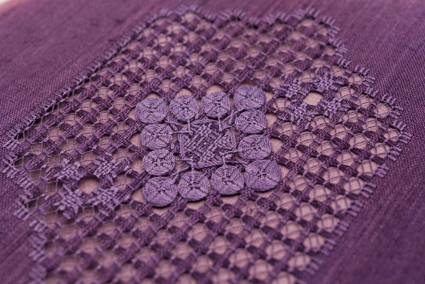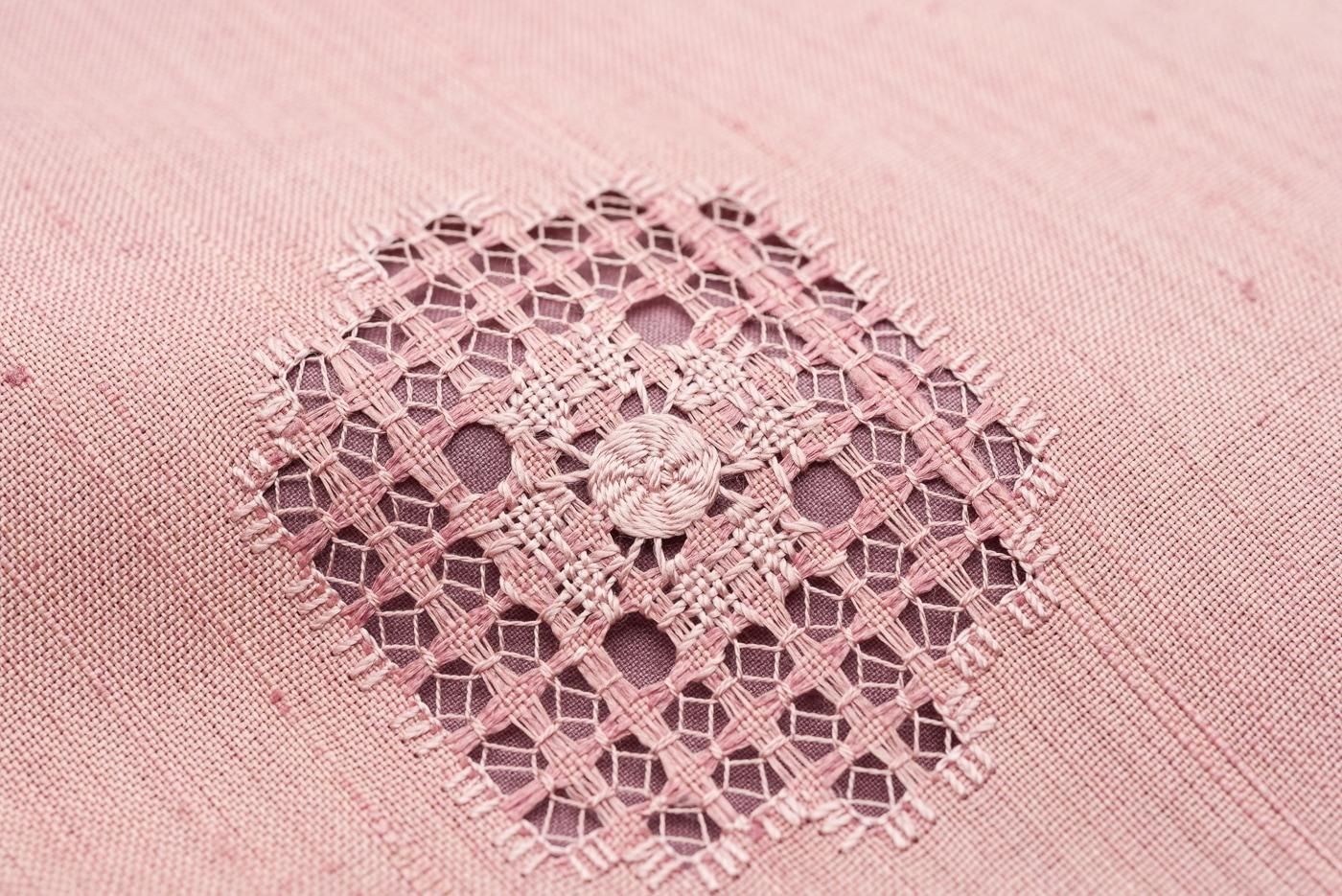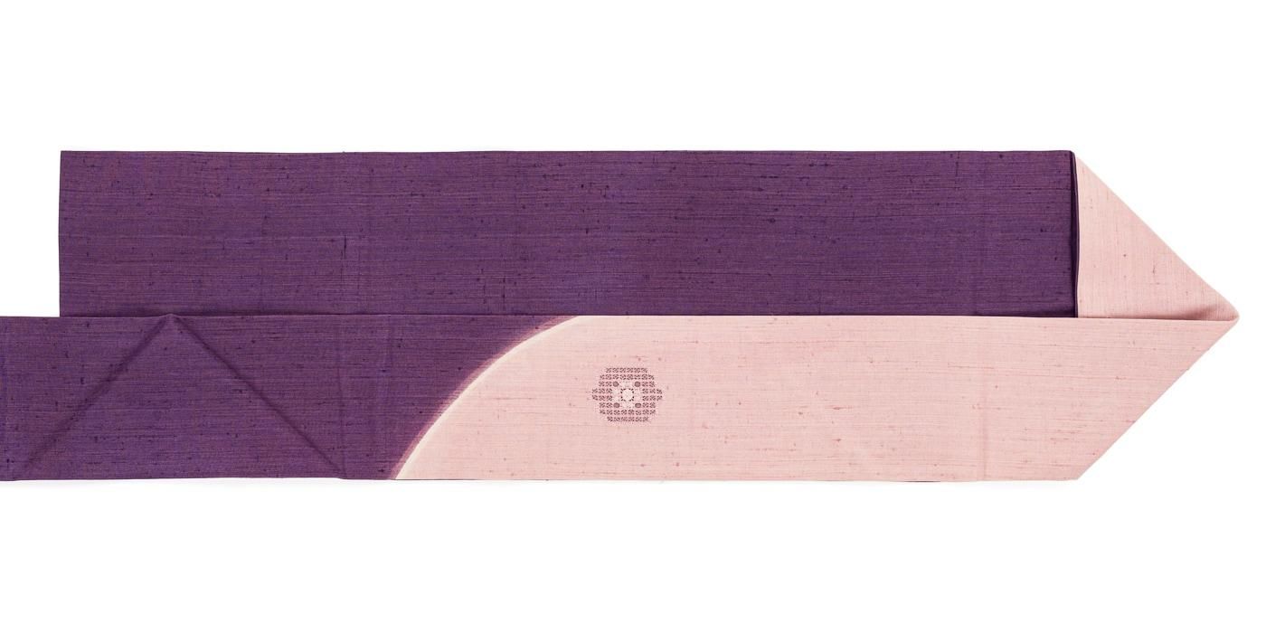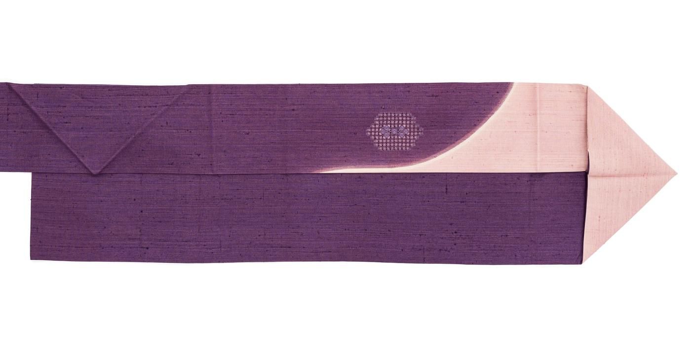 波線で染め分けた紬地にドロンワークの亀甲柄が浮かぶ九寸名古屋帯です。
