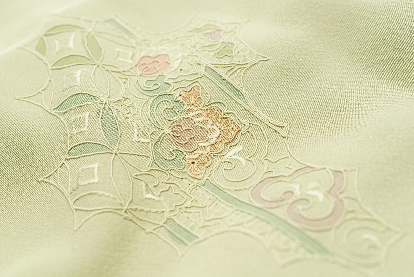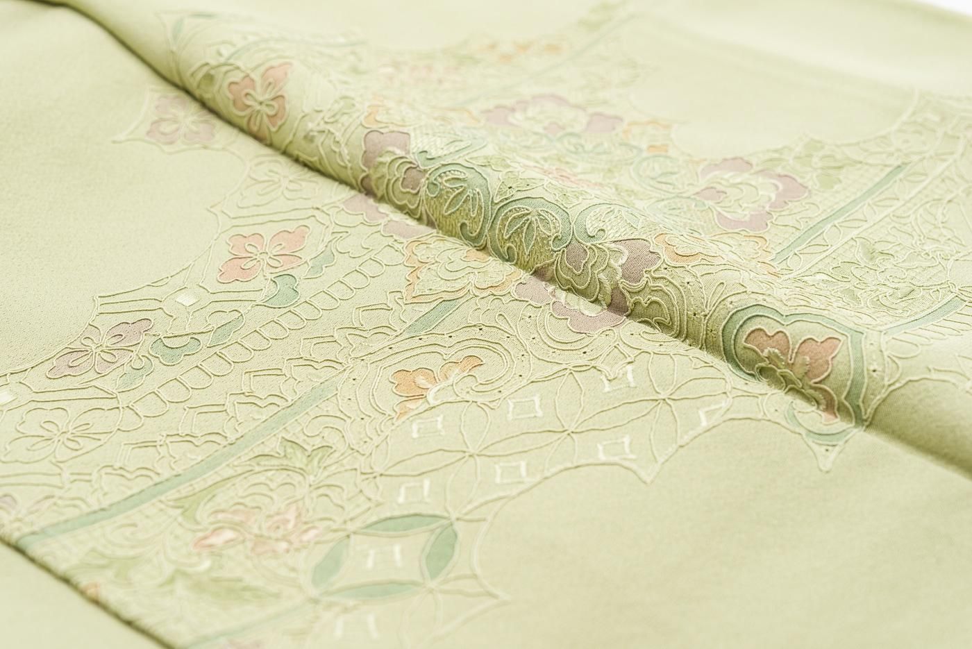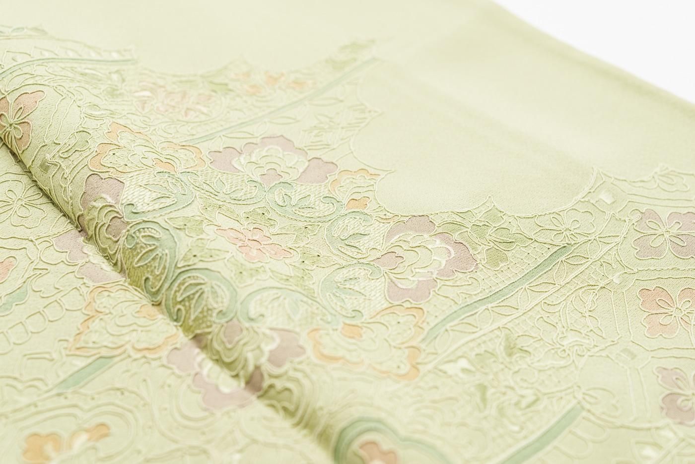 黄緑色の地に汕頭刺繍で華紋模様を施した訪問着です。