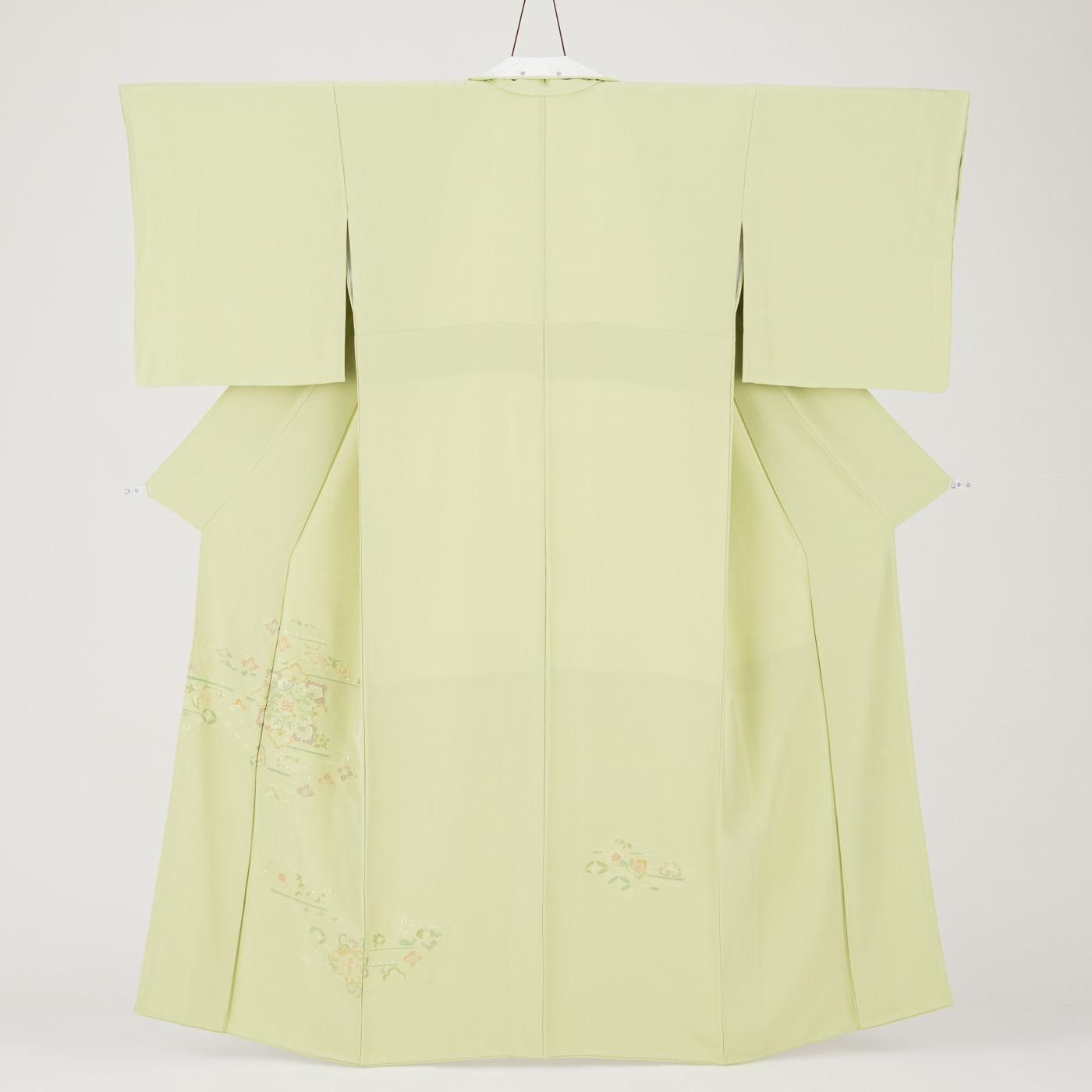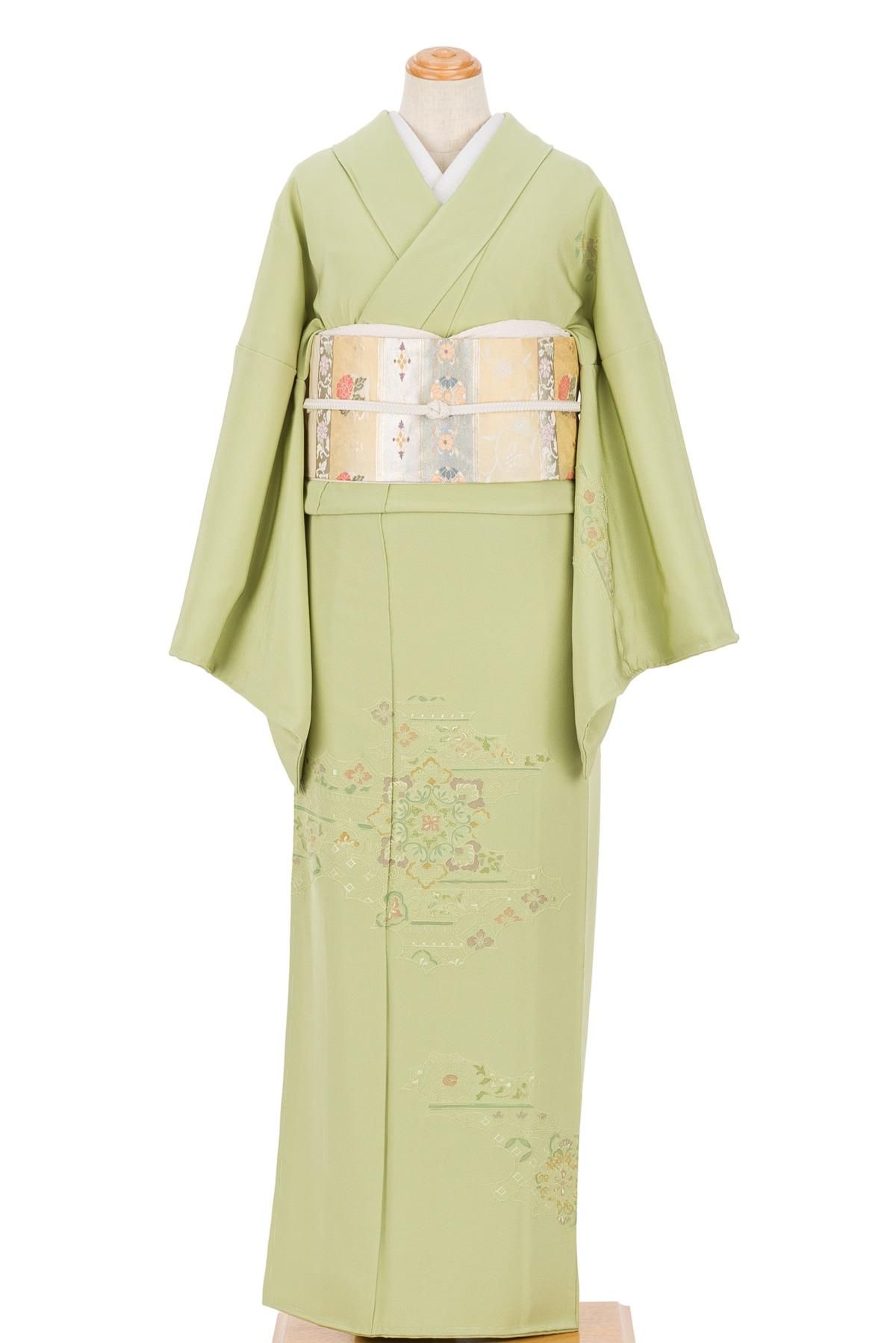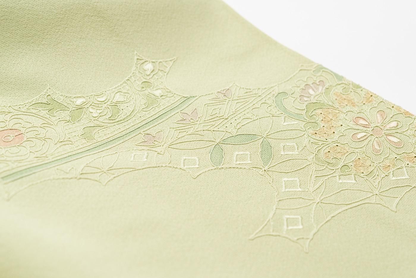 黄緑色の地に汕頭刺繍で華紋模様を施した訪問着です。