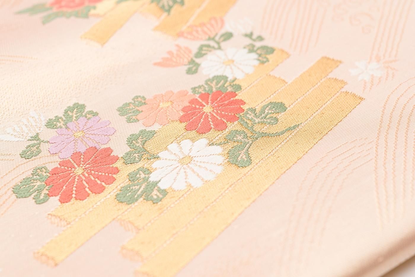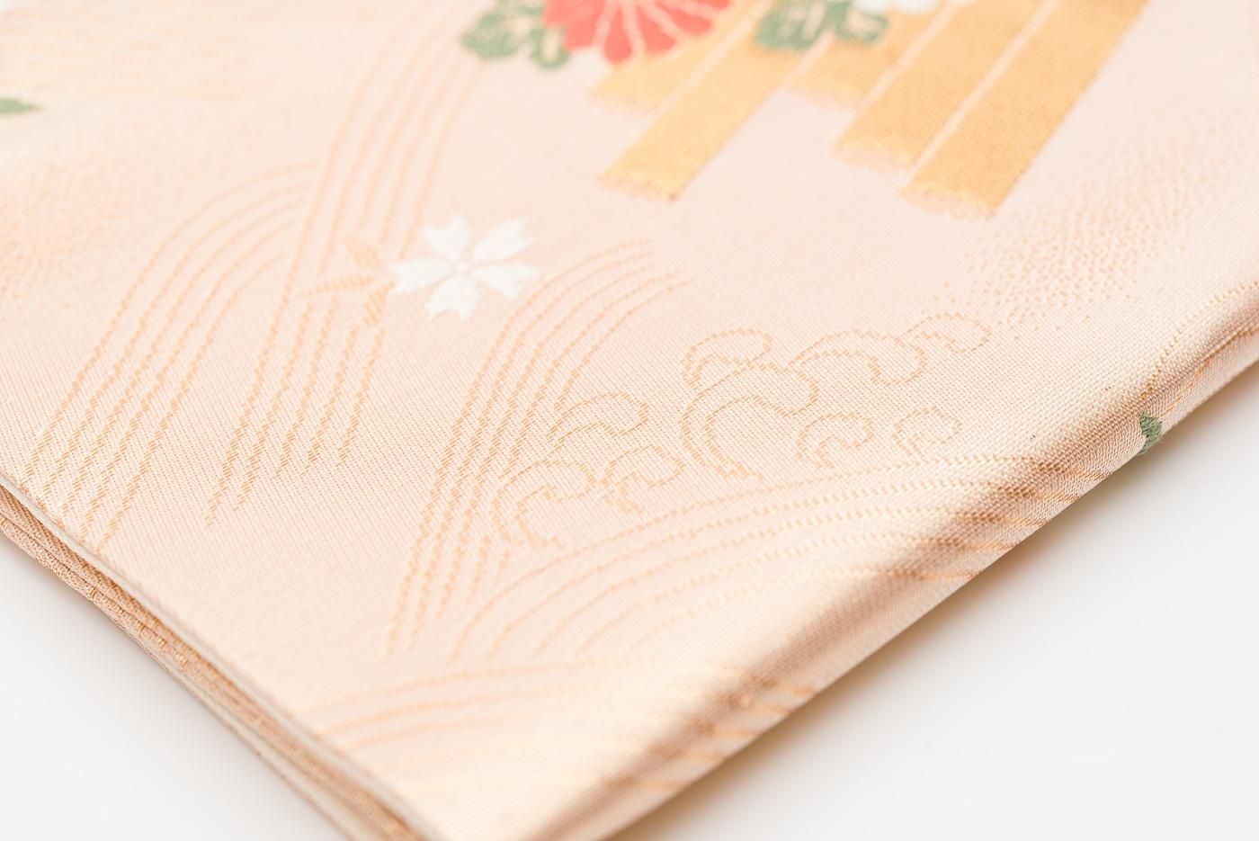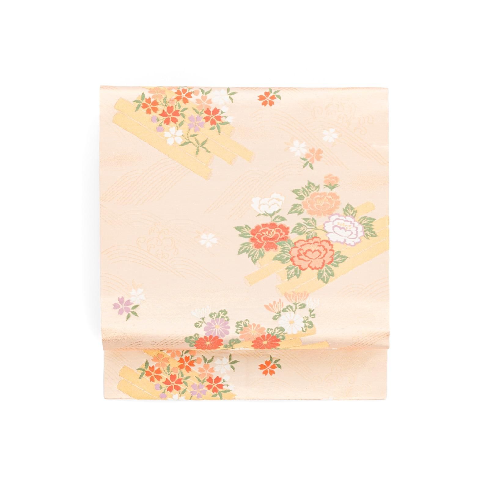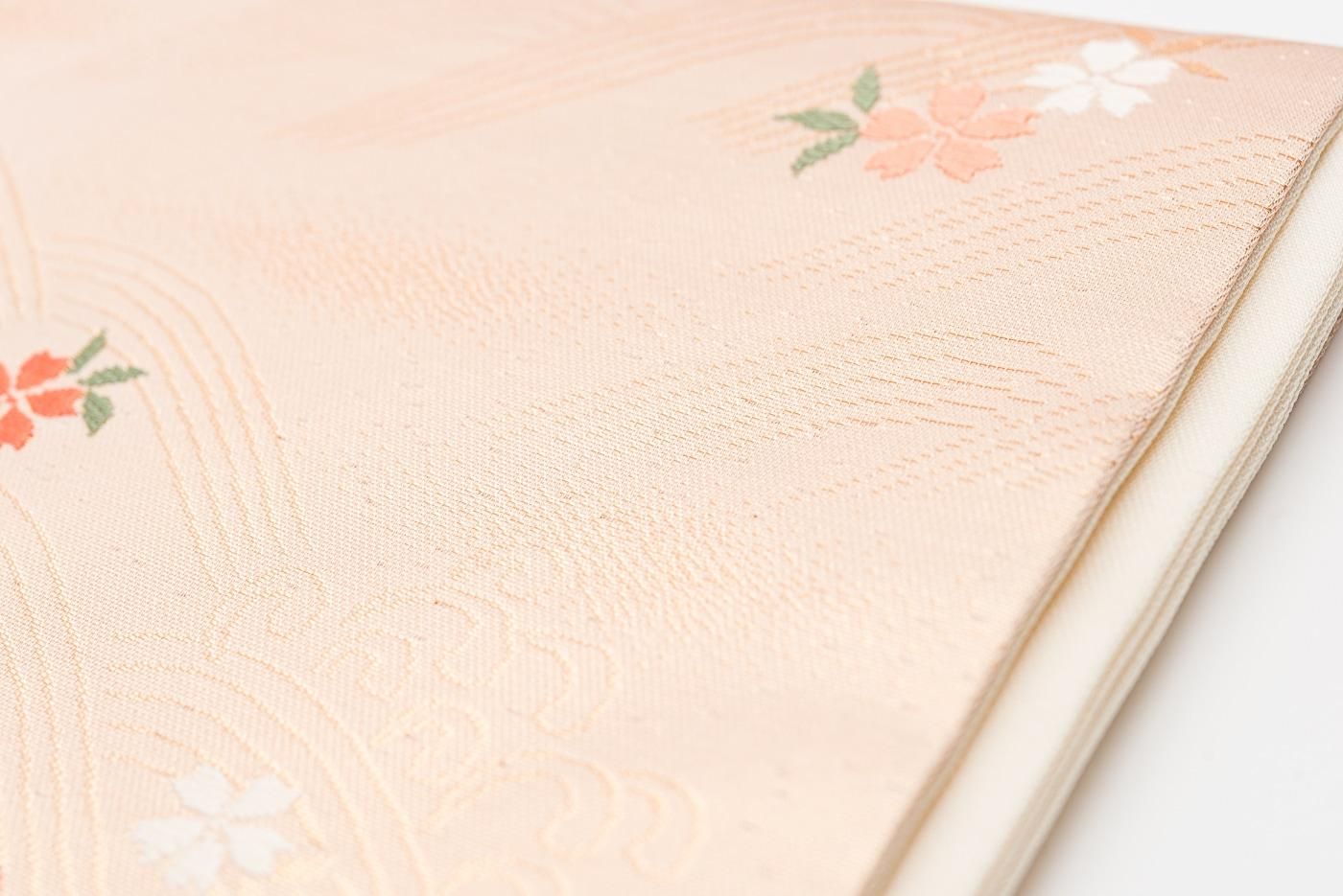 シャンパンゴールドの地に花筏模様を織り出した九寸名古屋帯です。