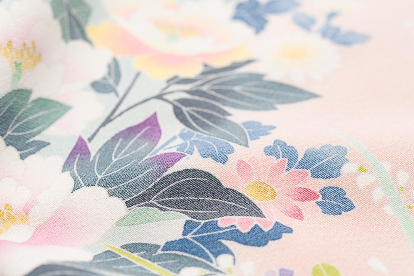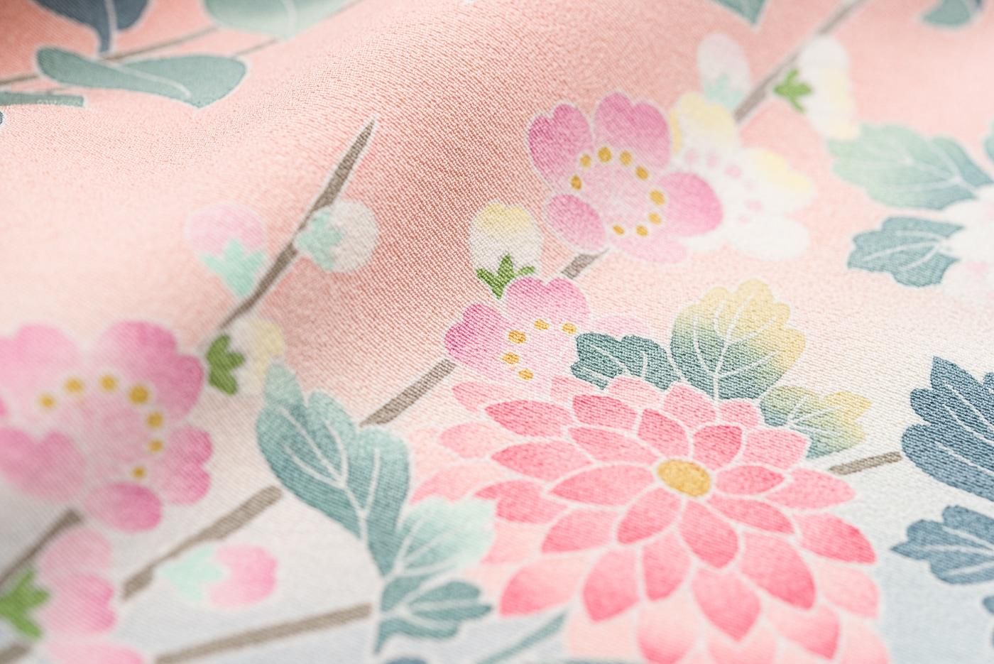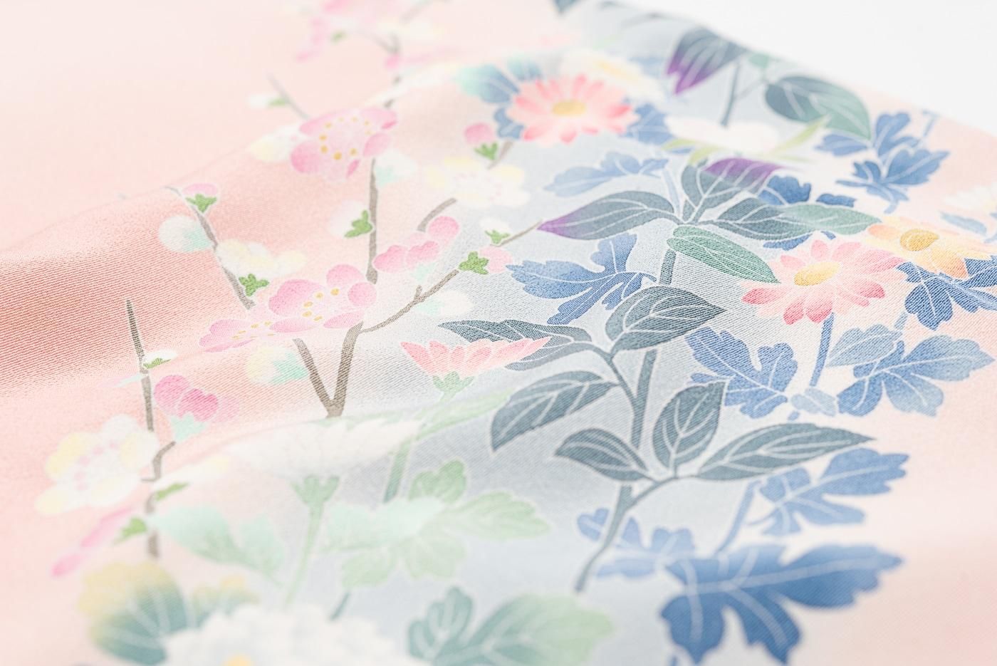 牡丹、梅、椿、菊などの花がスワッグのように斜めに広がる大胆なデザインになっています。