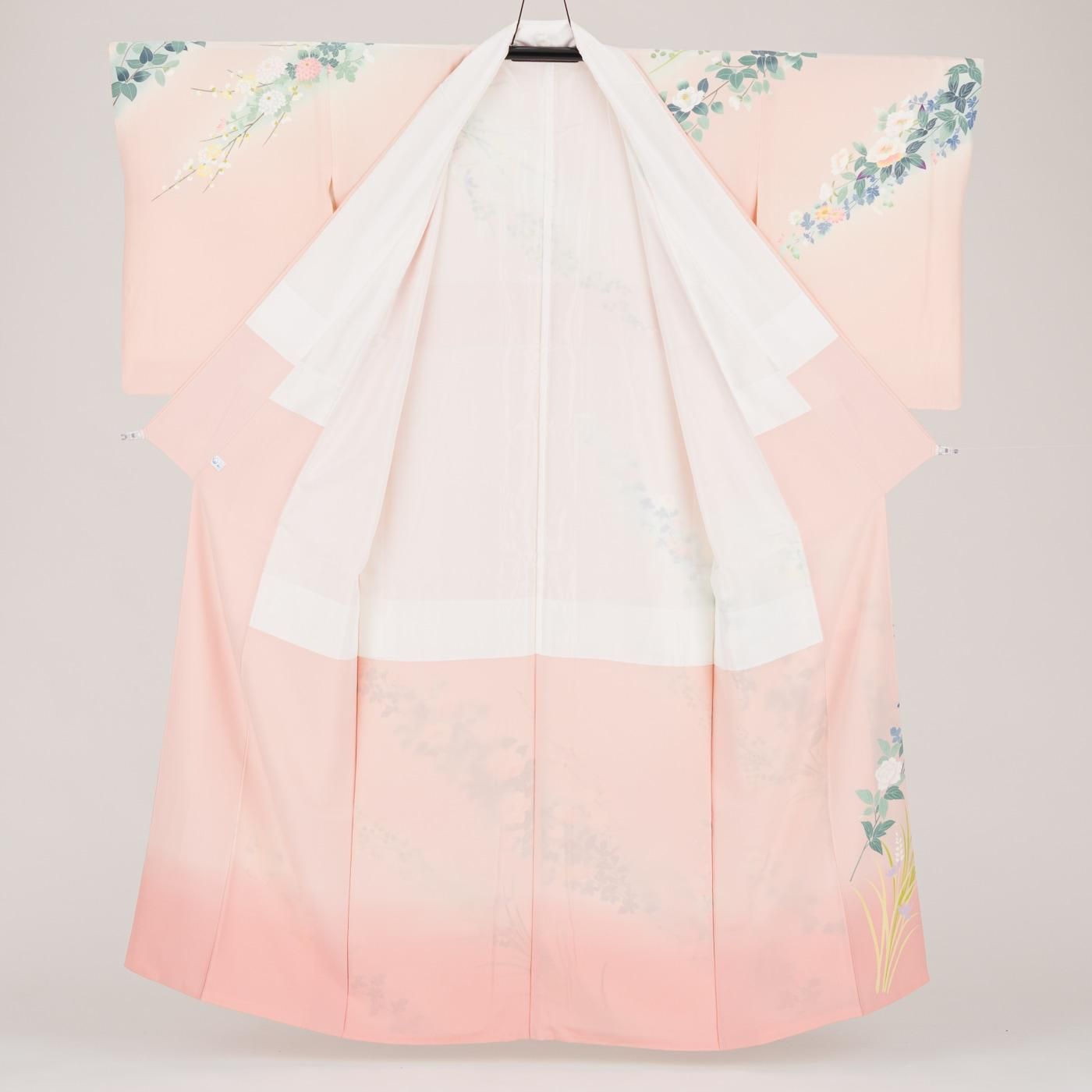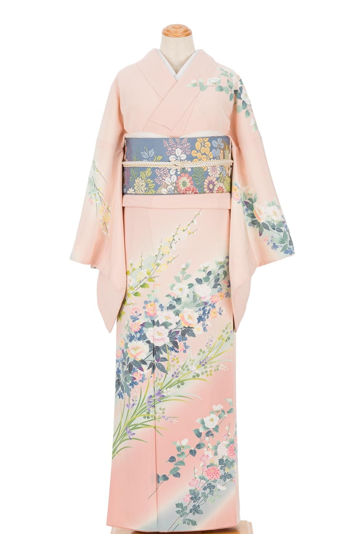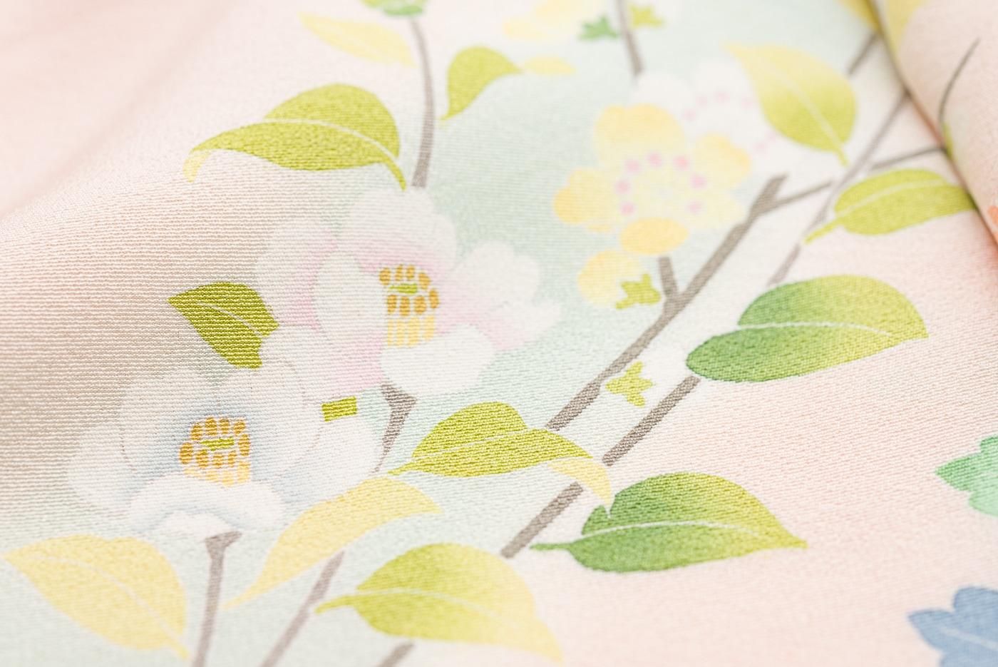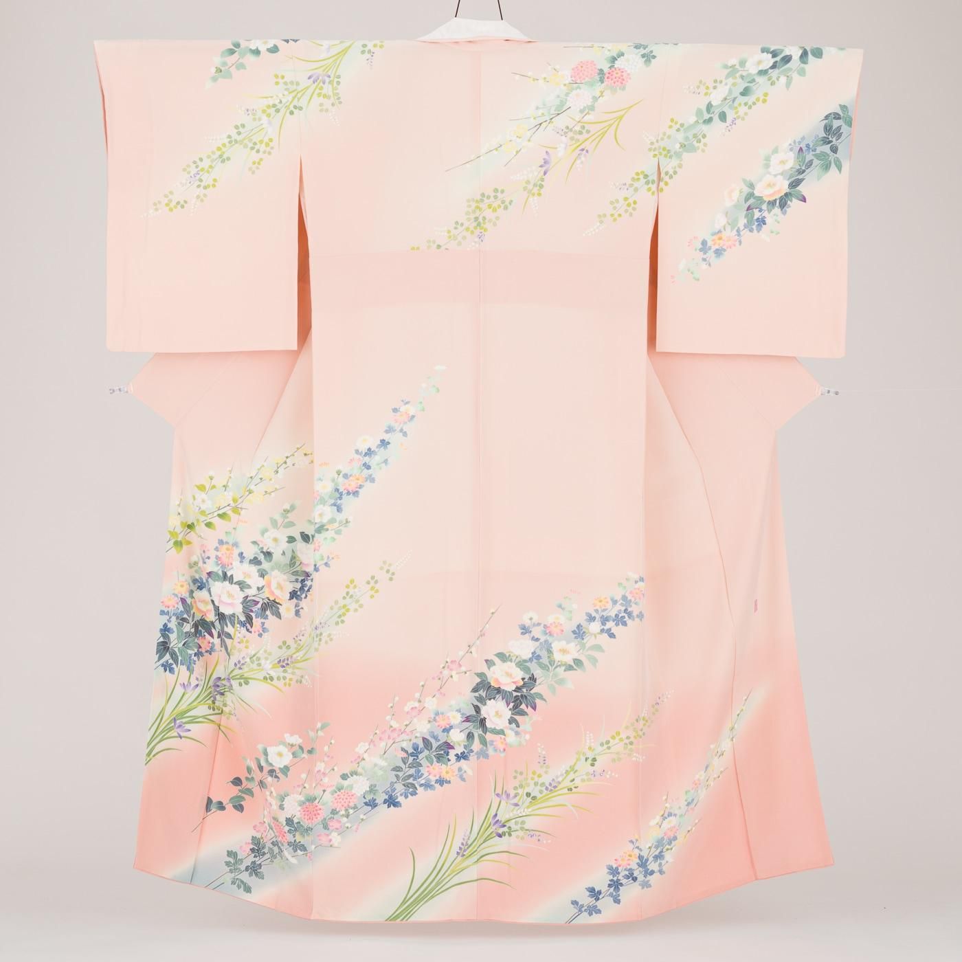 牡丹、梅、椿、菊などの花がスワッグのように斜めに広がる大胆なデザインになっています。