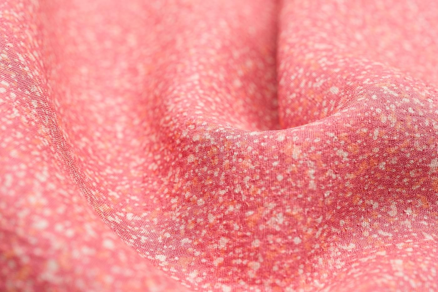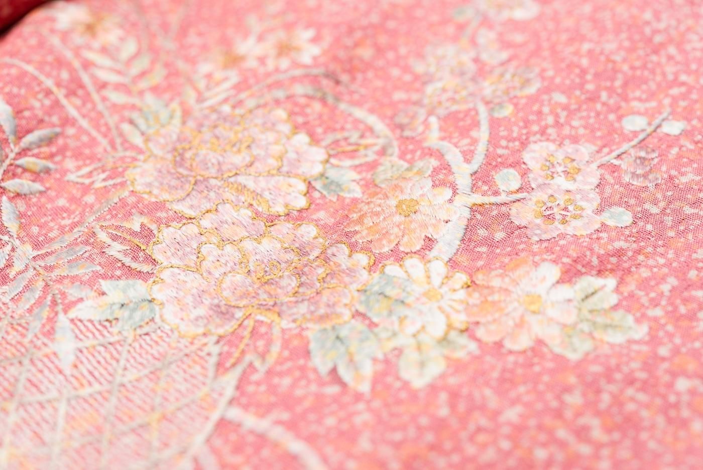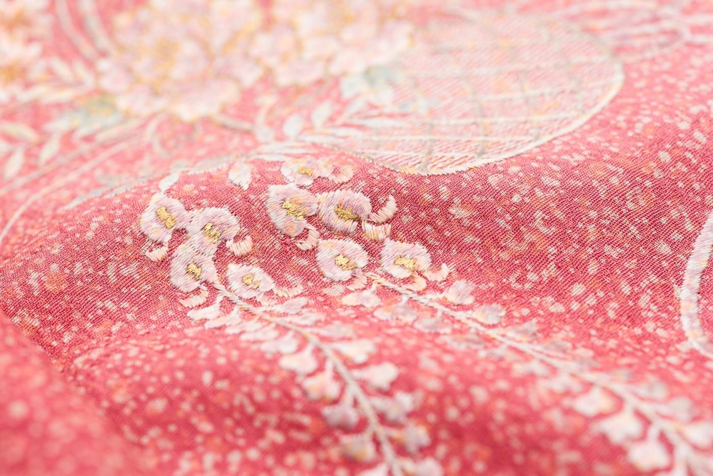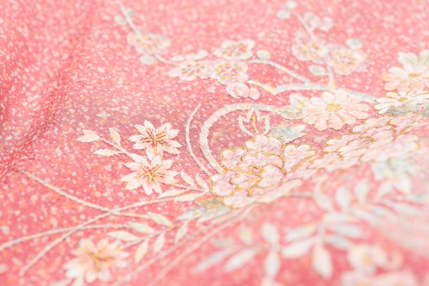 ピンクの濃淡が美しい暈し地に花籠の刺繍を添えた付下げです。
