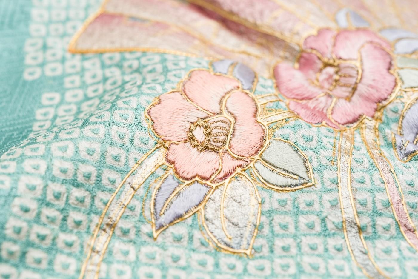 金の縁取りが美しい、檜扇にぽってりとした椿の刺繍を添えた訪問着です。