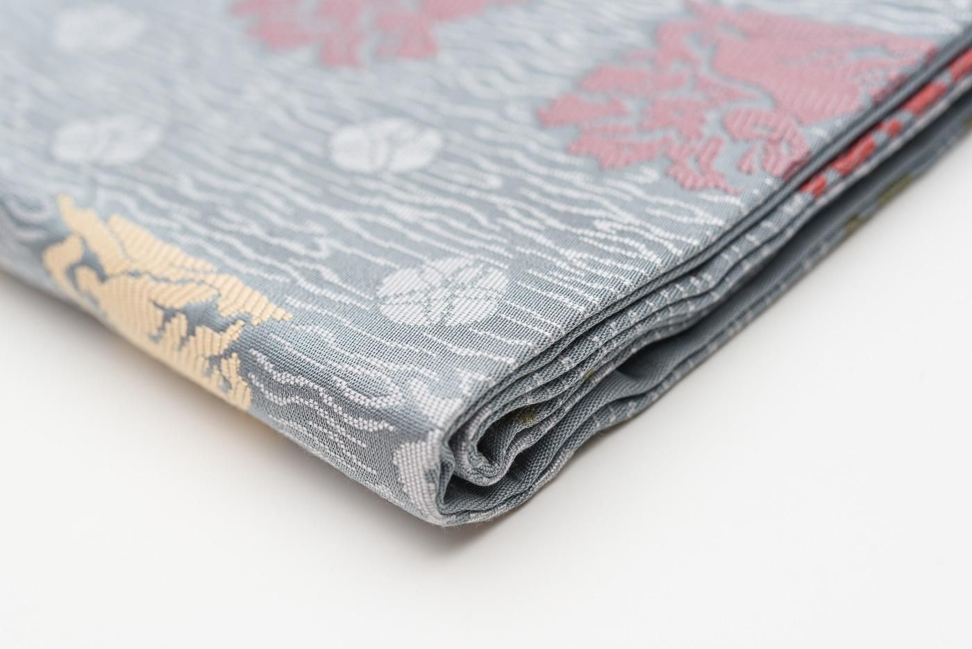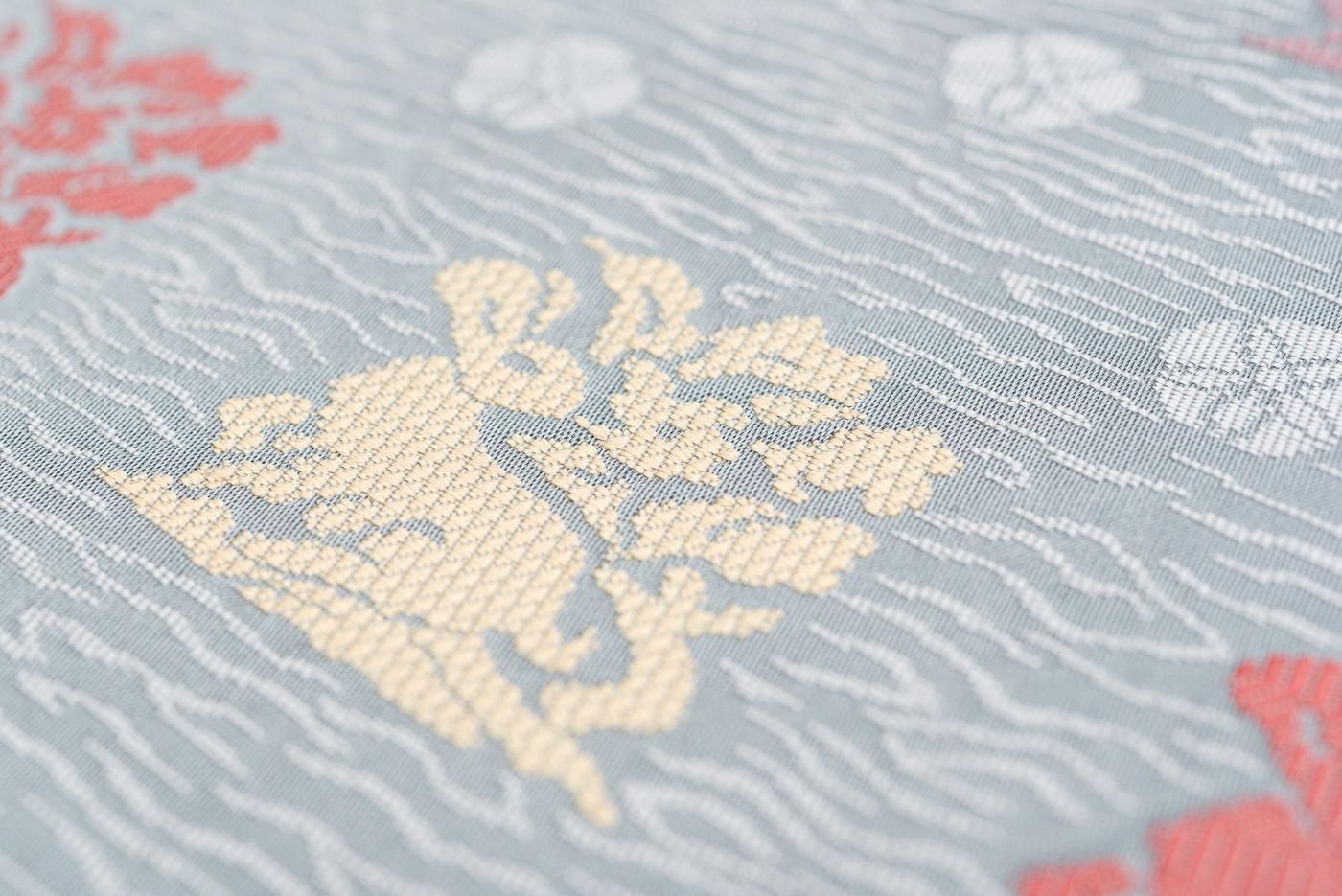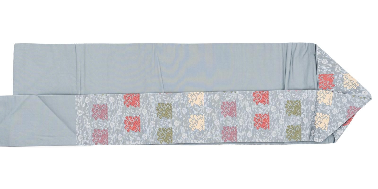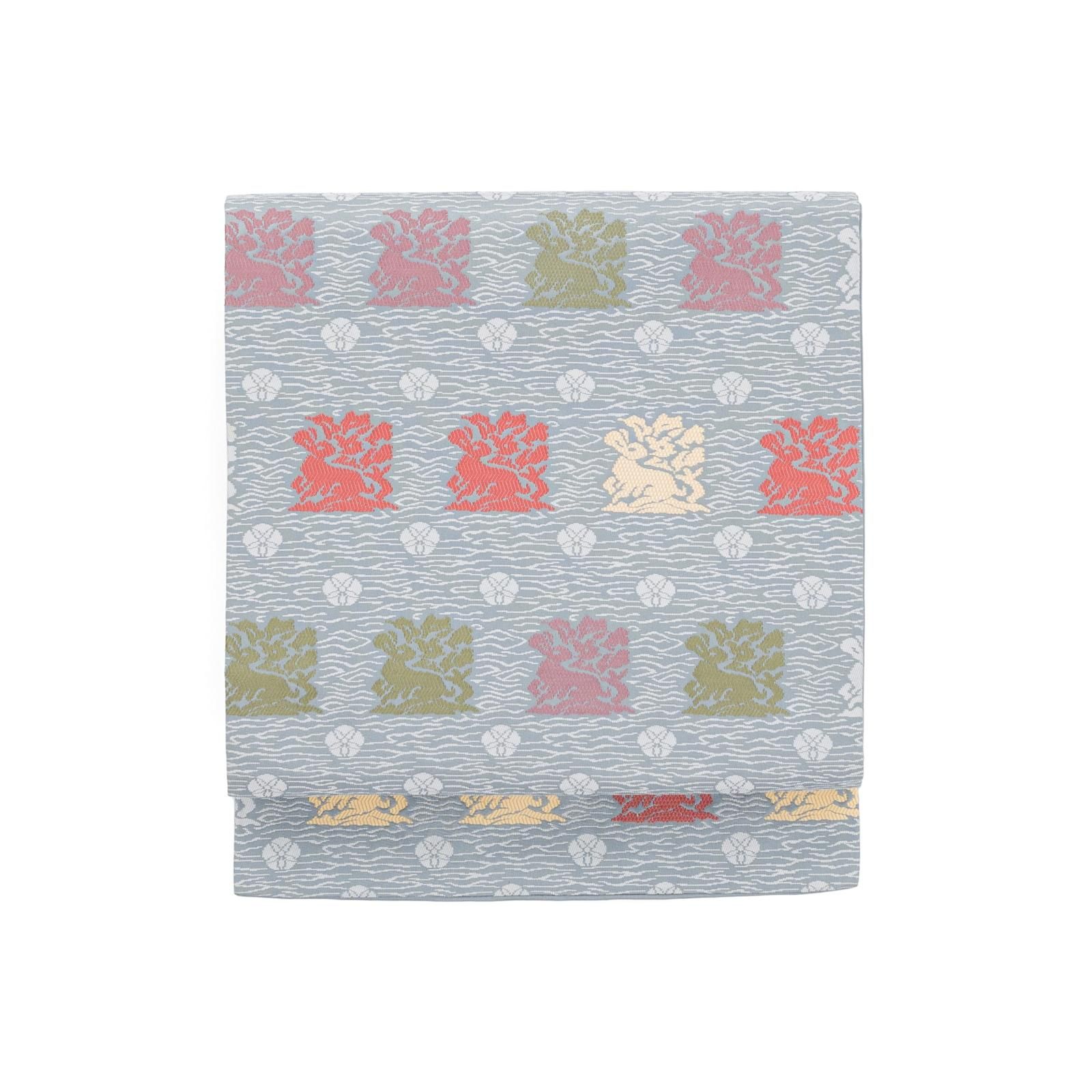 ブルーグレーの地に花兎模様を織り出した九寸名古屋帯です。