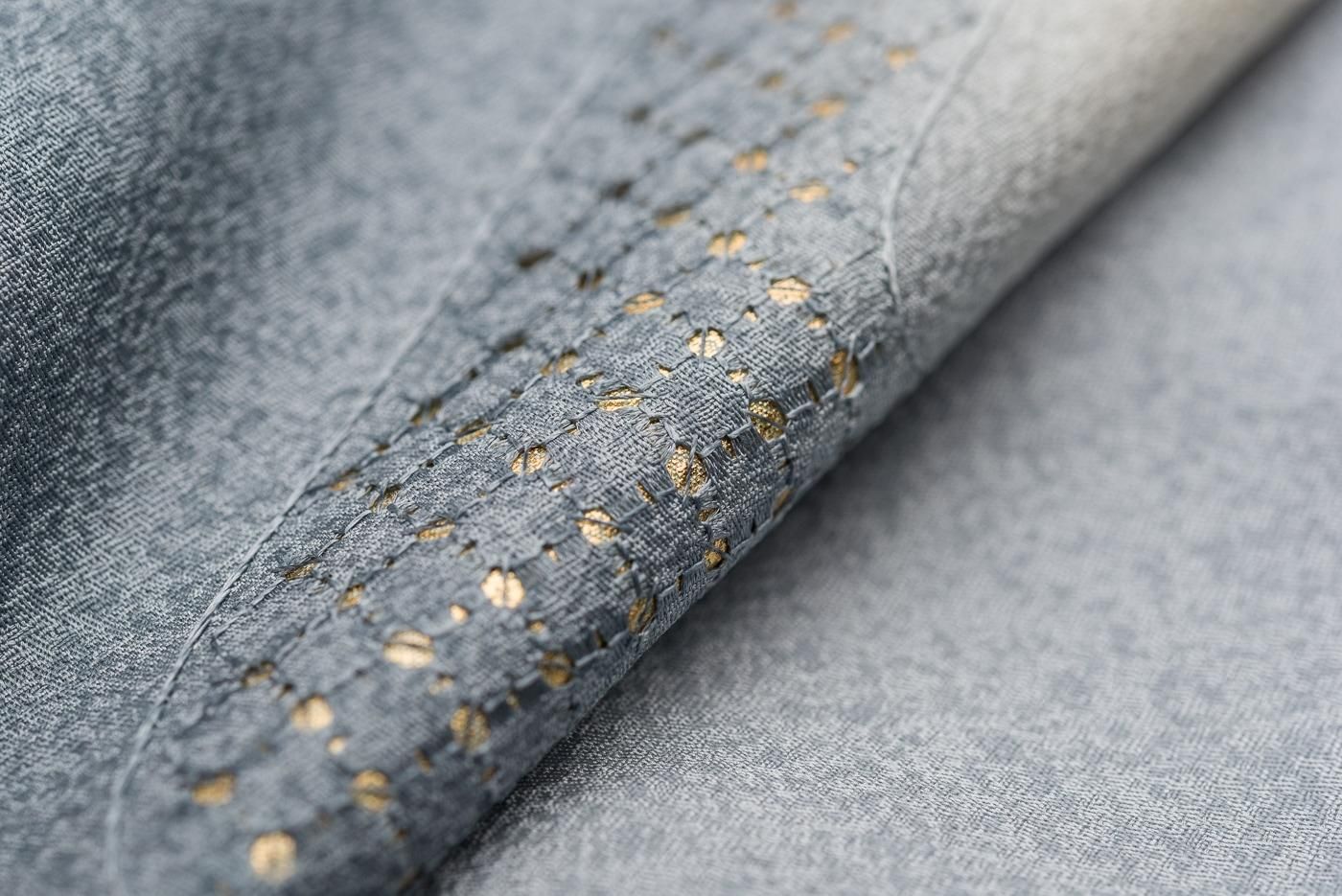 落ち着いた青の地に束ね熨斗と椿を刺繍した訪問着です。