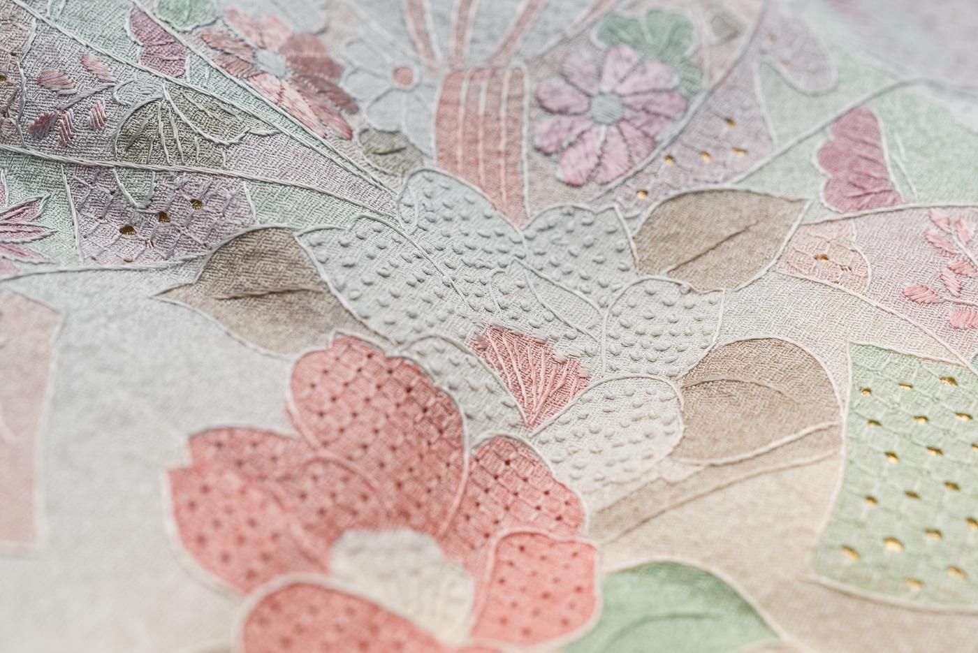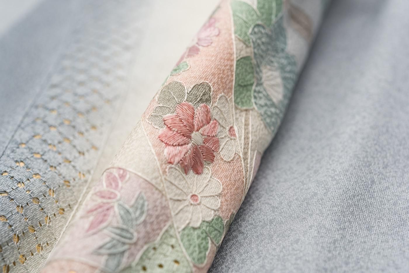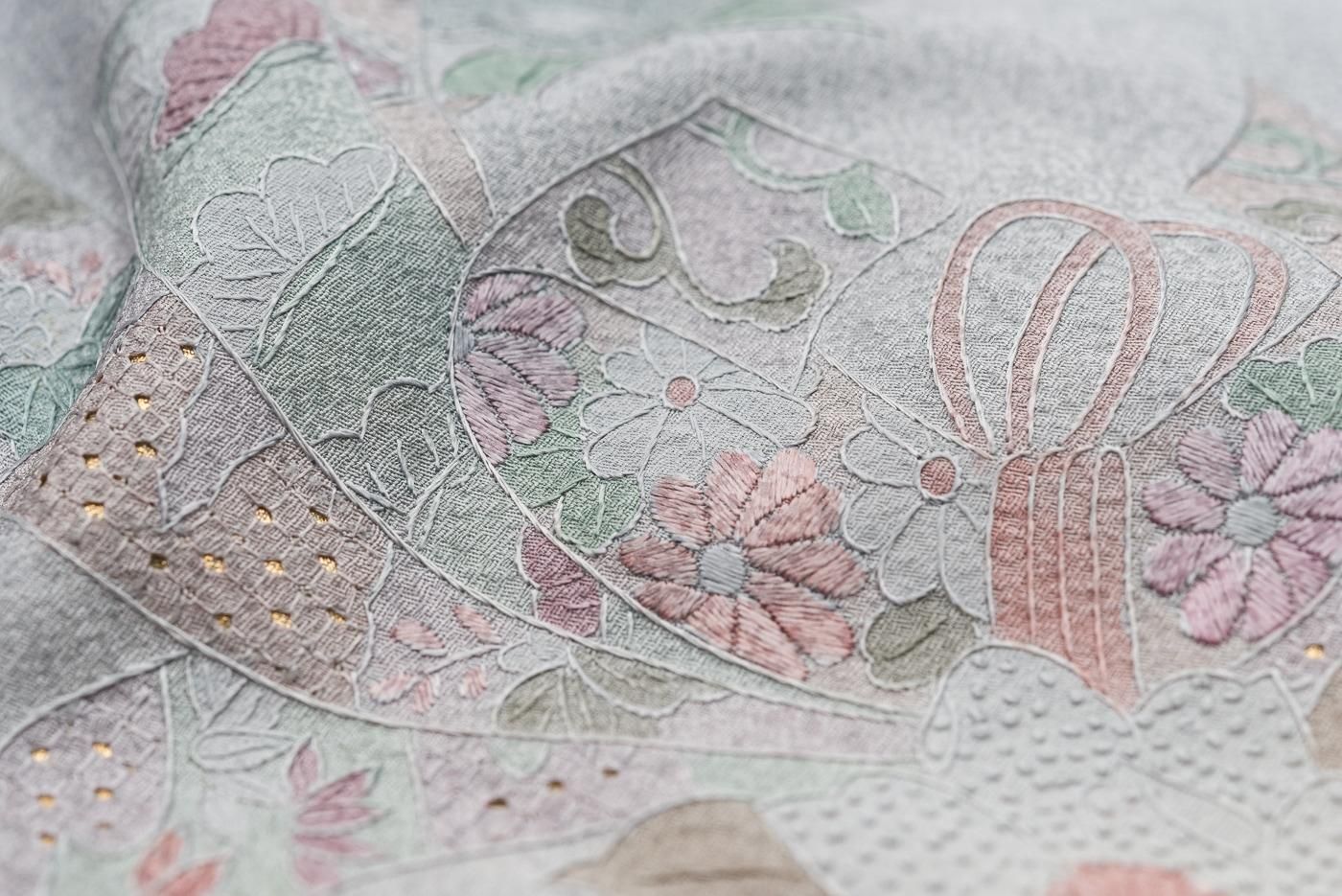 【売り切れ】 訪問着 汕頭刺繍 束ね熨斗と枝花 ホーム »訪問着 汕頭刺繍 束ね熨斗と枝花