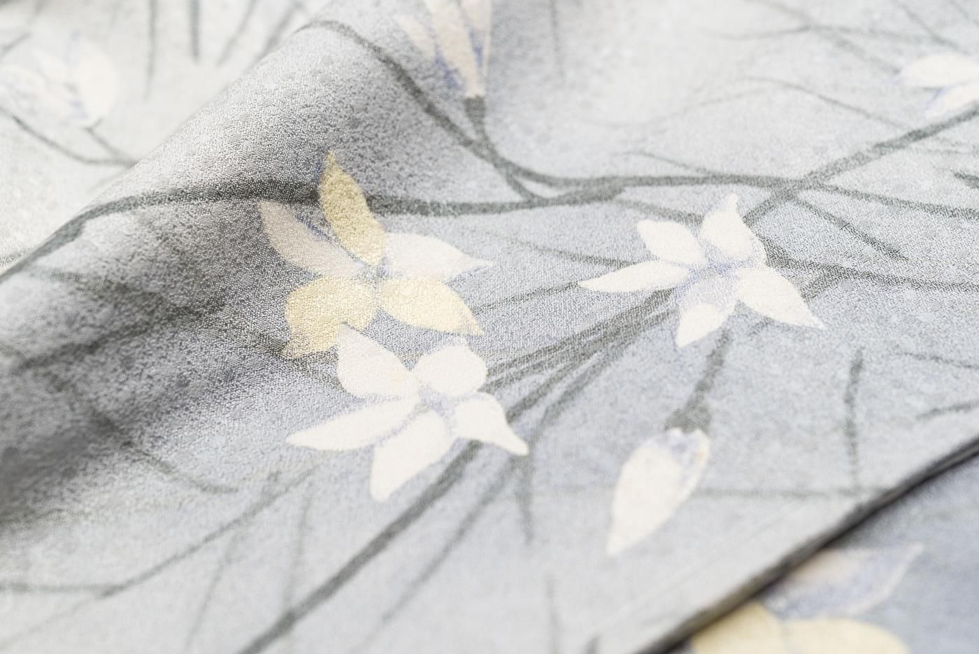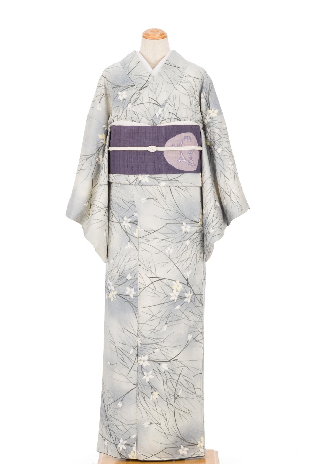 ブルーグレーの暈し地に白花を染めた小紋の着物です。