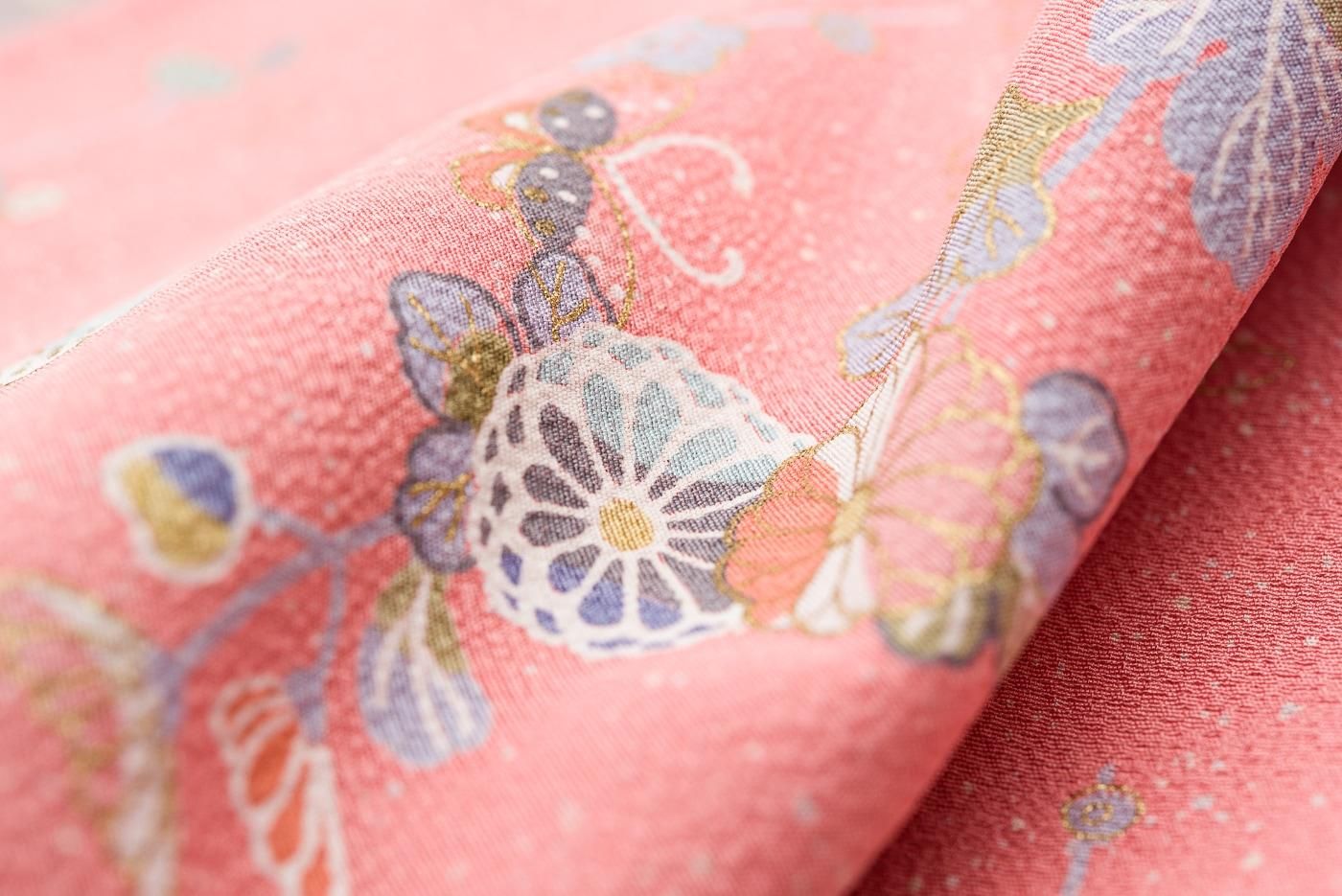 ピンクや白など優しいお色目をベースにデザインされた愛らしい雰囲気の着物ですよ。