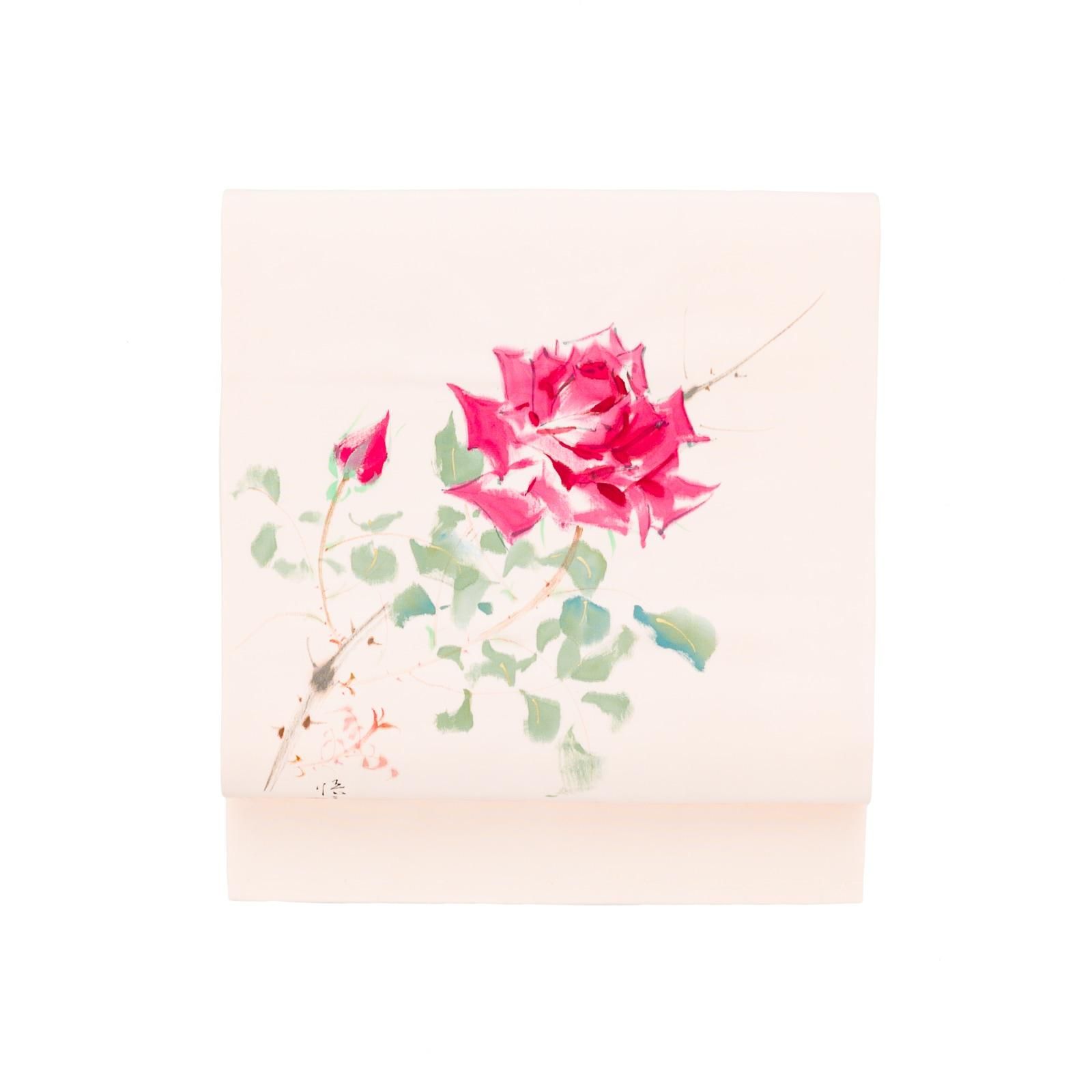 ほんのり桃色がかった塩瀬の地に薔薇の花を描いた九寸名古屋帯です。