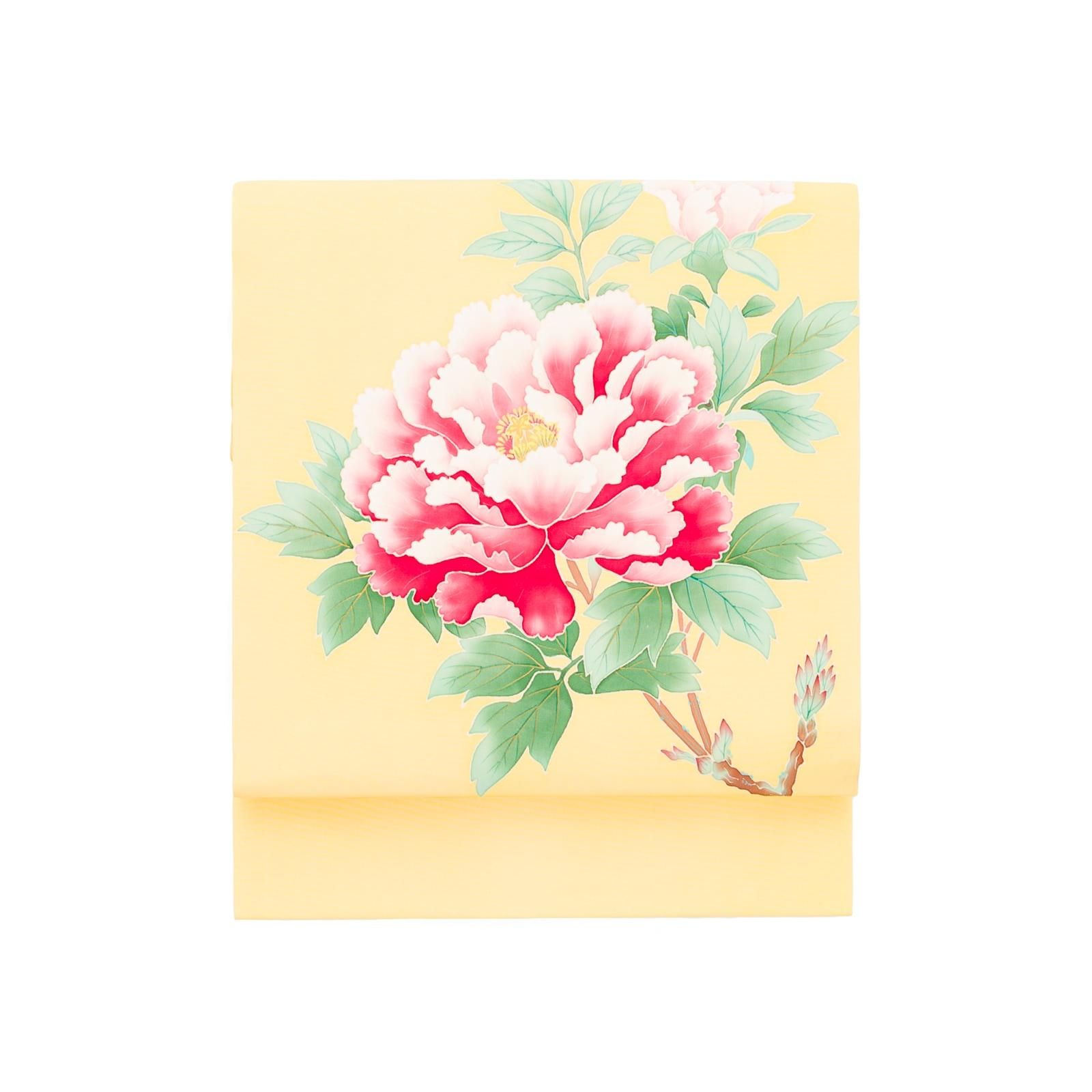 黄色地に大輪の牡丹を描いた塩瀬の九寸名古屋帯です。