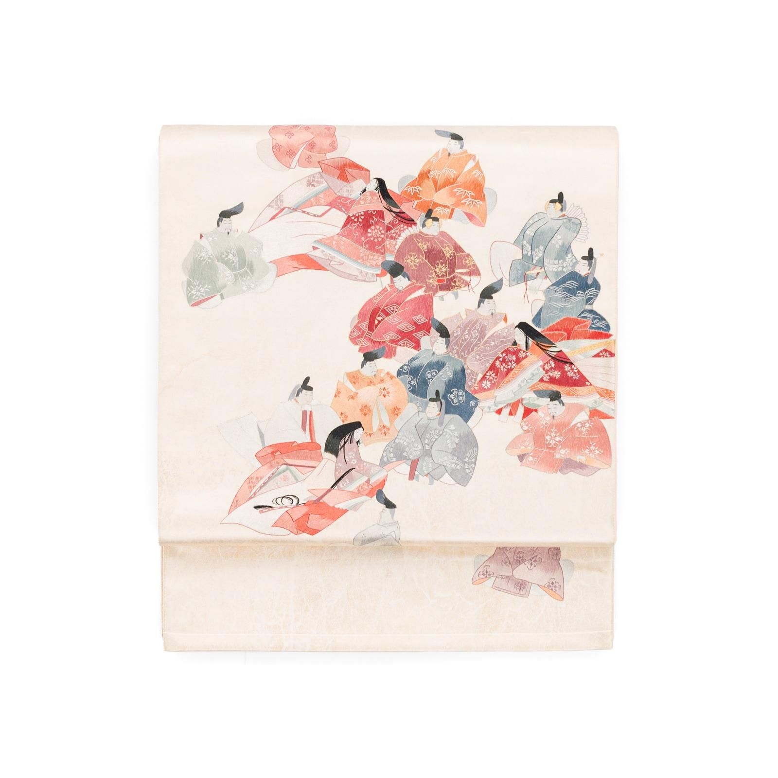 平安装束を身に纏った男女が華やかなお太鼓柄の袋帯です。