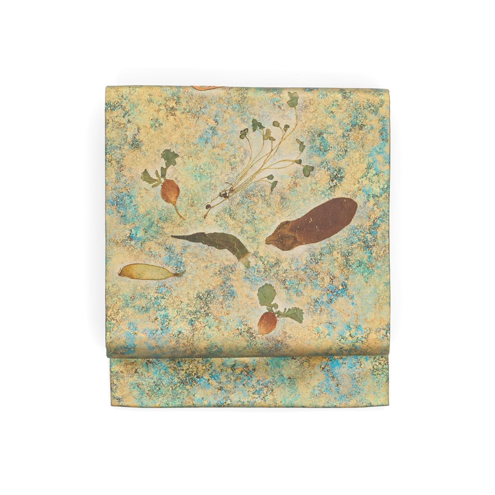 カイワレ、茄子、蓮根、オクラなどの野菜を描いた九寸名古屋帯です。
