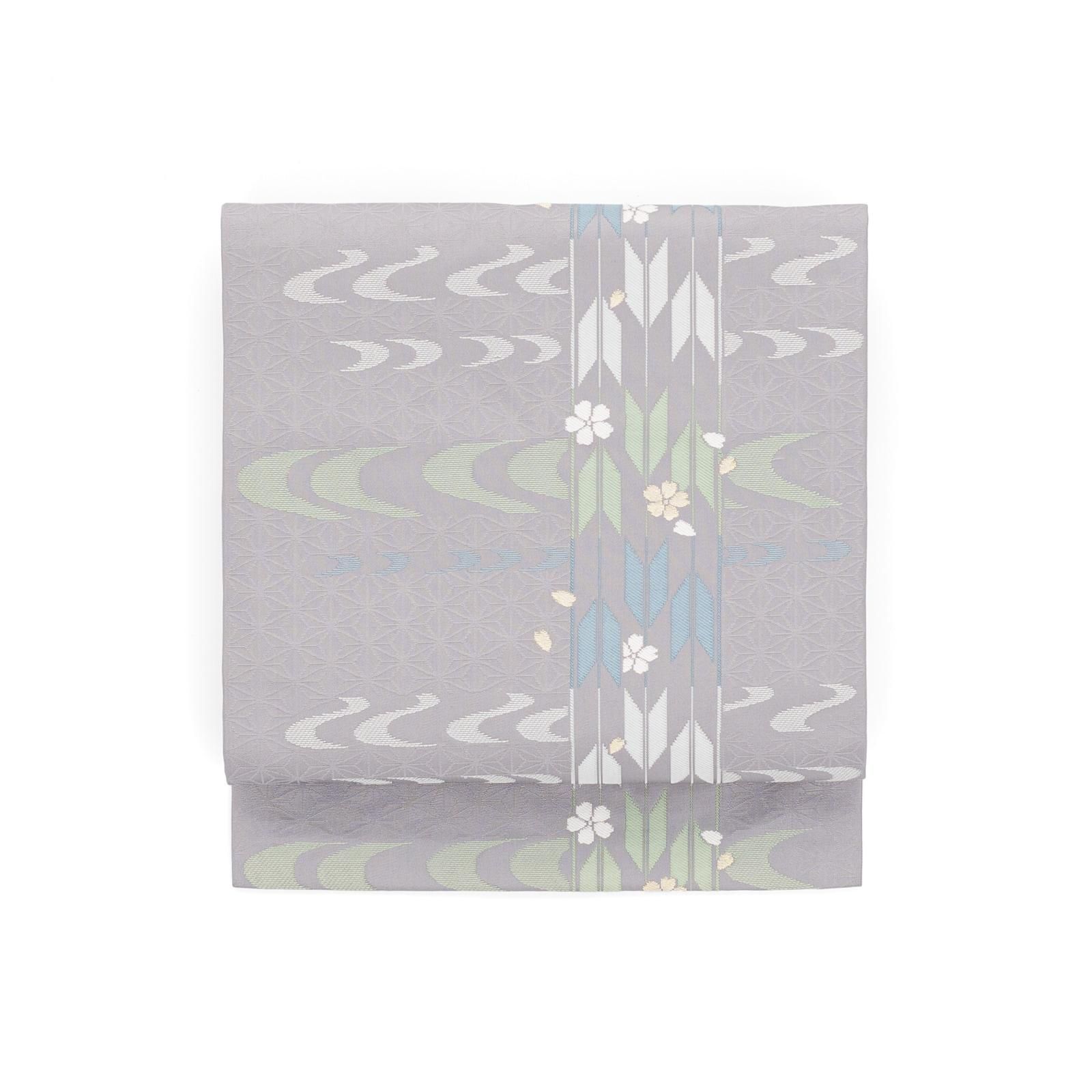 紫がかったグレー地に矢羽根と桜を織り出した九寸名古屋帯です。