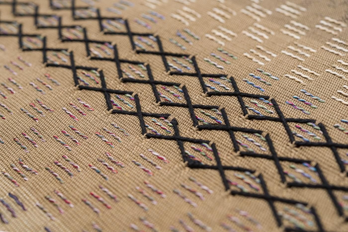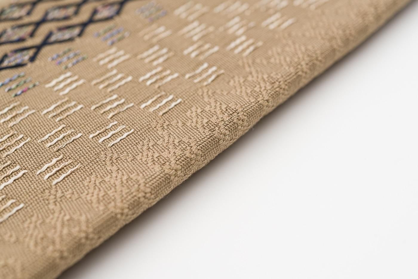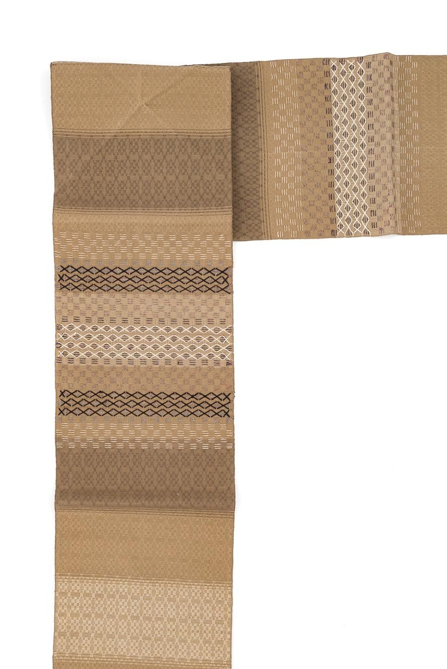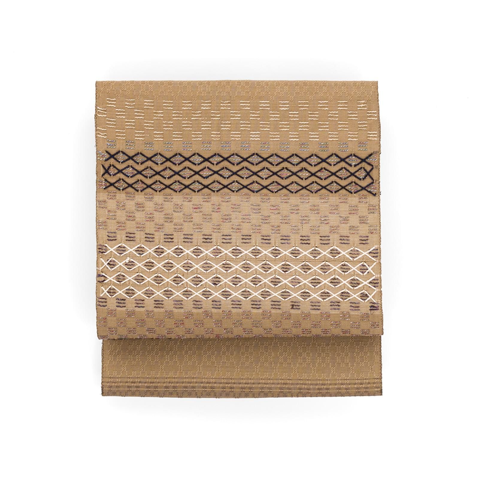 茶ベージュの地に網目のような模様を織り出した八寸名古屋帯です。