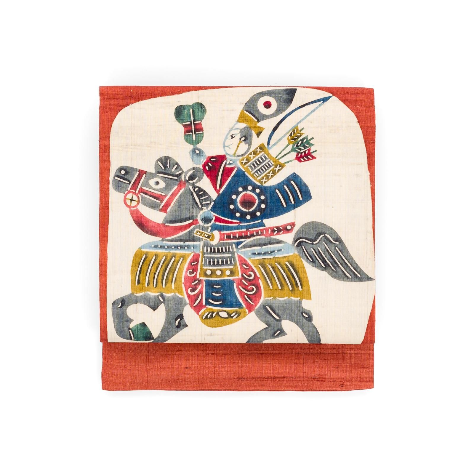 大きな騎馬武者の姿が印象的な型染めの九寸名古屋帯です。