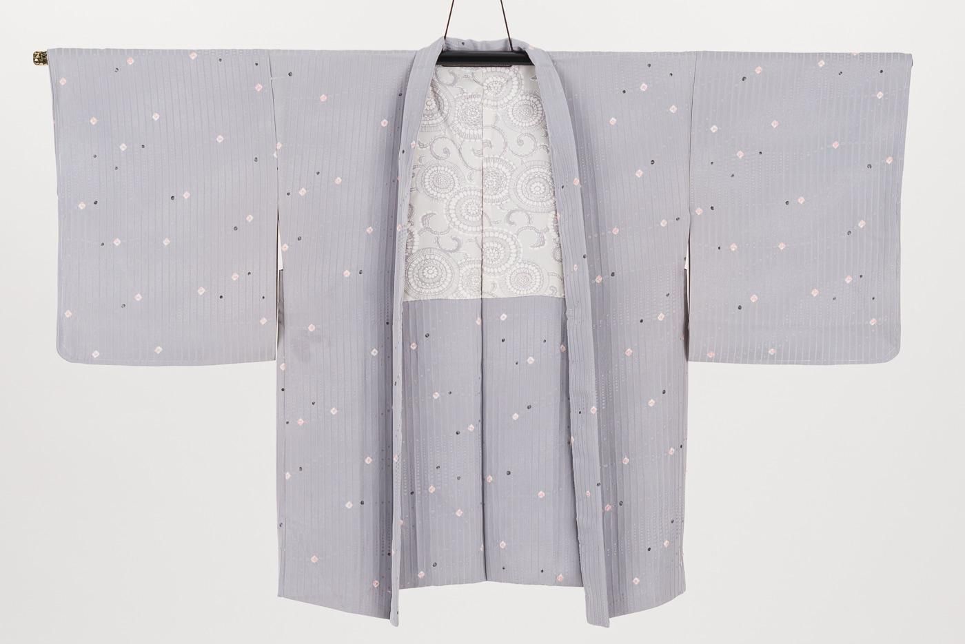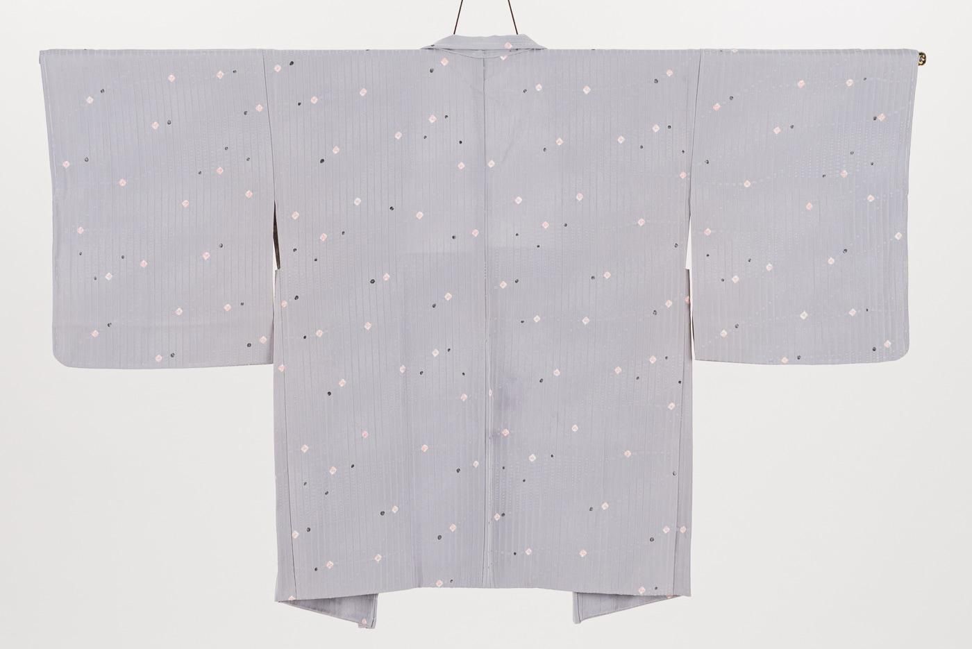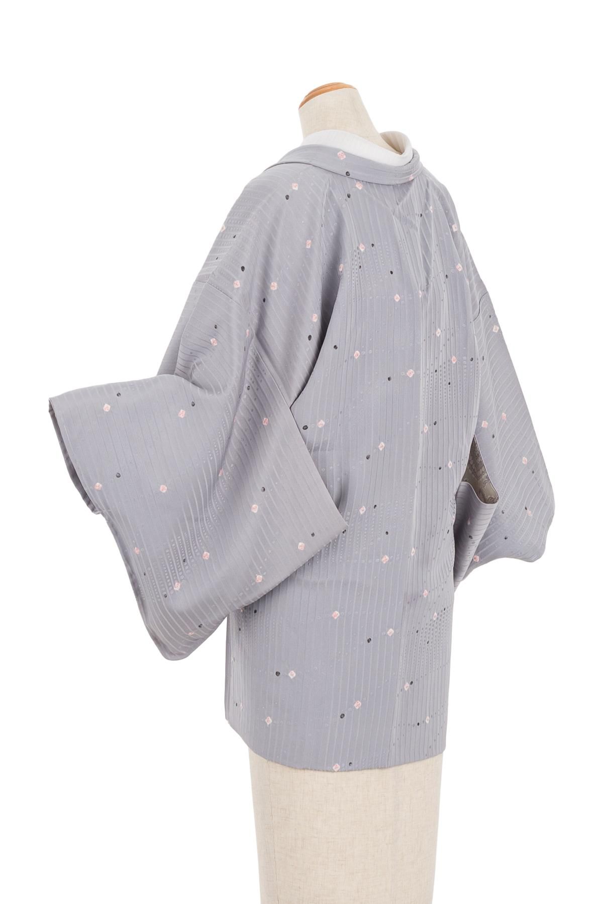優しいグレーの地に絞りの小さなドット柄が浮かぶ羽織です。