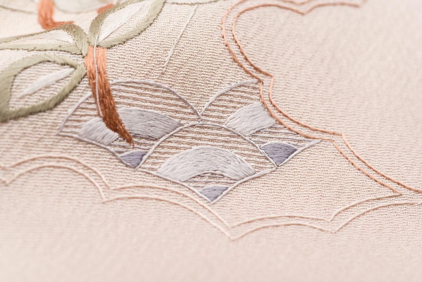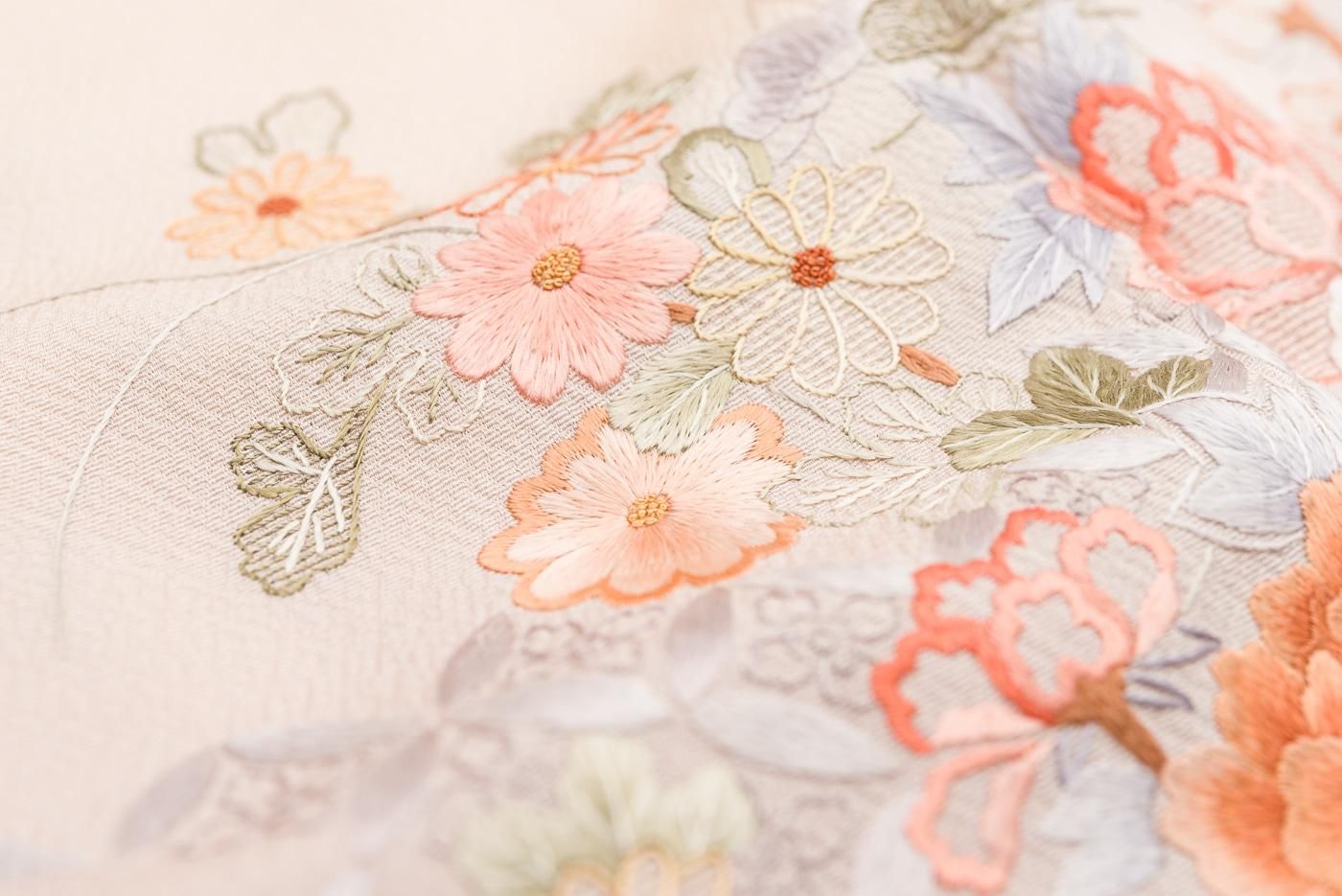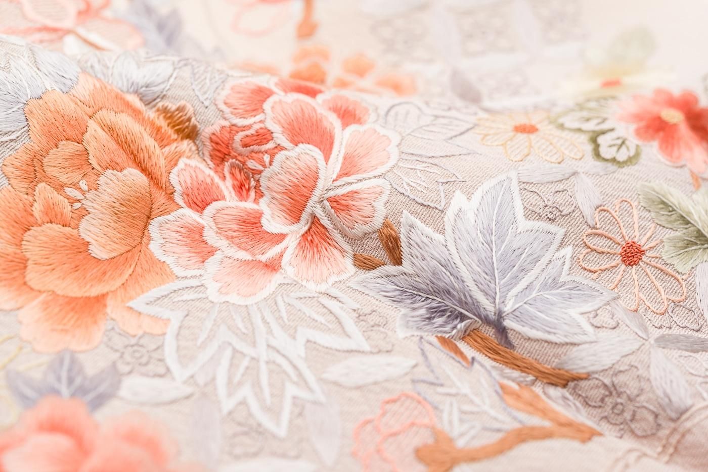 肌なじみの良い優しい地色に品良く華やかな刺繍がぱっと映える大変美しい1枚です。