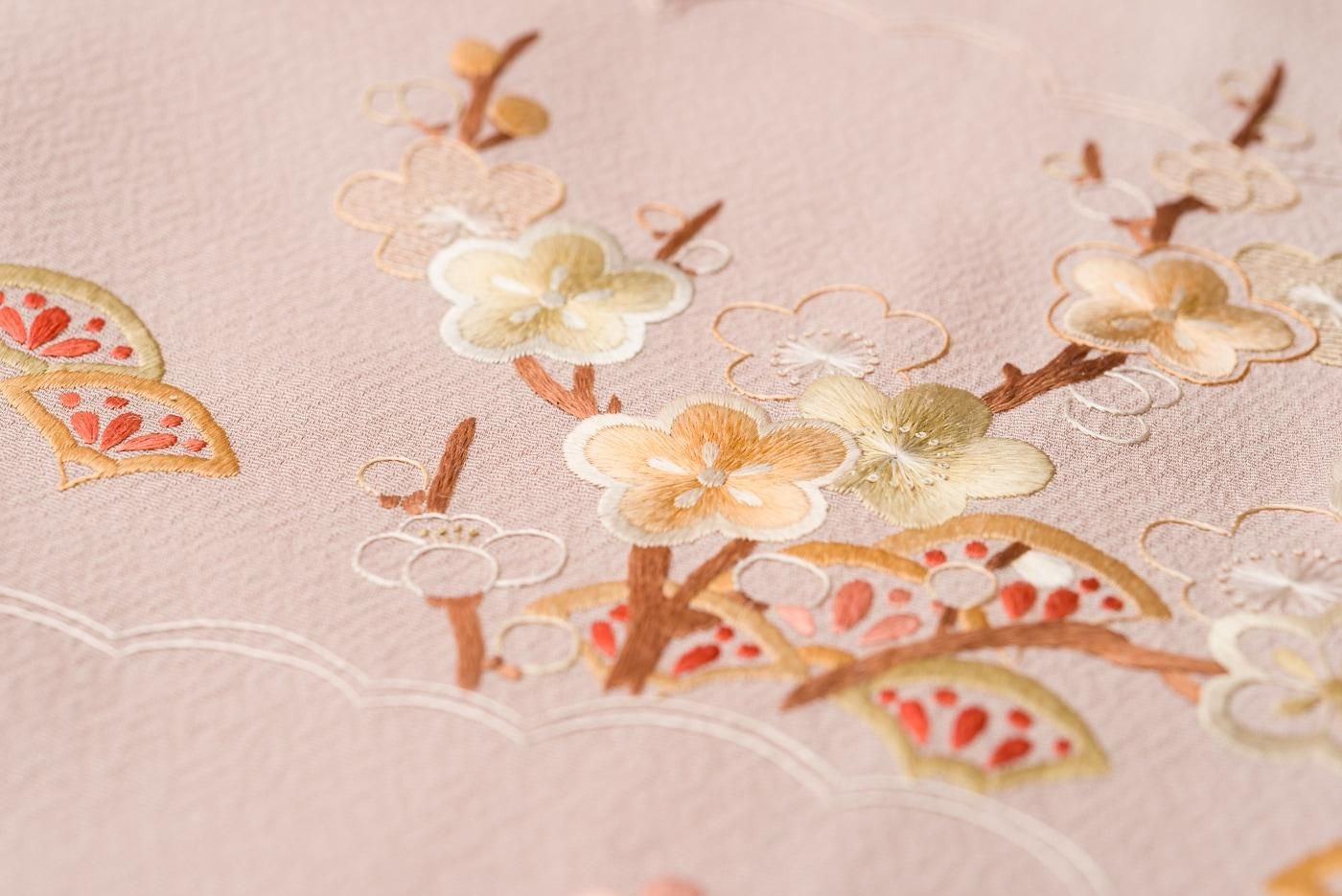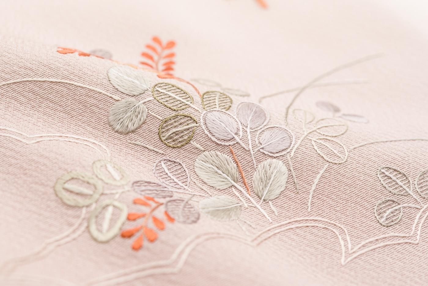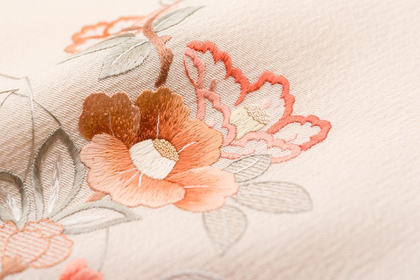 肌なじみの良い優しい地色に品良く華やかな刺繍がぱっと映える大変美しい1枚です。