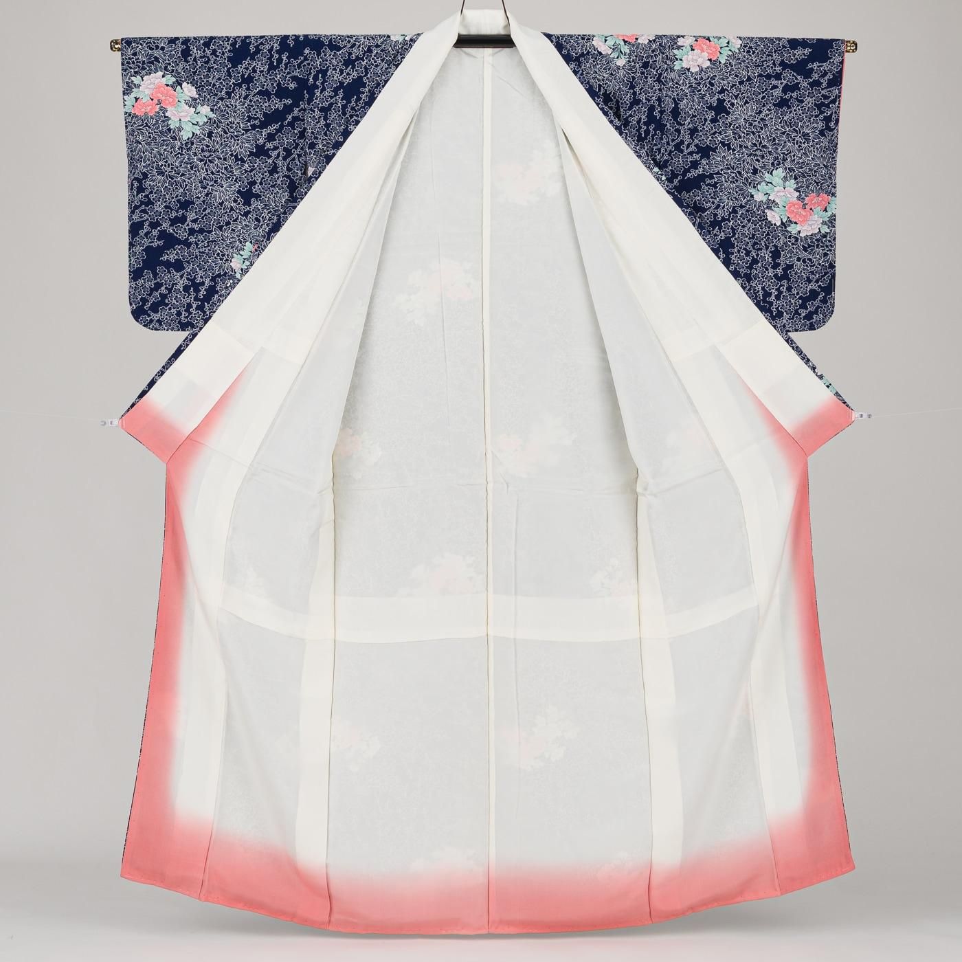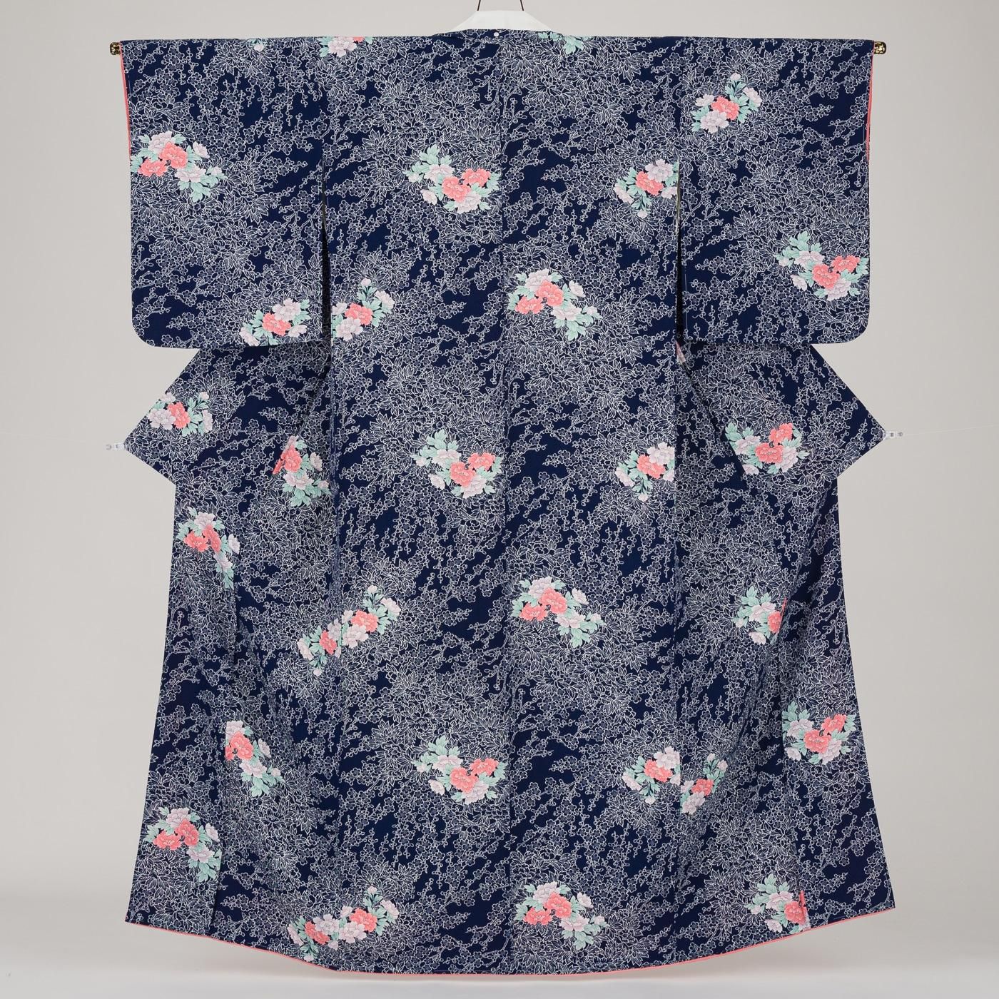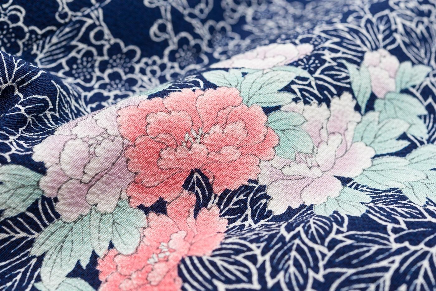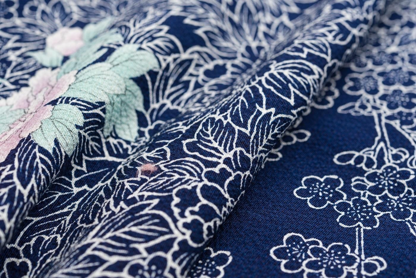 濃紺色の地に牡丹と梅を染めた小紋の着物です。