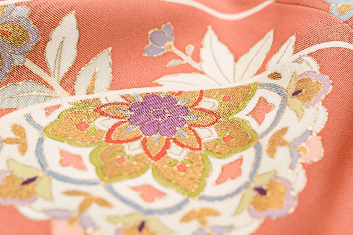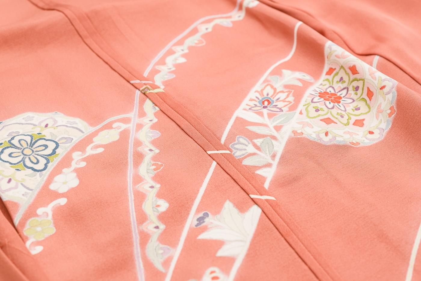 珊瑚朱色の地に華紋や唐花を染めたデザインはどこかエキゾチックな雰囲気。
