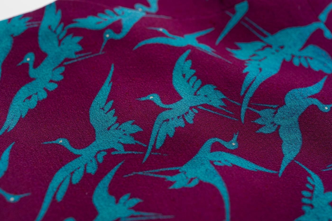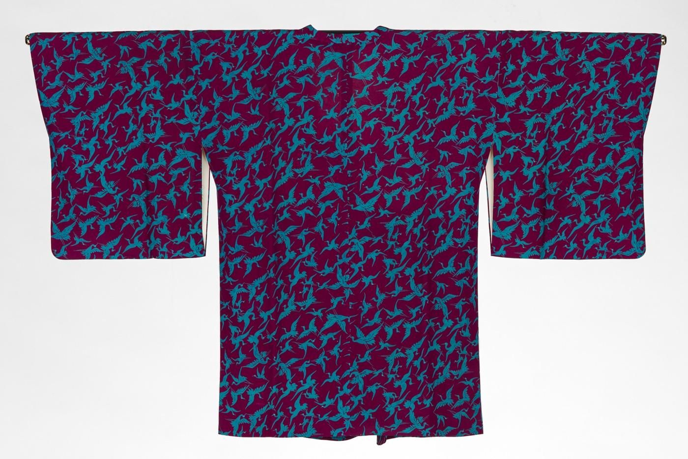 葡萄色の地に鮮やかな青い鶴を染めたアンティークの道行コートです。