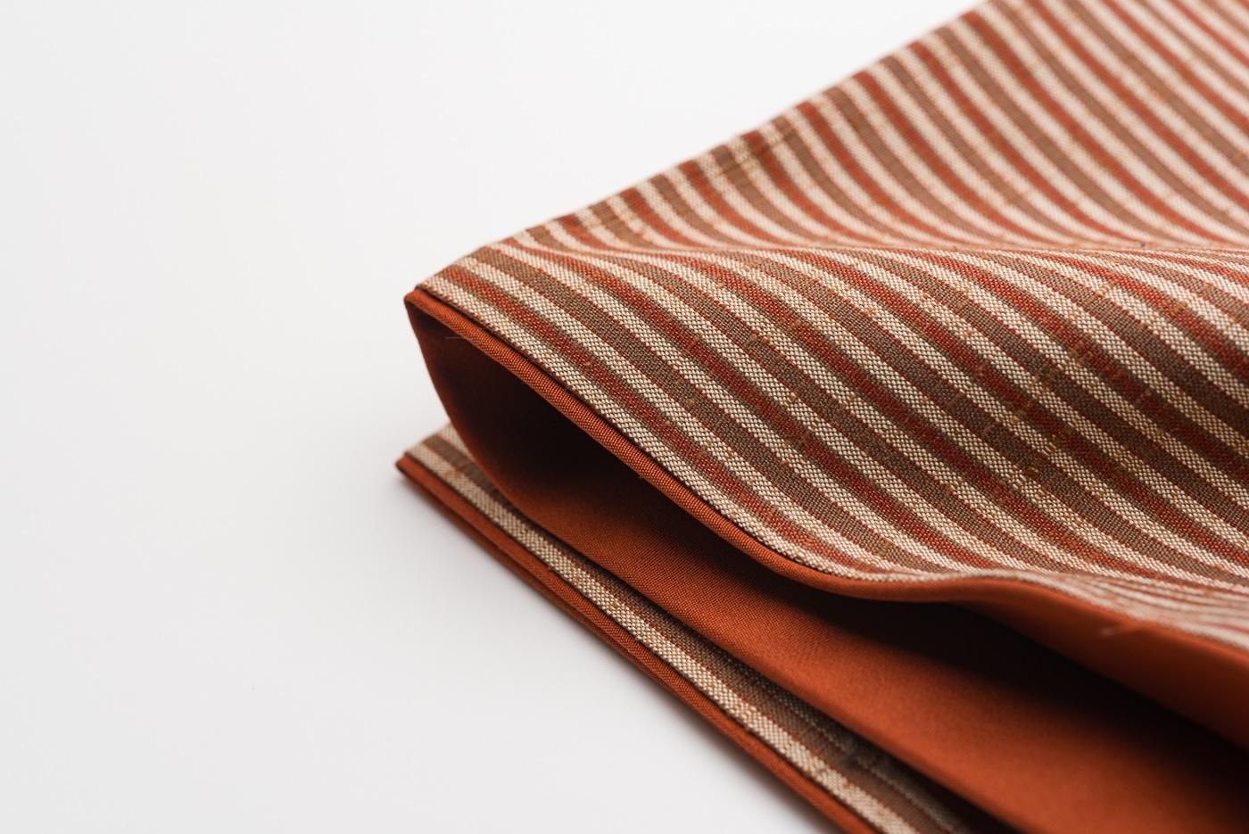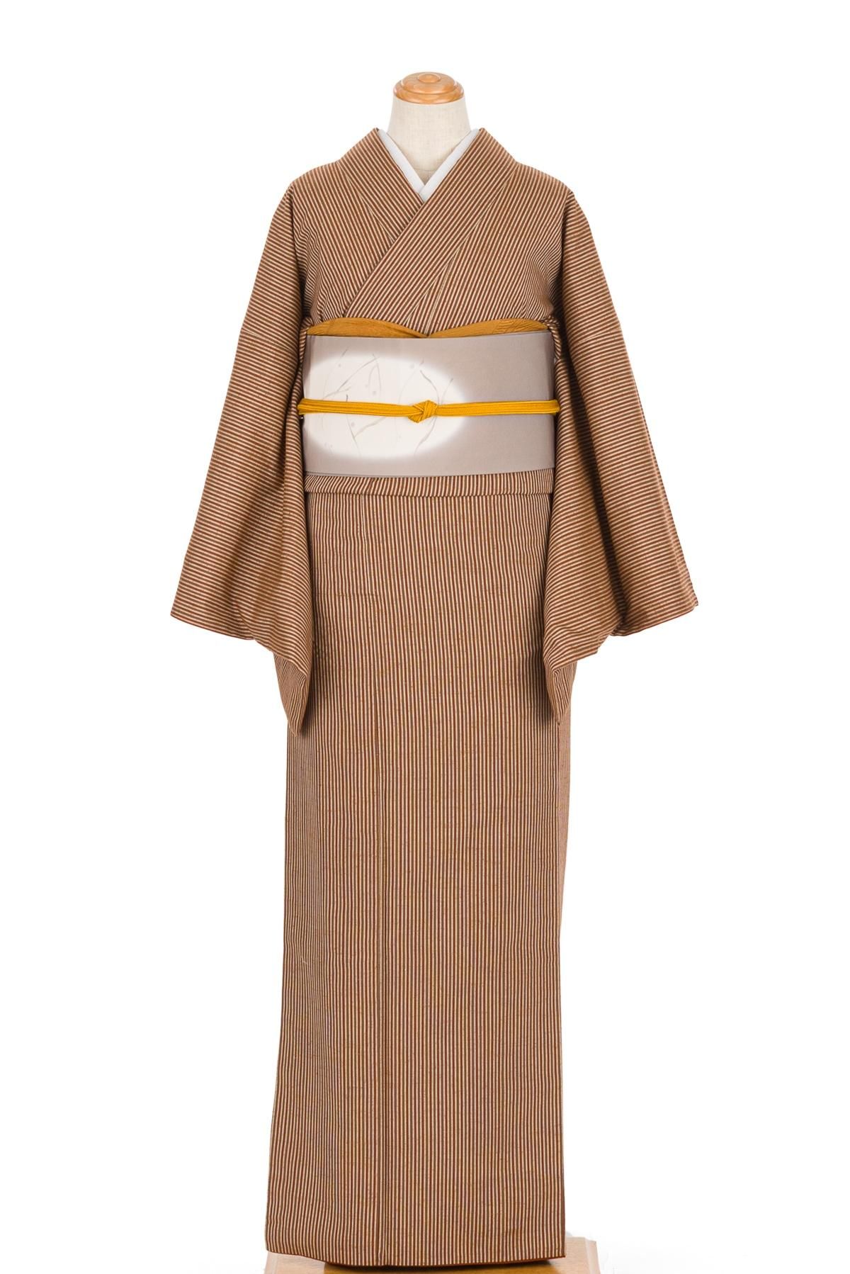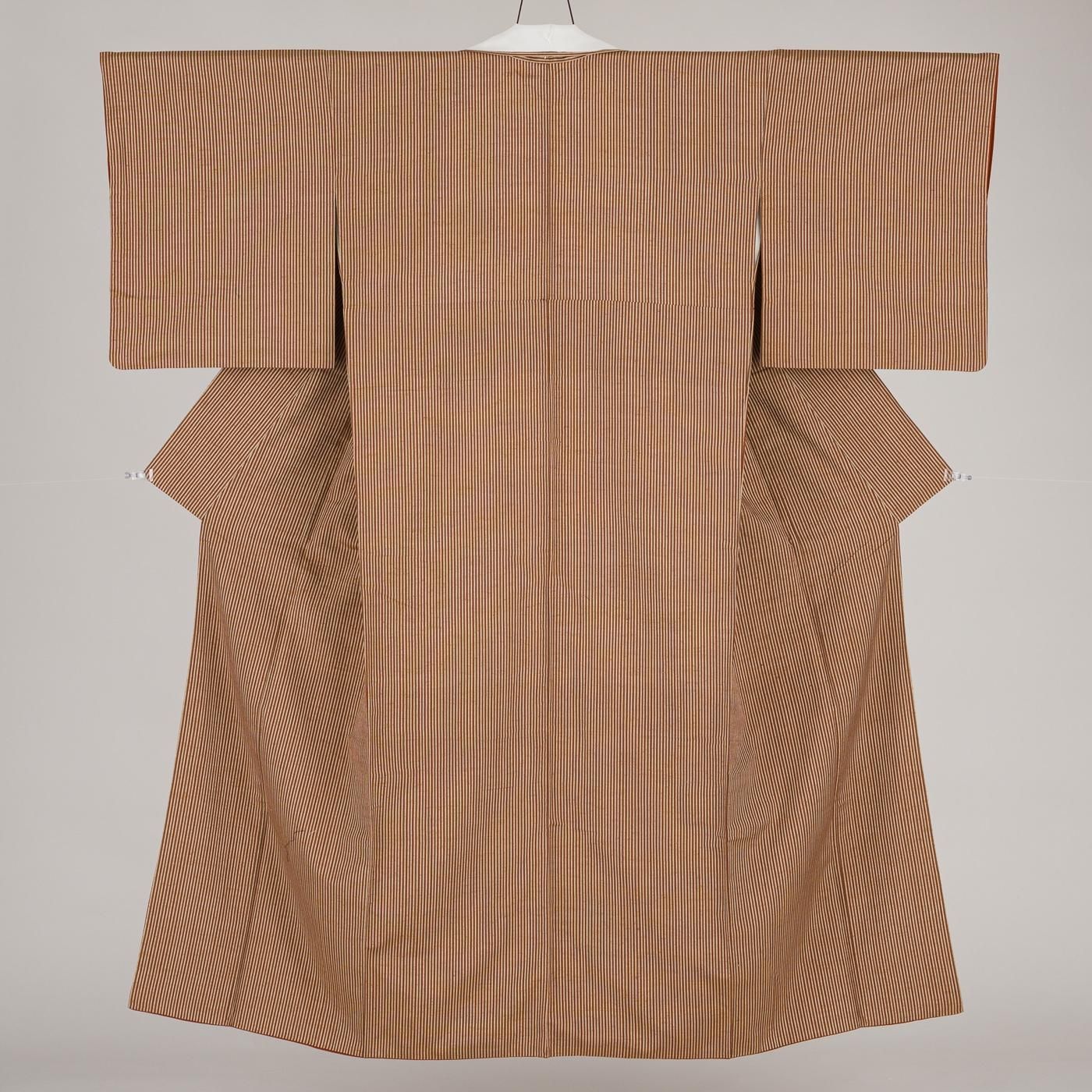 赤茶とベージュを基調に細い縞模様を織り出した紬の着物です。