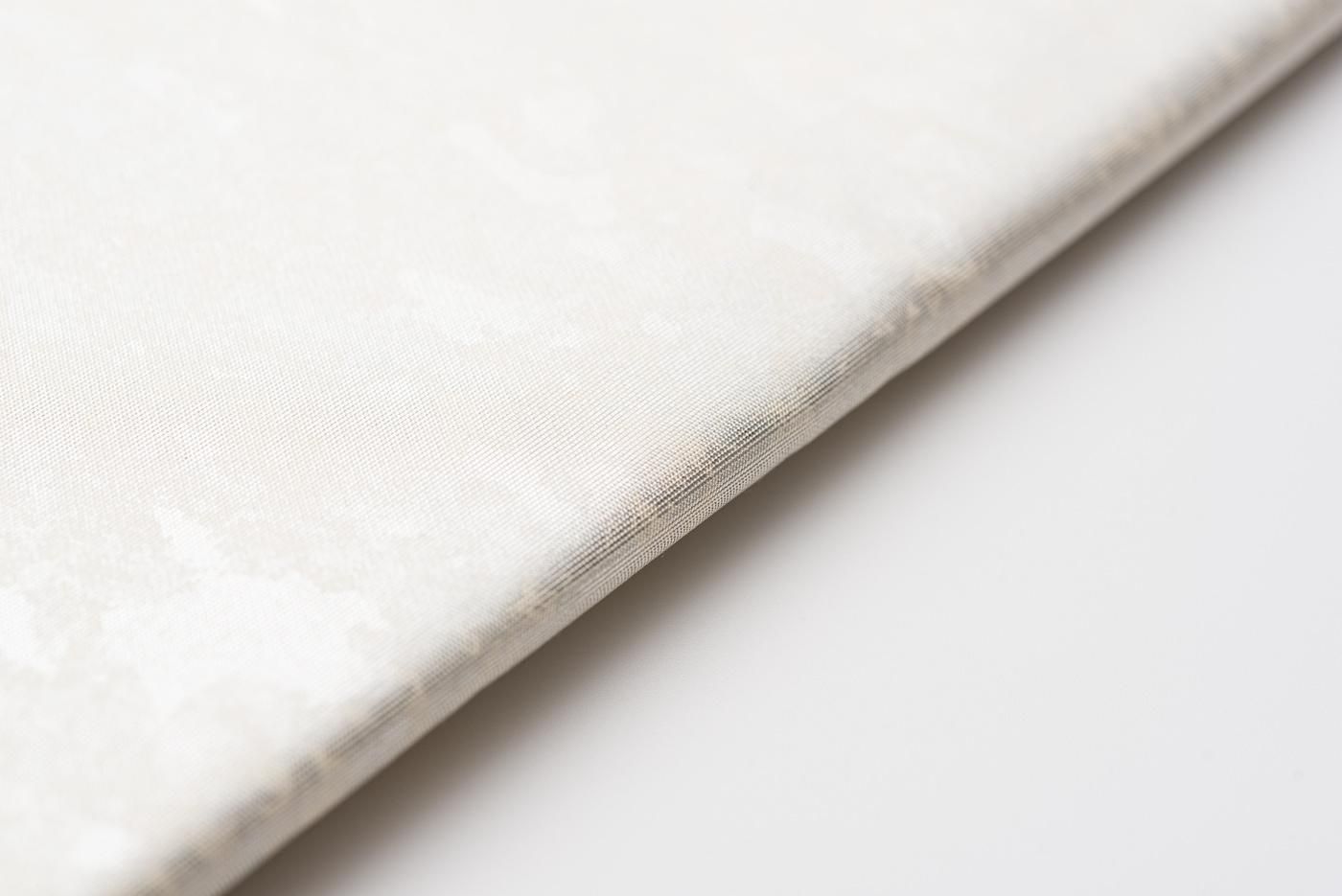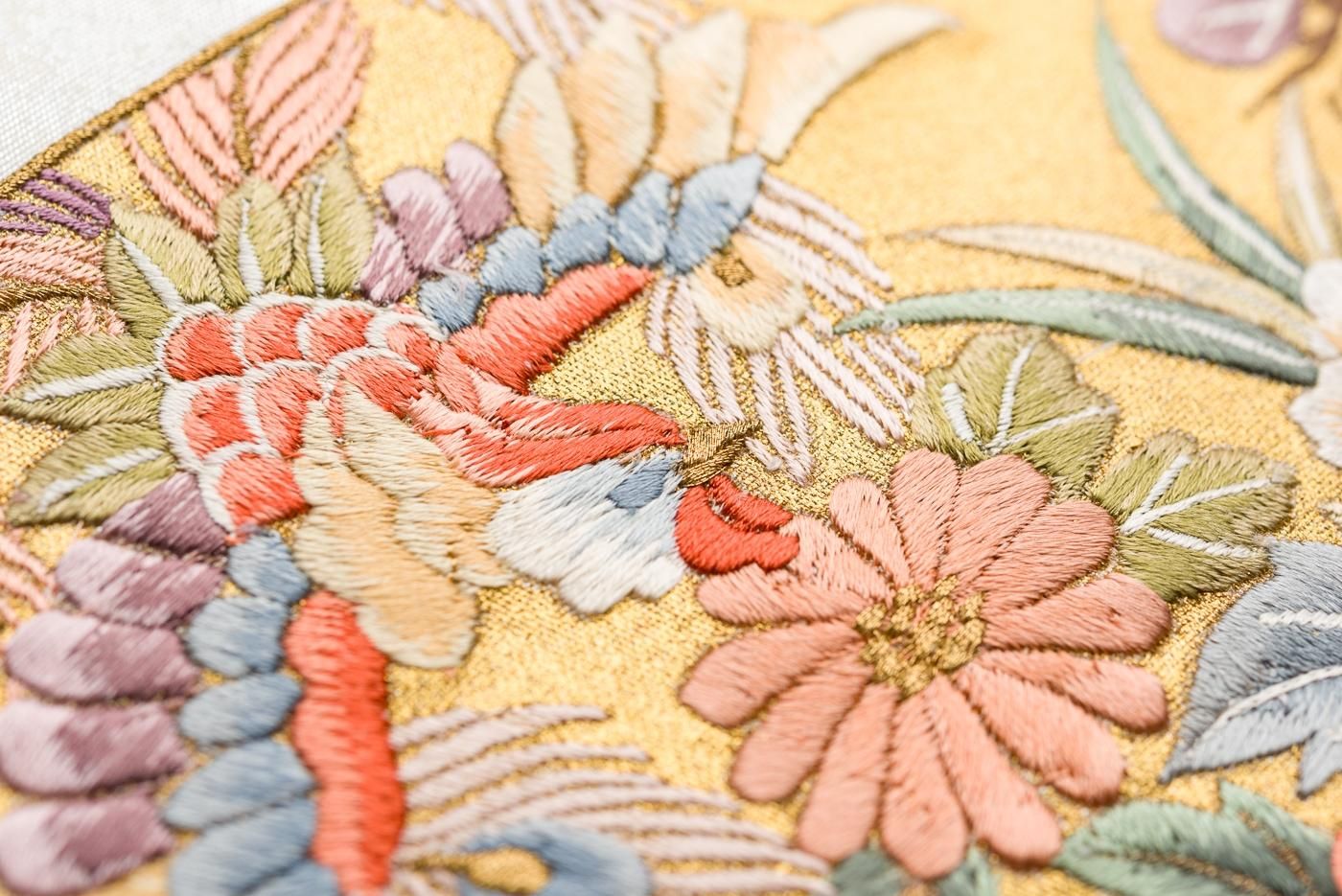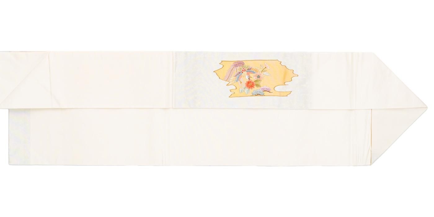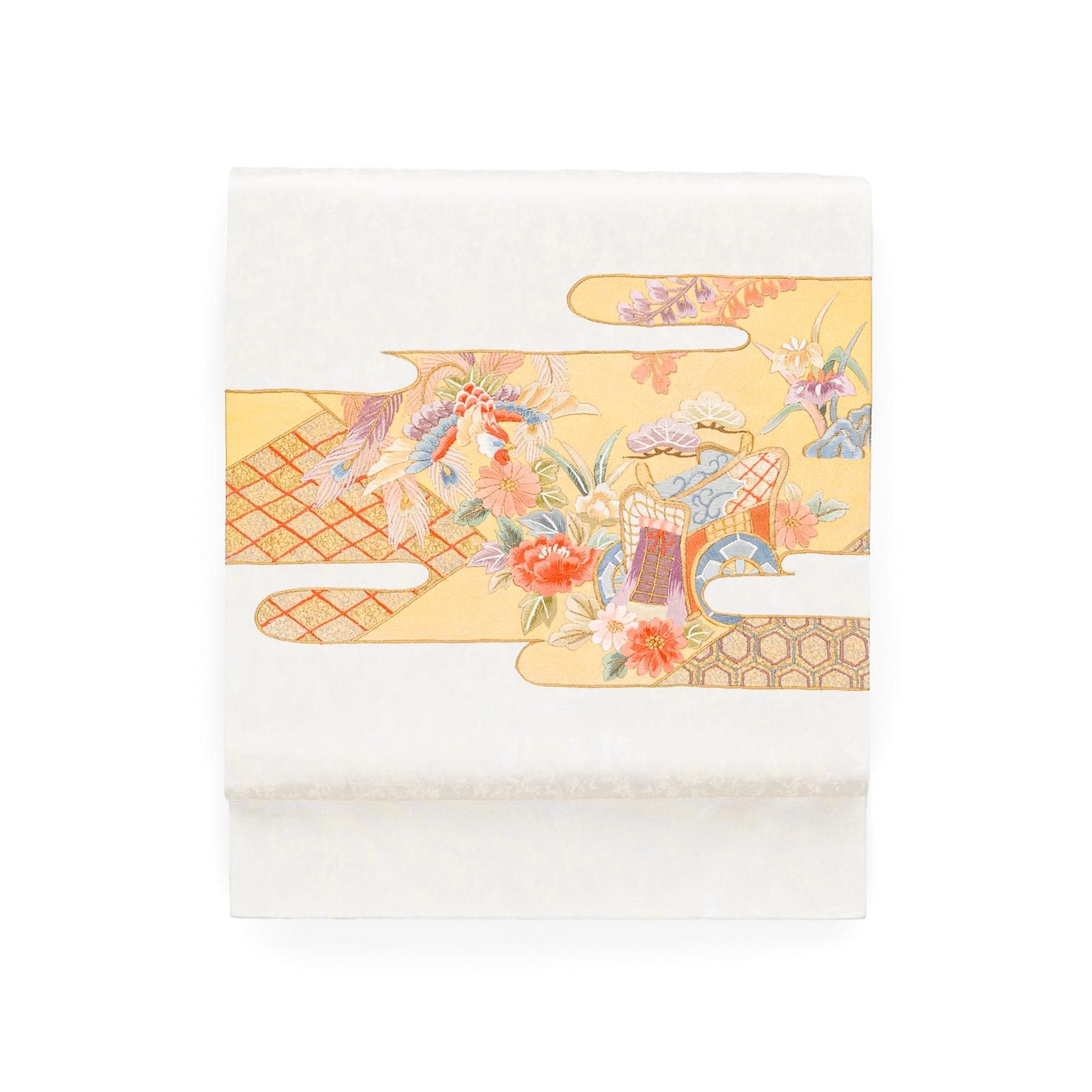 金の霞の中に華やかな御所車を刺繍した九寸名古屋帯です。