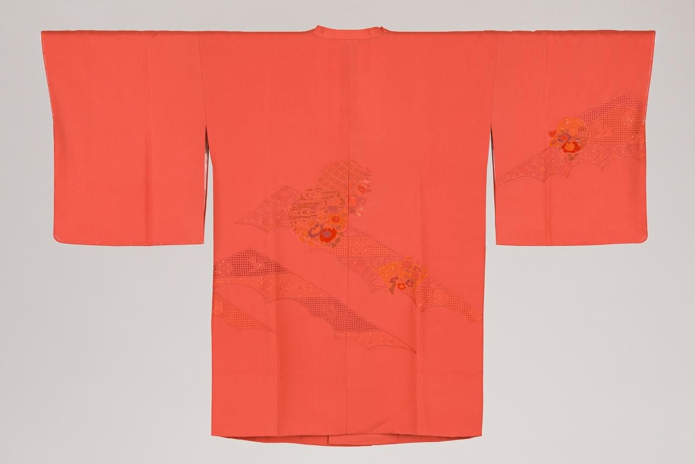 雪輪や地紙に花を添えた絵羽柄の道行コートです。