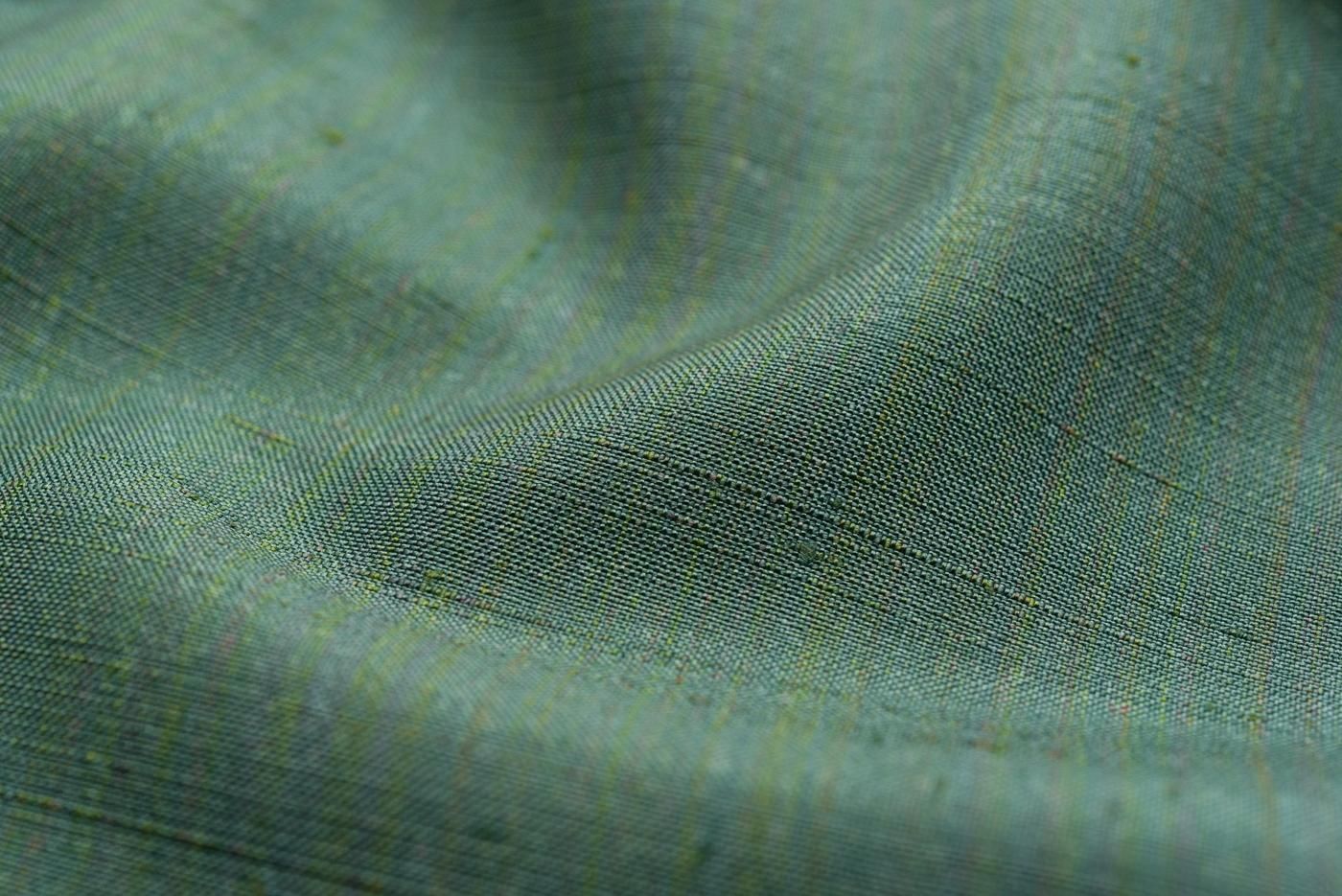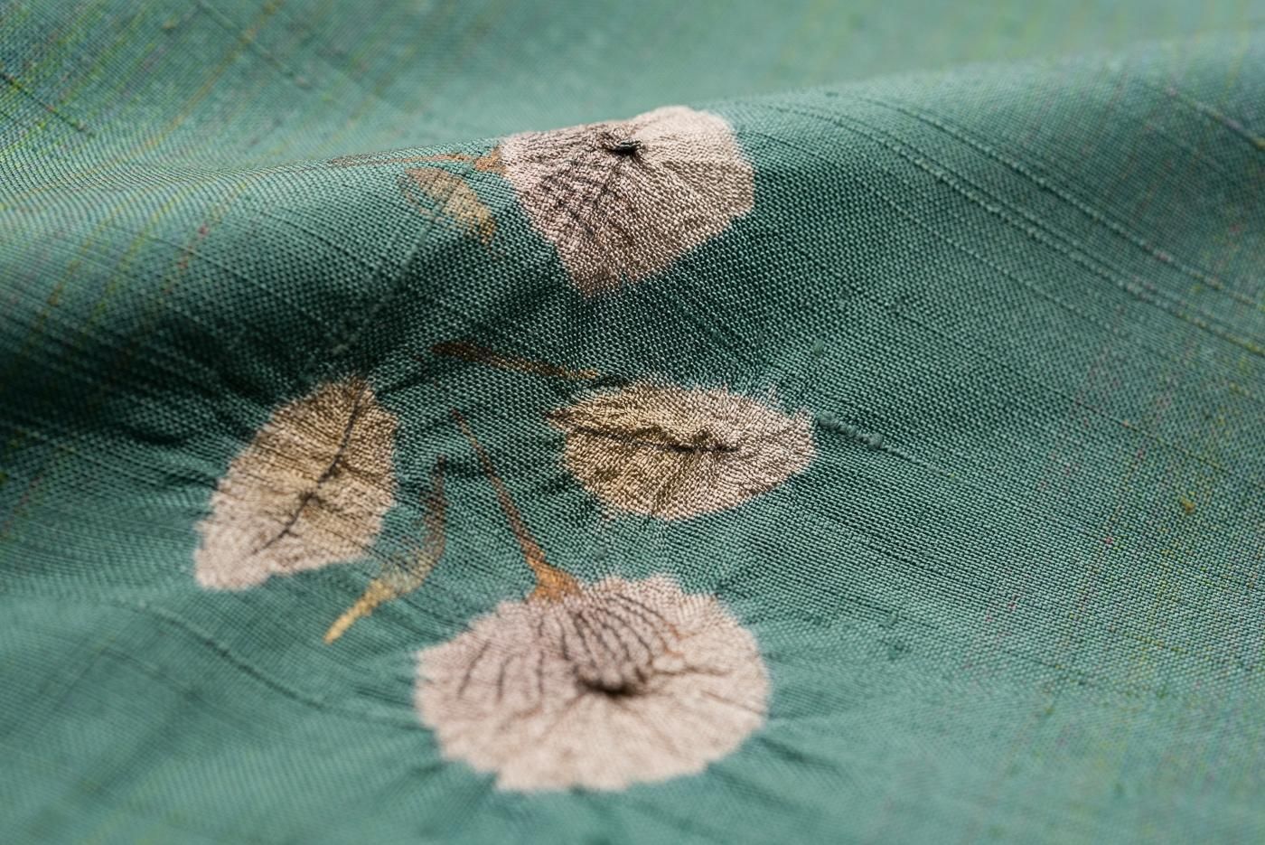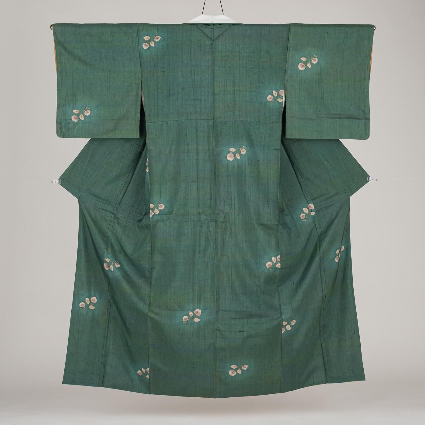 落ち着いた緑色の紬地にベージュのお花を絞り染した着物です。