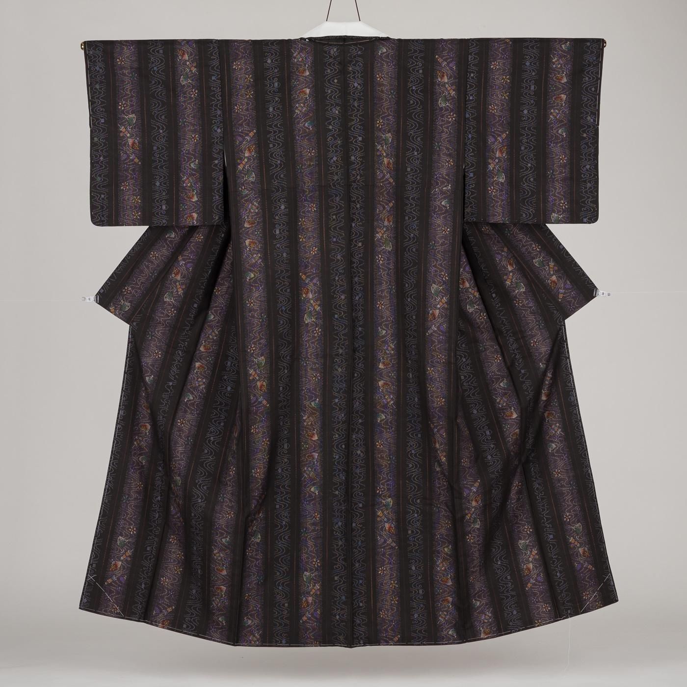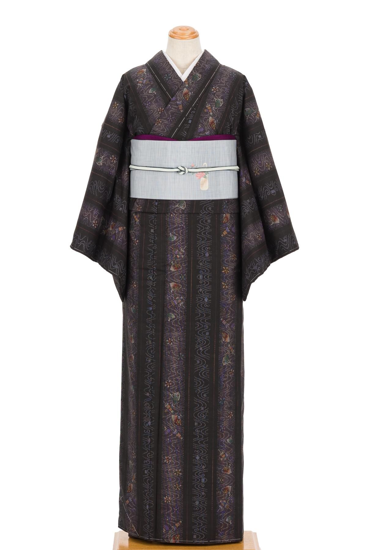 縞の中に番傘や扇を織り出した大島紬の着物です。